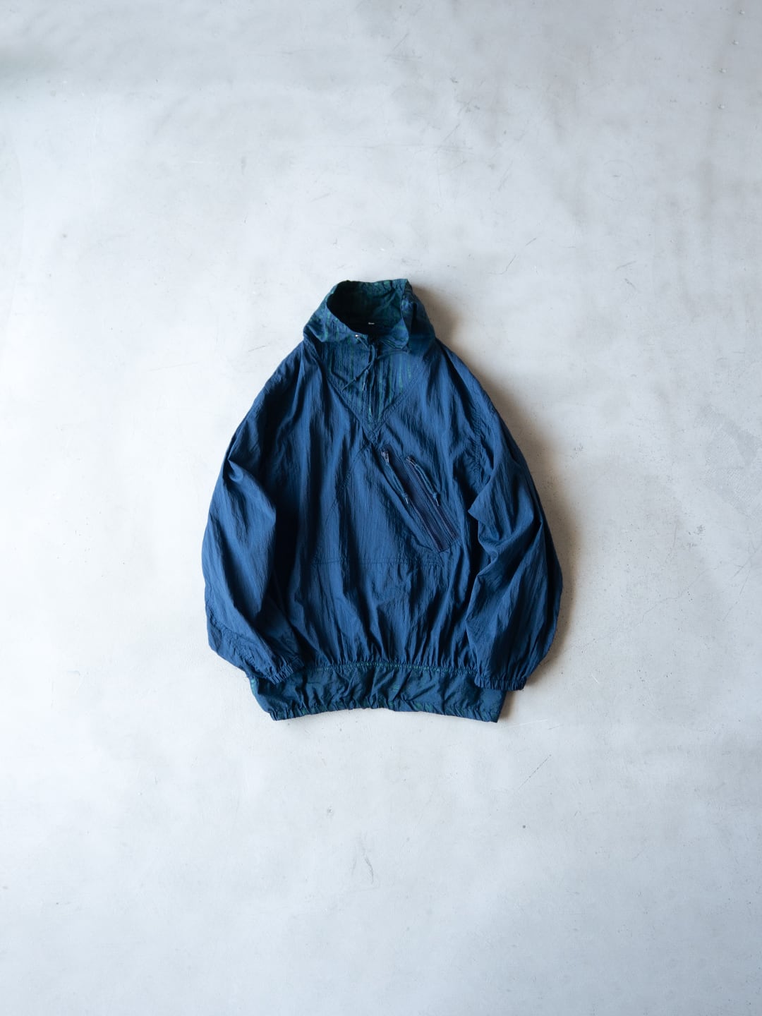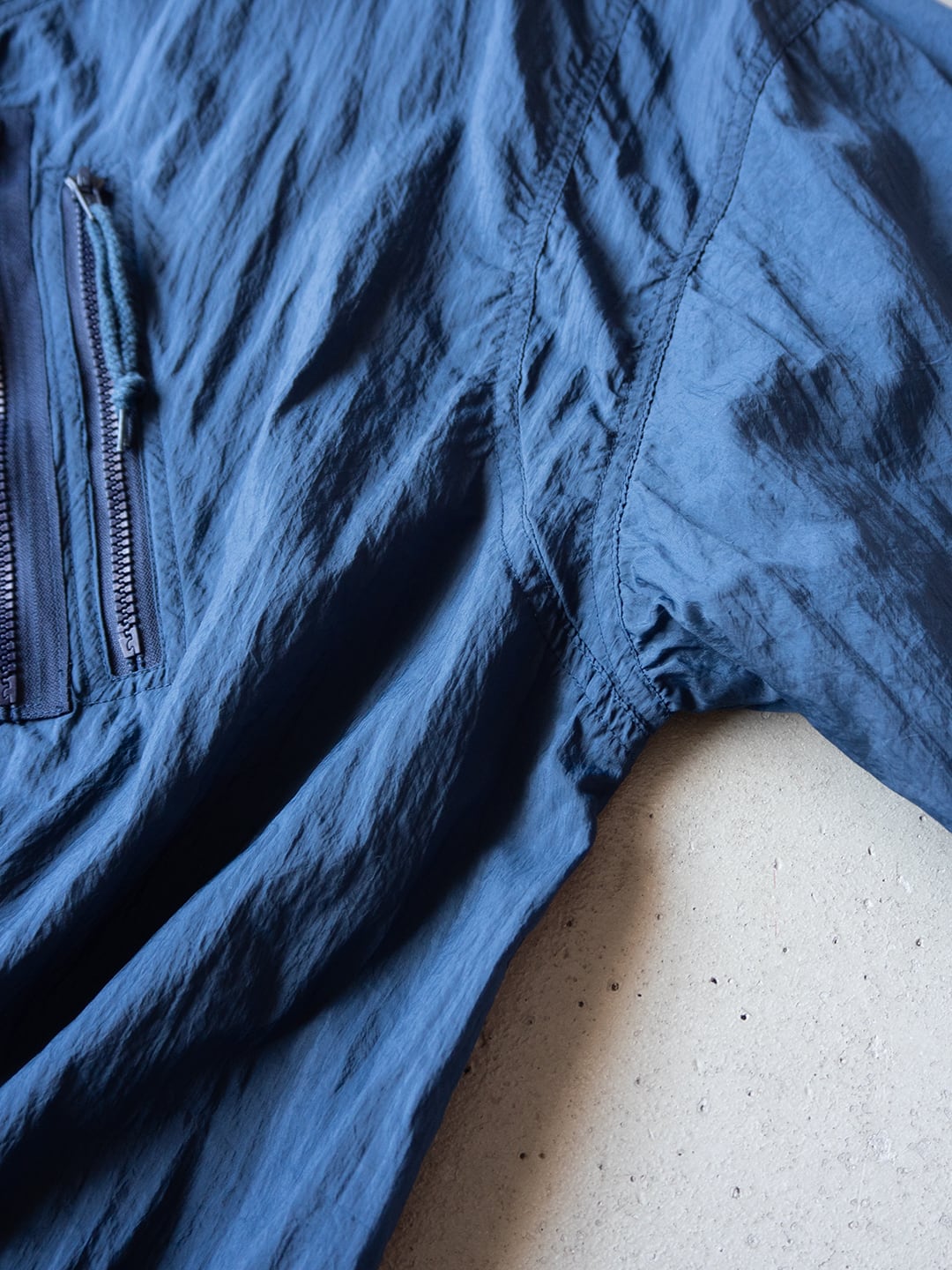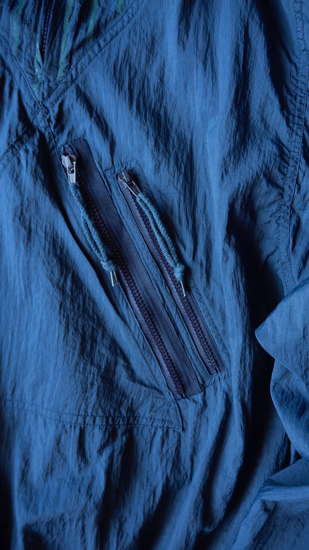 このトップスは、非常に軽量でしなやかなナイロン生地で仕立てられています。最大の特徴はパタンニングで、前身頃に備え付けられたジップポケットは、三角形の一辺を成すように付けれています。