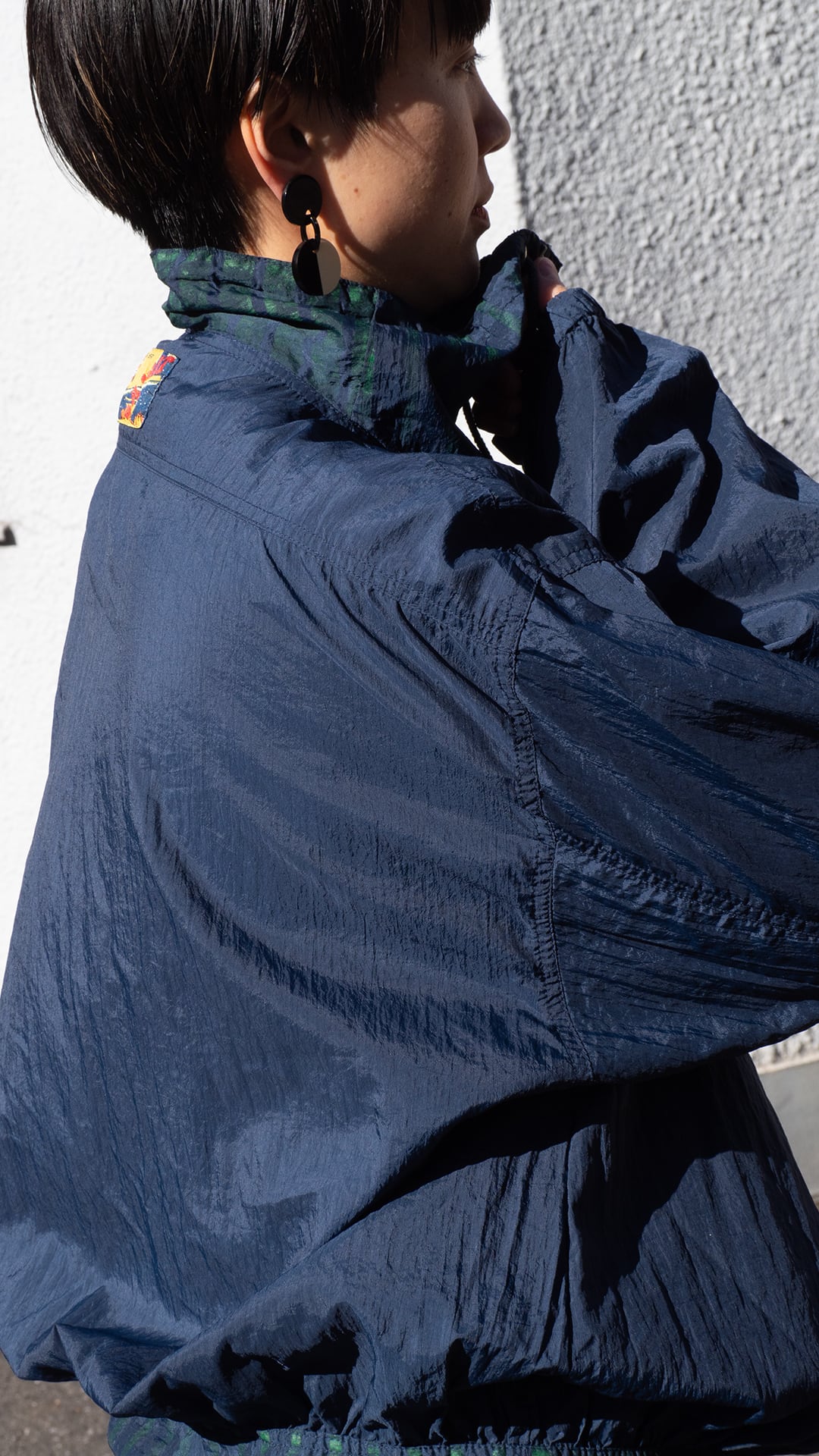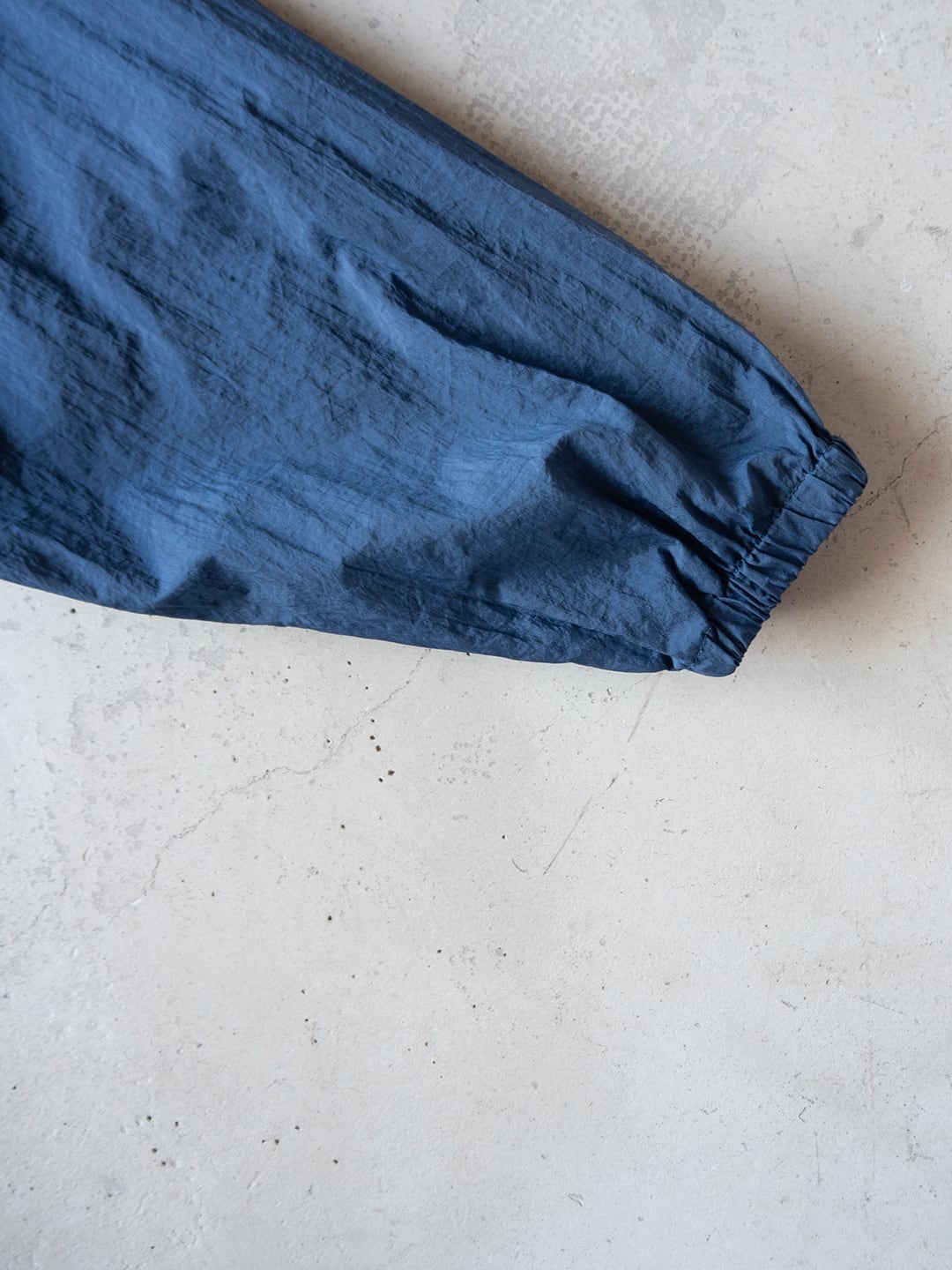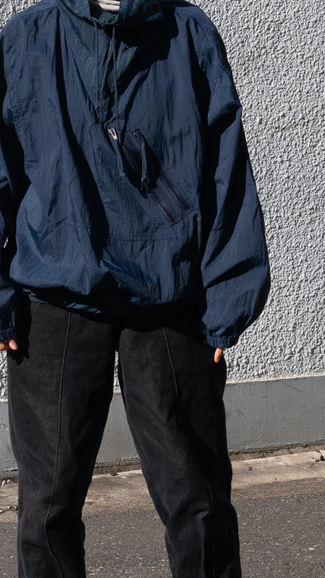このトップスは、非常に軽量でしなやかなナイロン生地で仕立てられています。最大の特徴はパタンニングで、前身頃に備え付けられたジップポケットは、三角形の一辺を成すように付けれています。