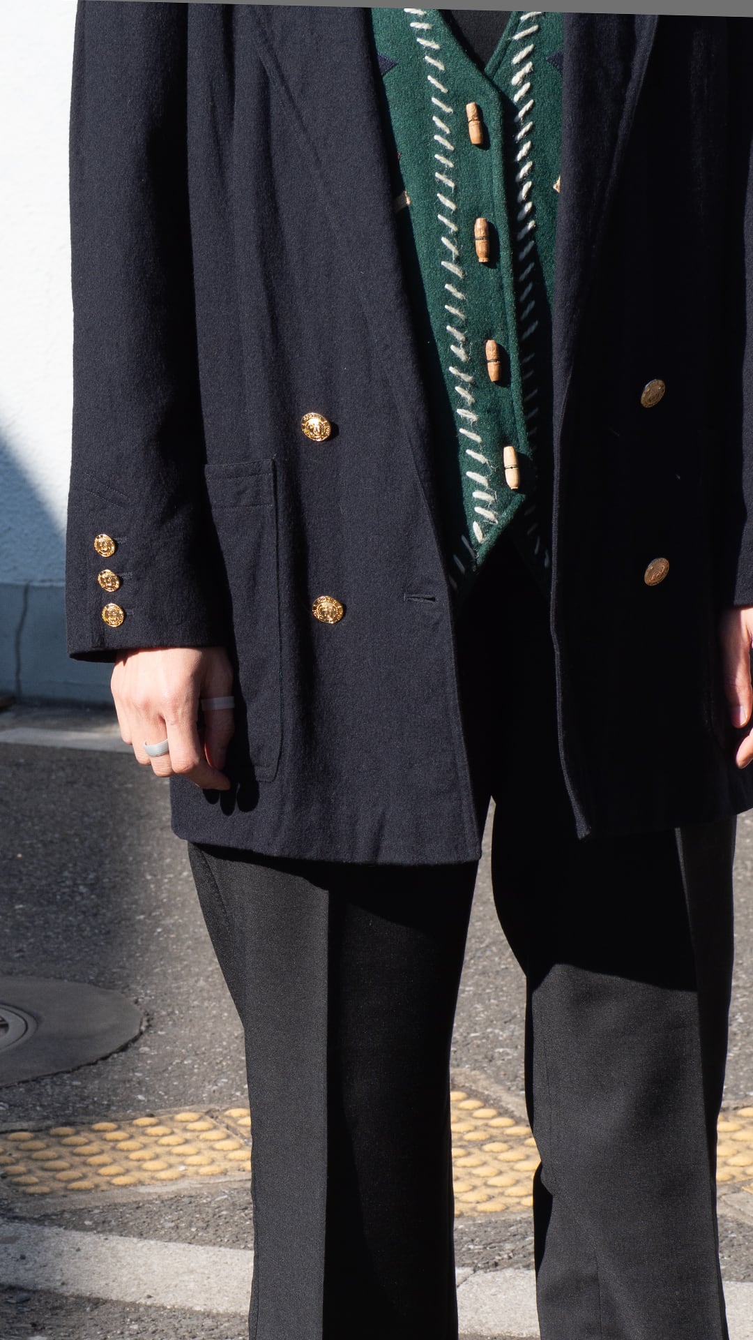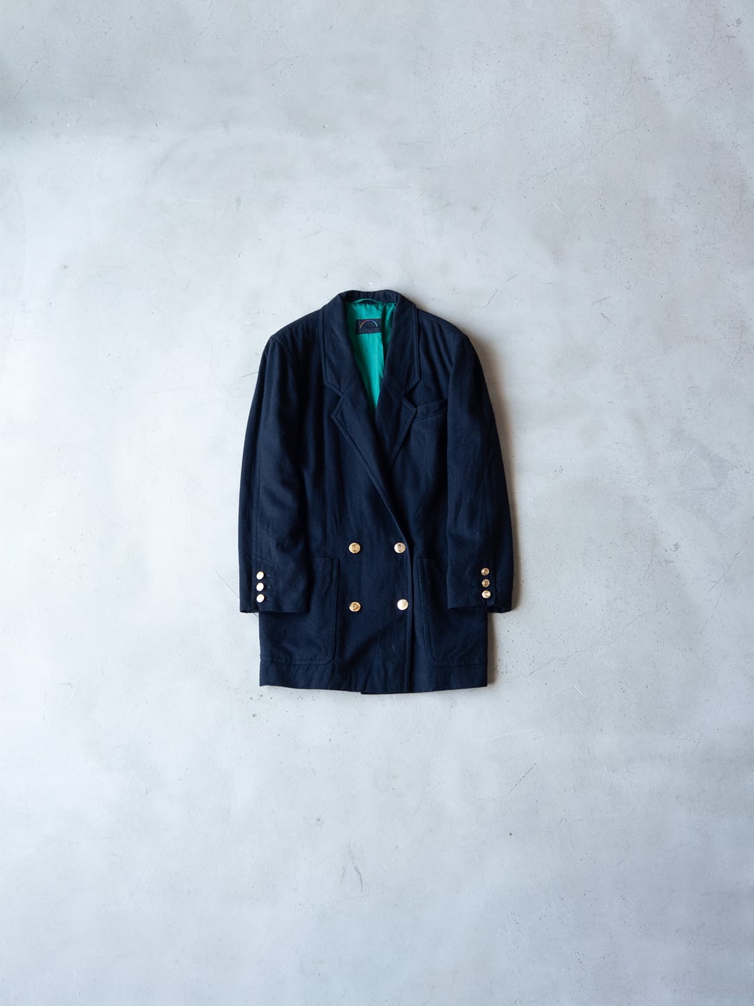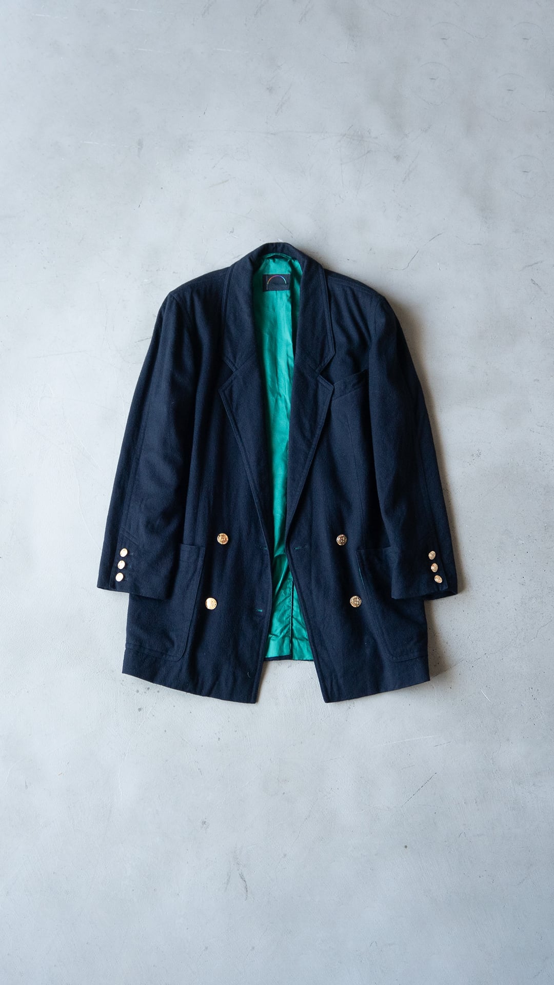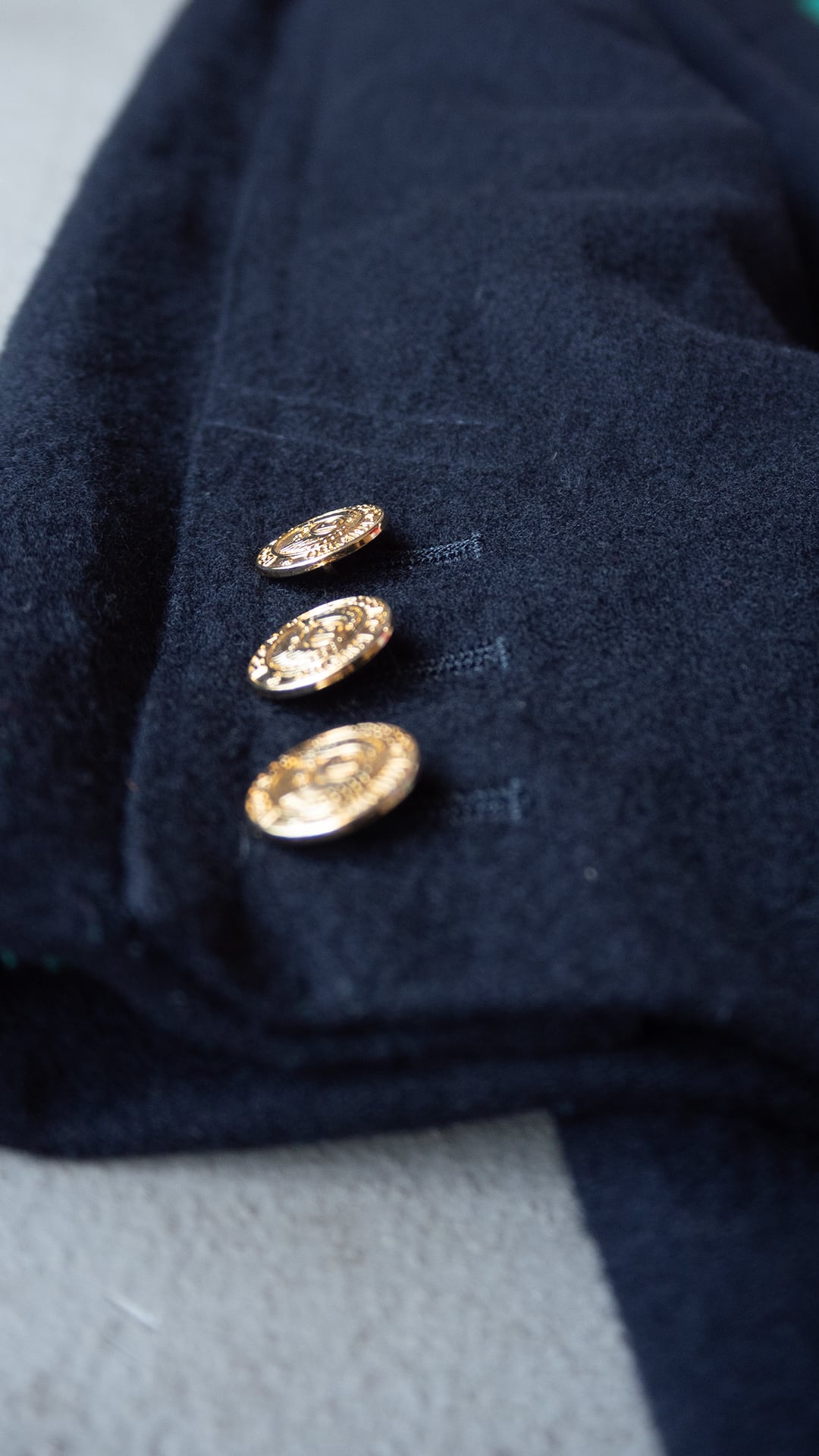 生地はブラック、裏地はグリーン、ダブルブレストでゴールドのメタルボタンという異質な組み合わせです。