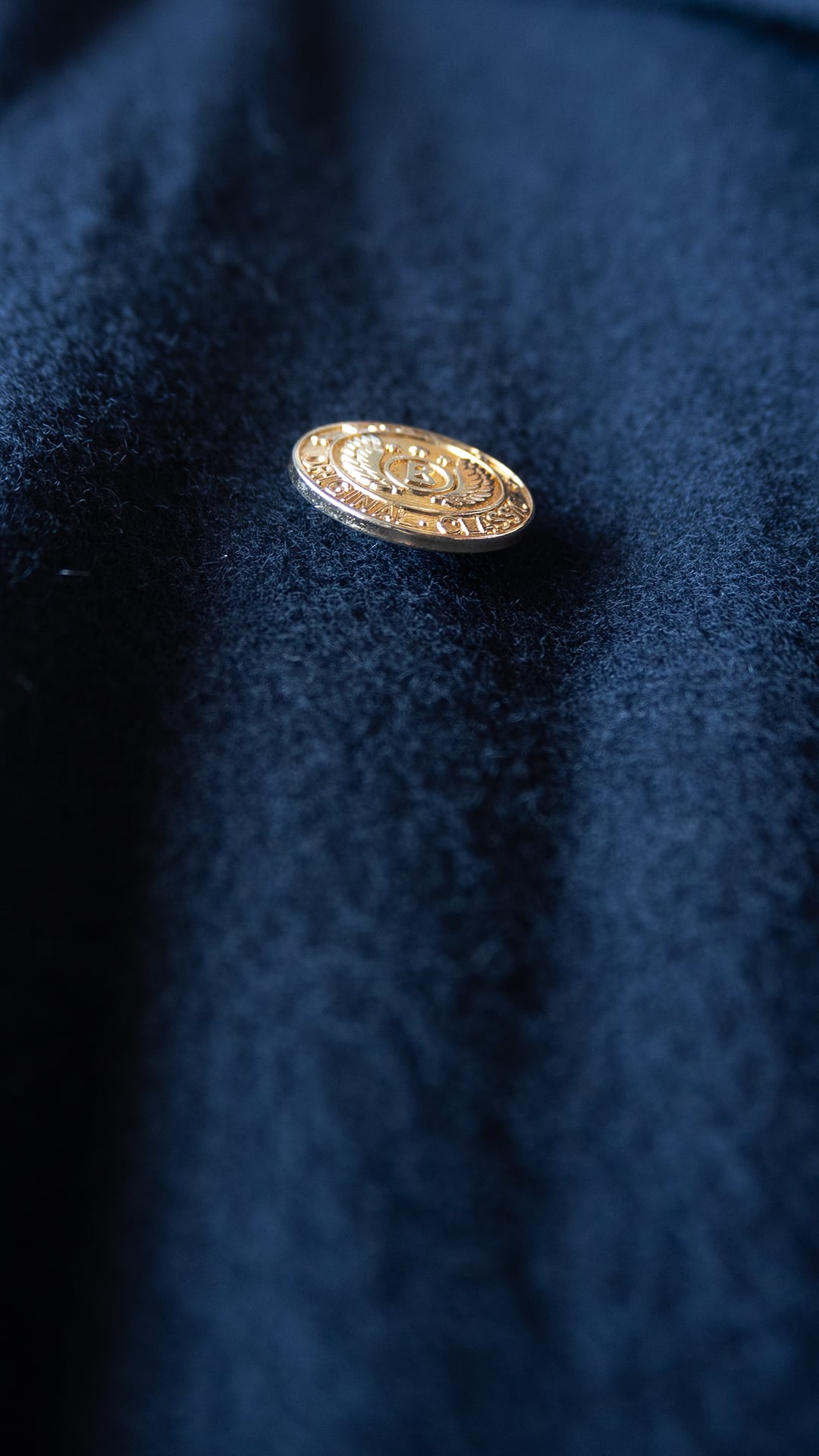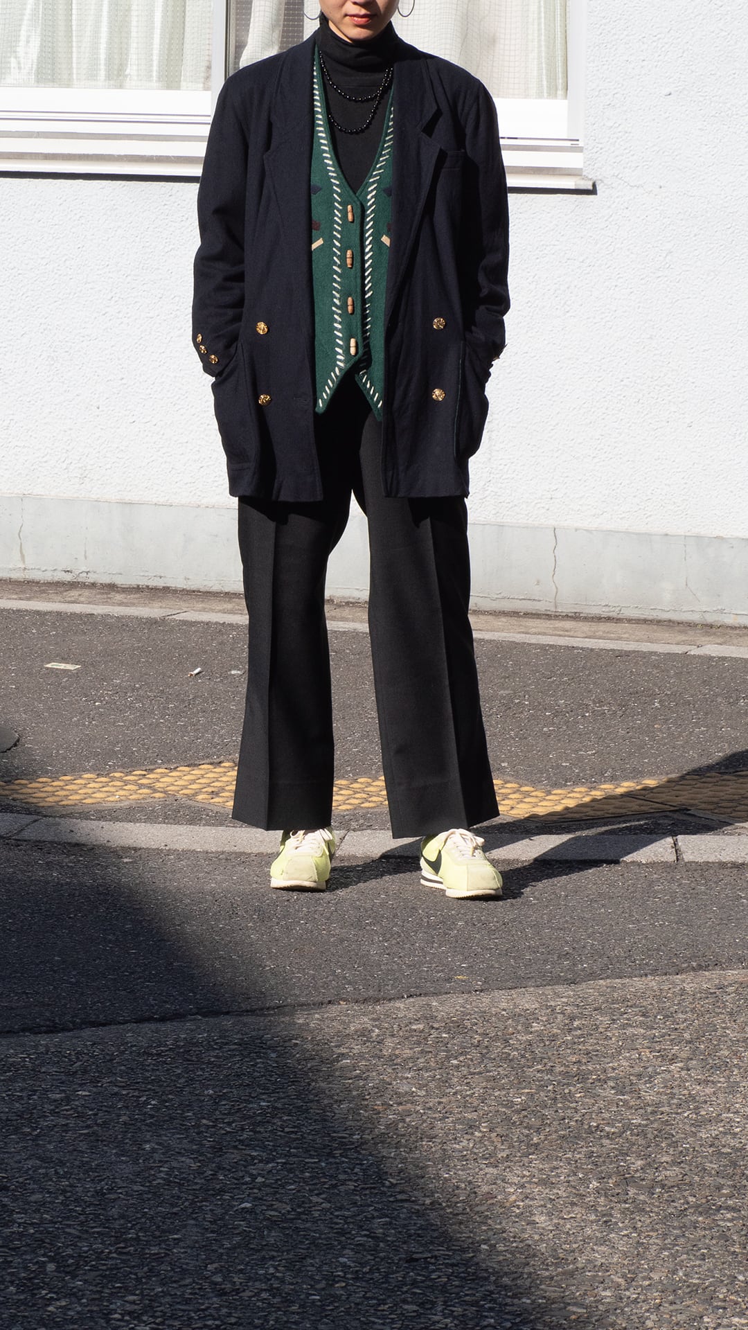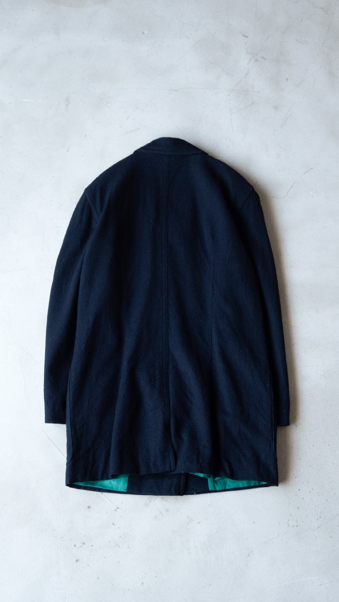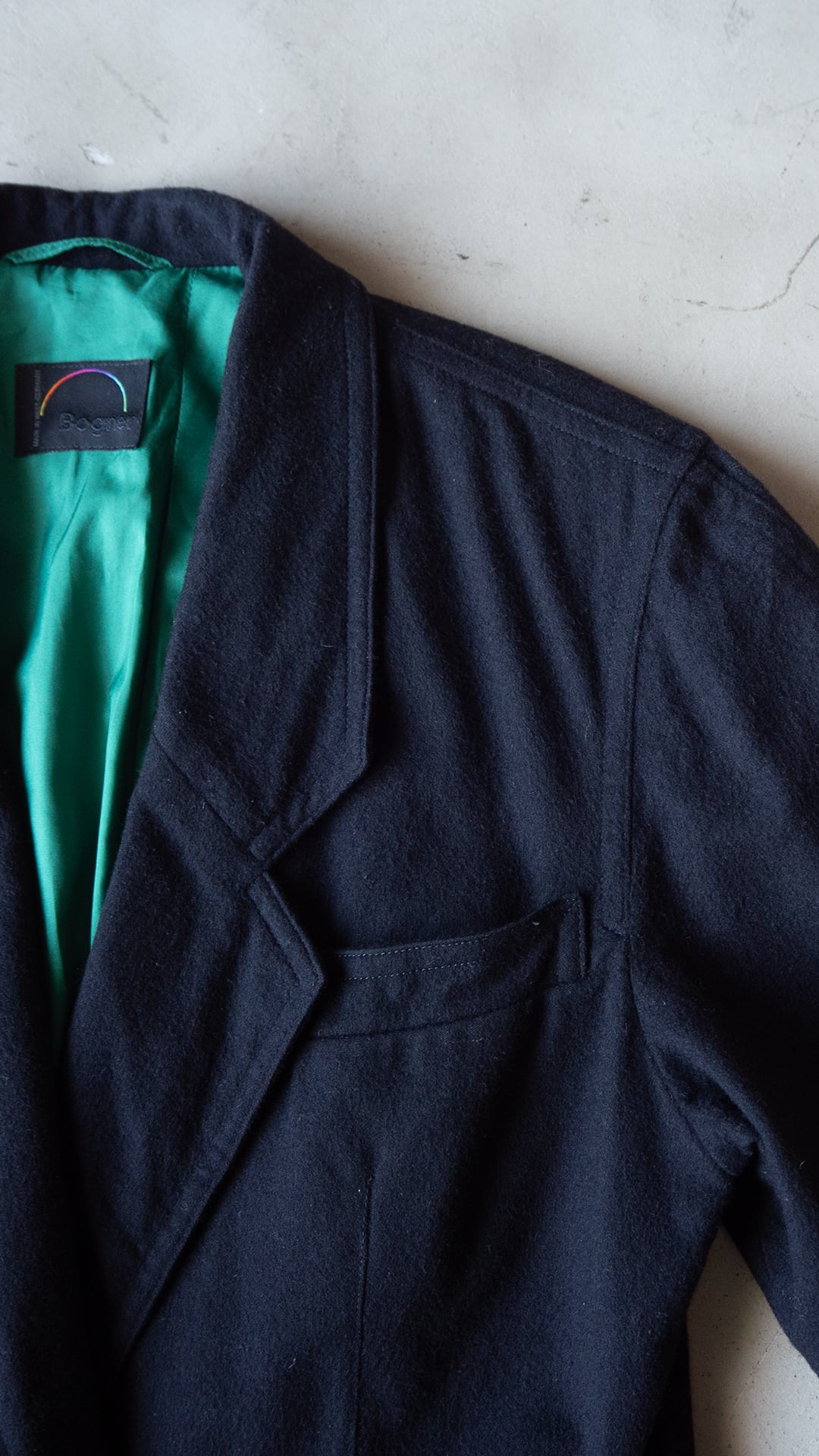 生地はブラック、裏地はグリーン、ダブルブレストでゴールドのメタルボタンという異質な組み合わせです。