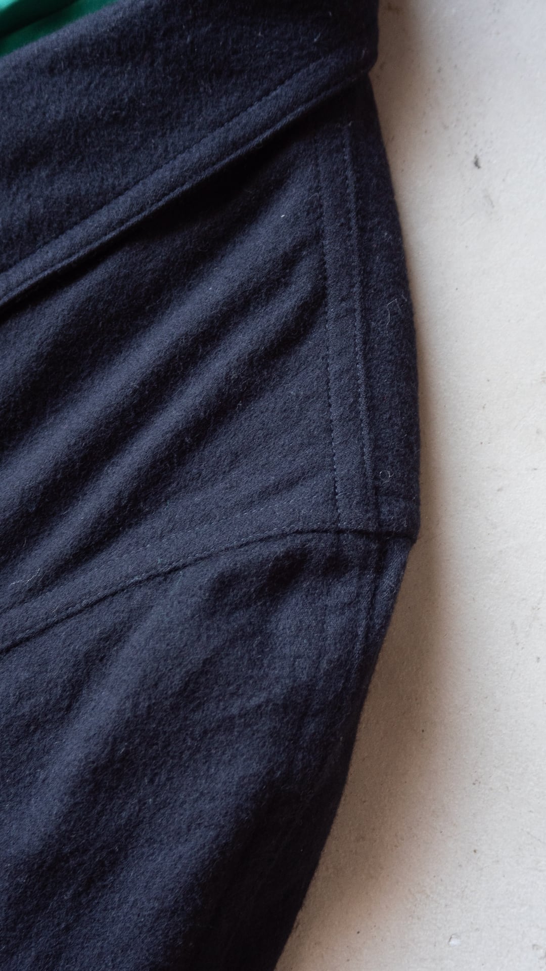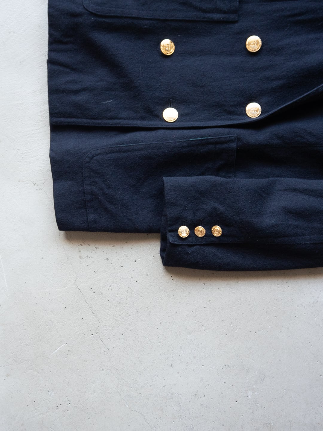 カシミヤウールと言う聞こえは高級感がありますが、ステッチワークはカジュアルにこなしてあり、全体的なダブルステッチや、ラペルやポケットのステッチ打ち込みが効いていると思います。