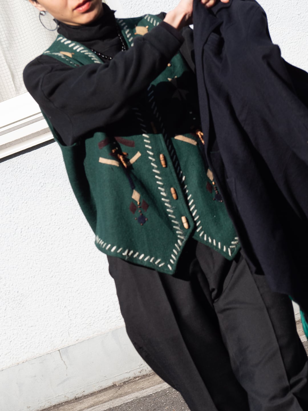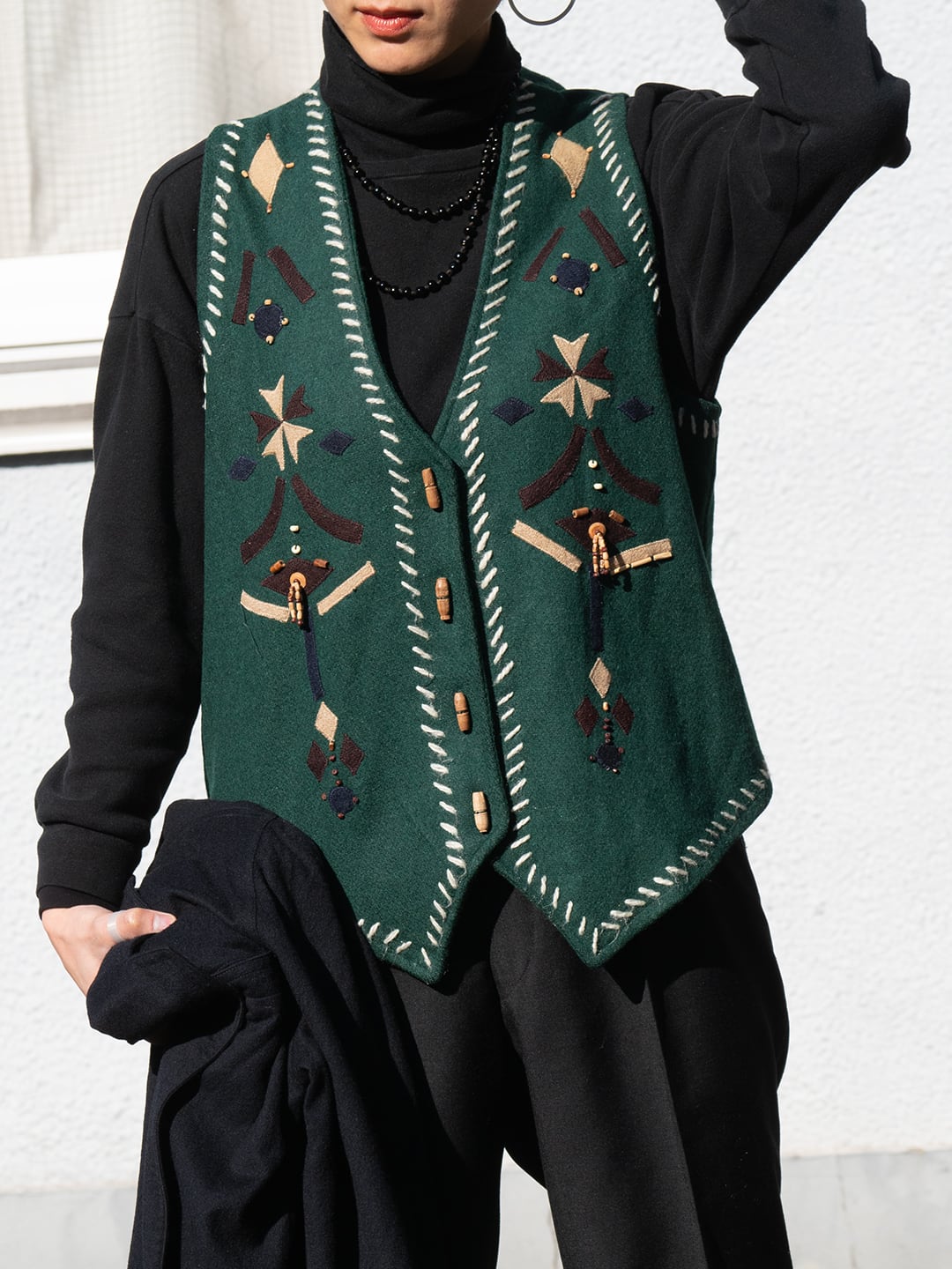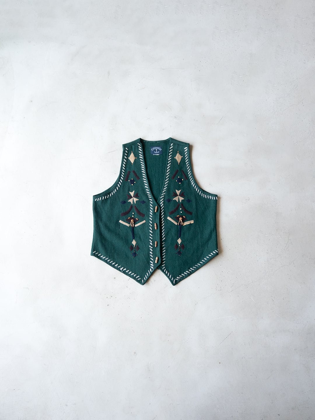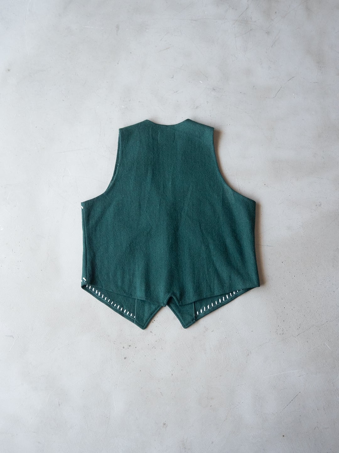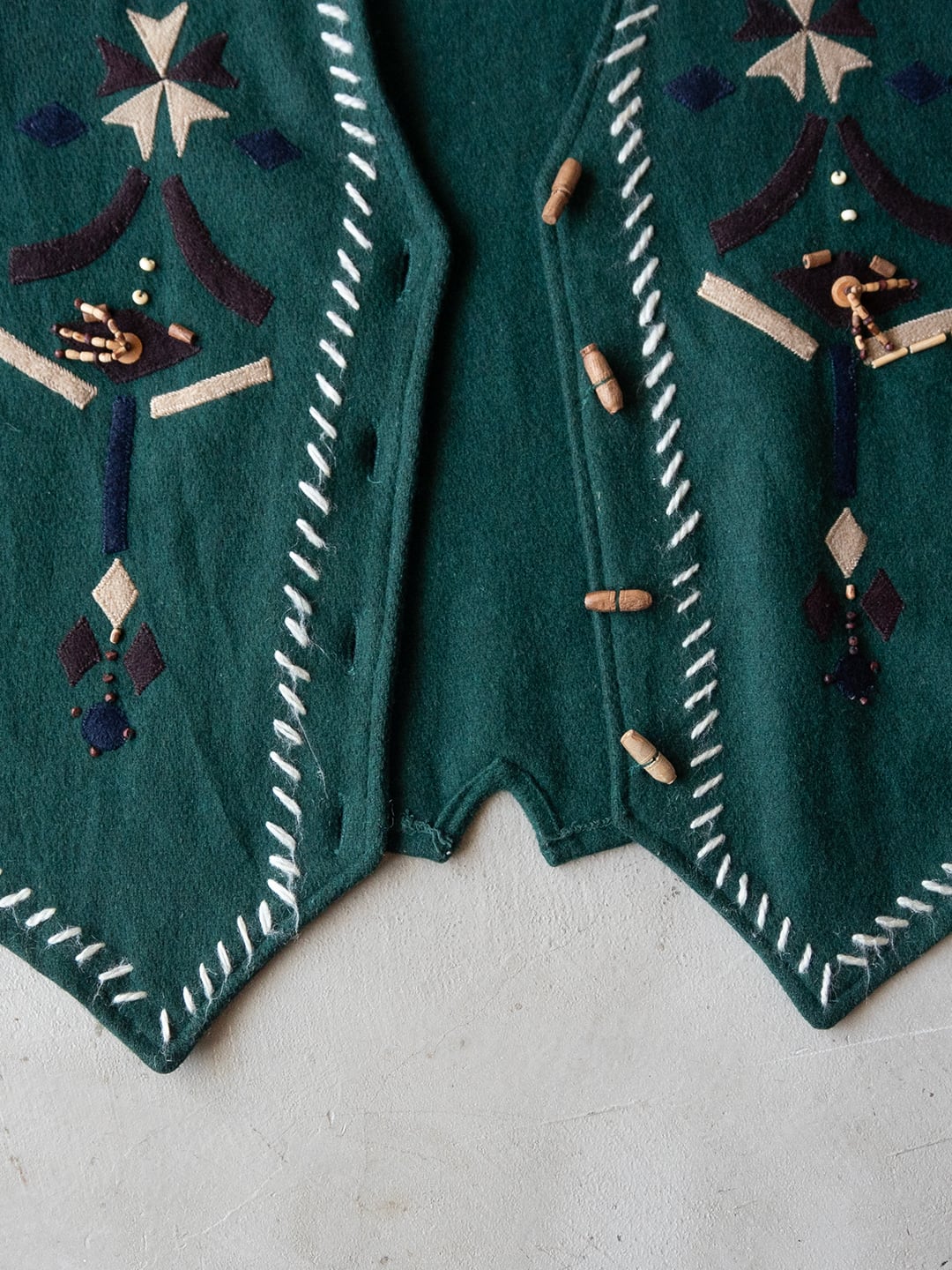 グリーンのウールフェルト生地を用いた、デコラティブなディテールが愛らしいベストです。