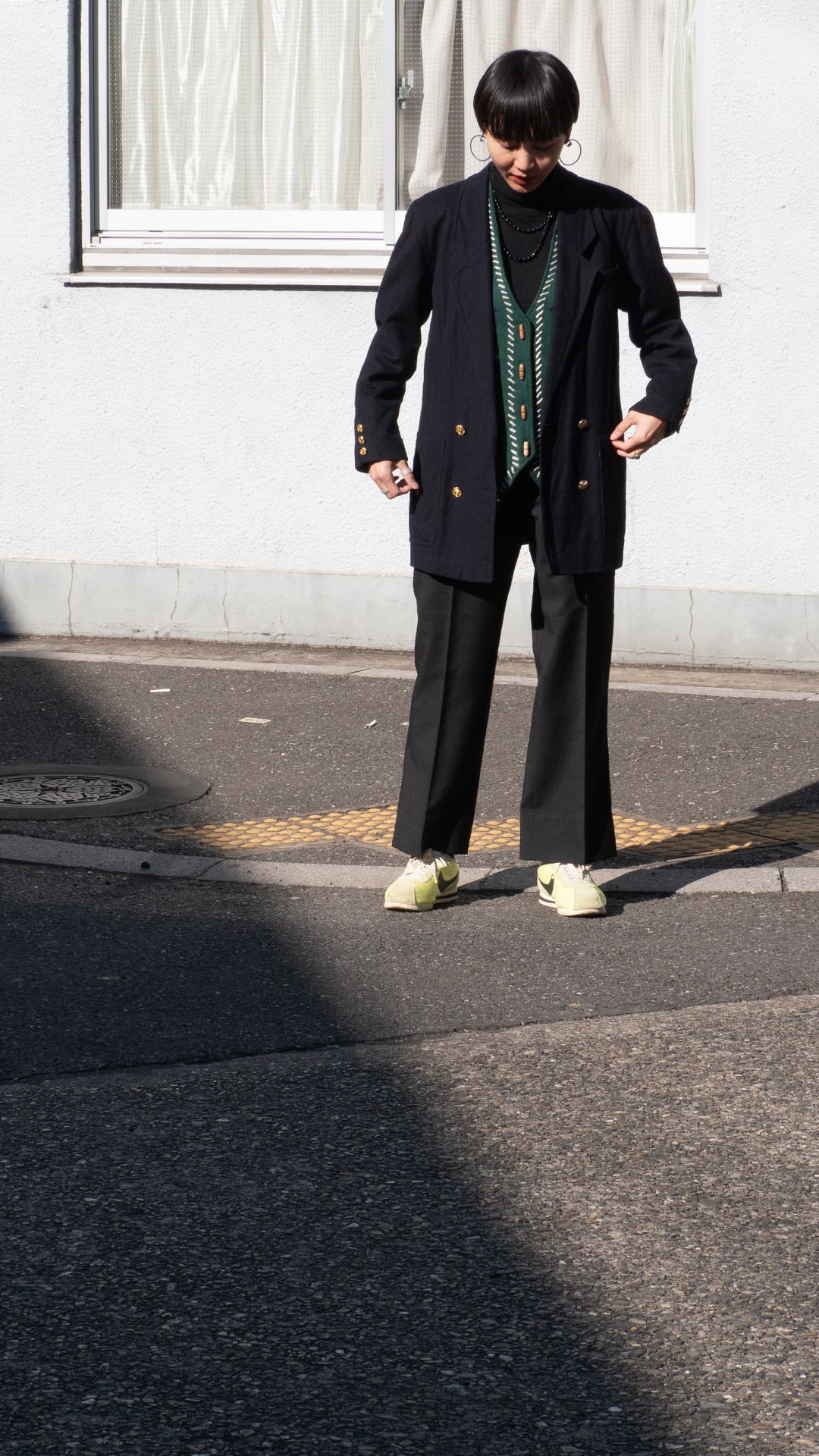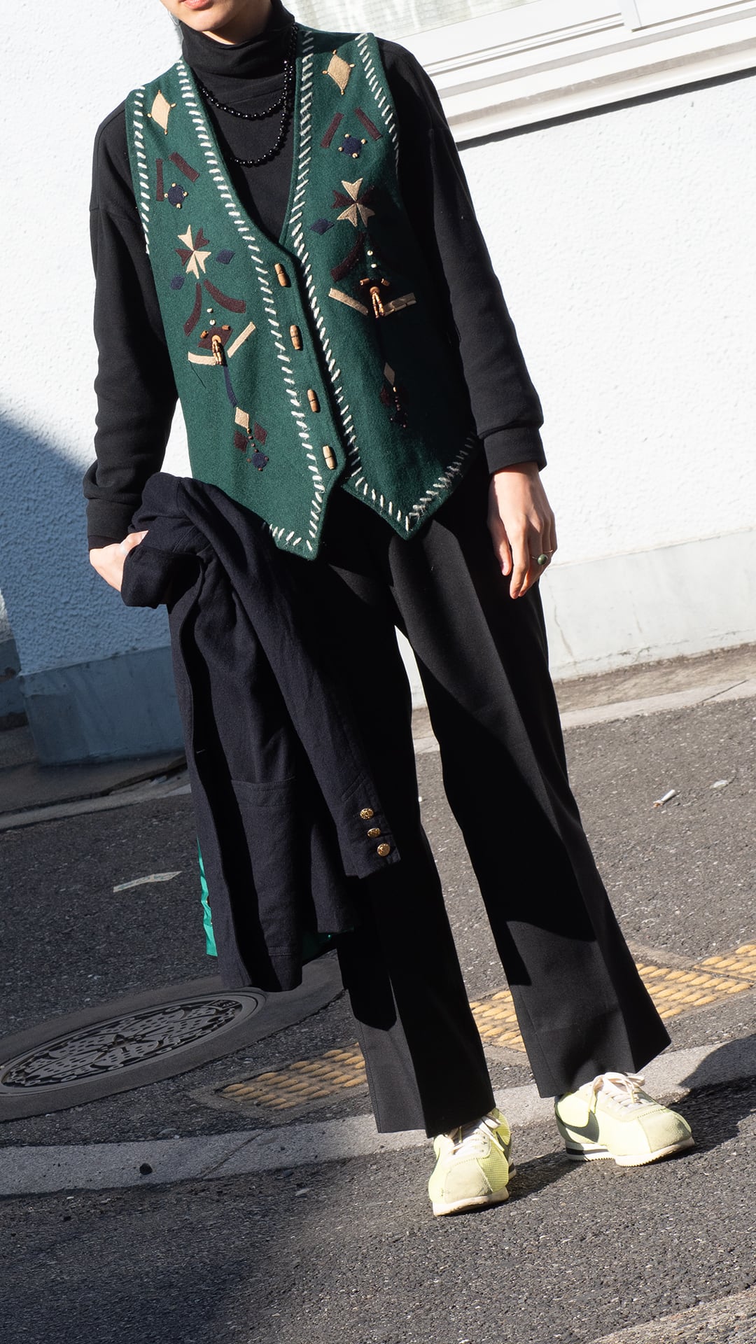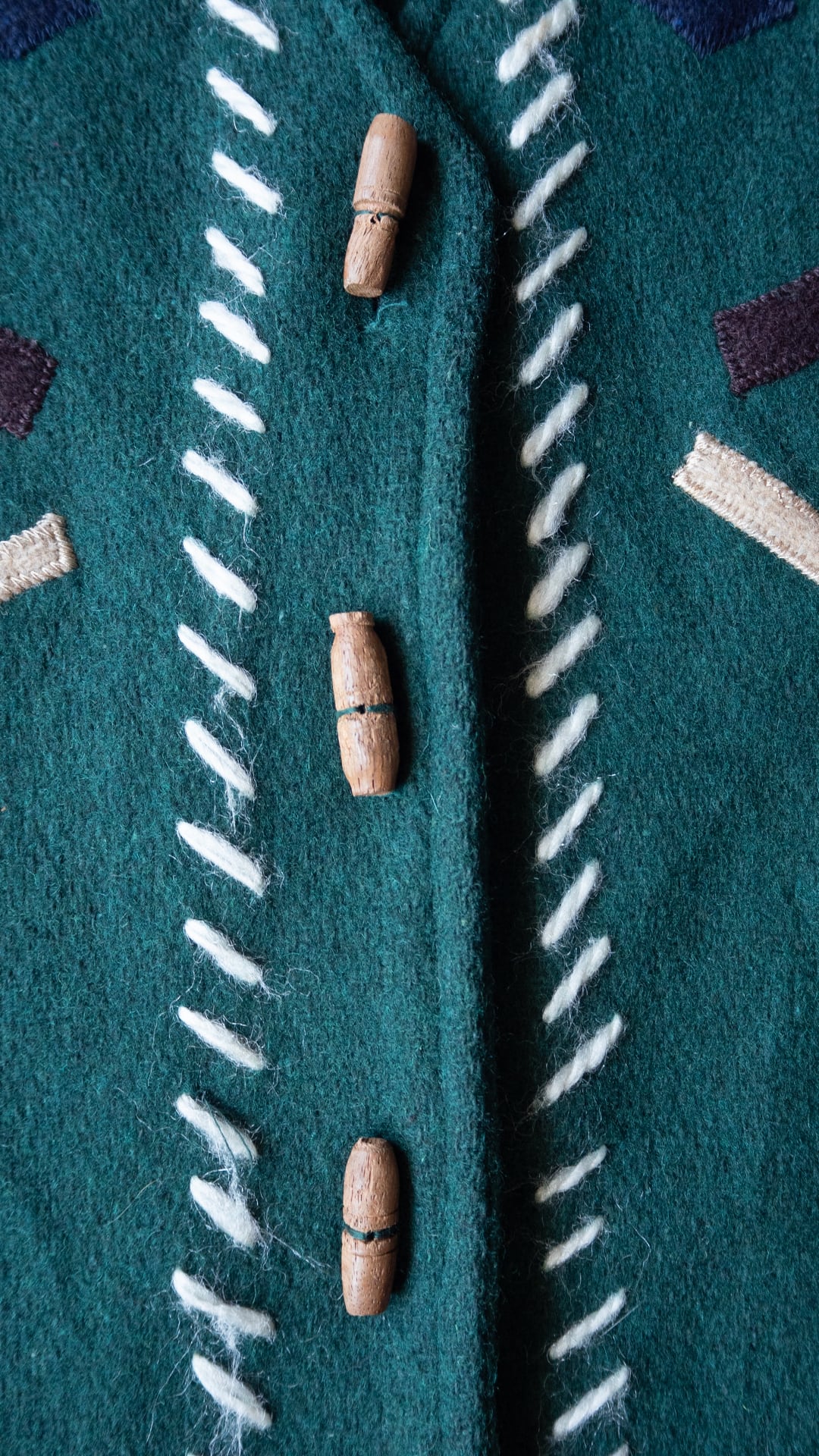前身頃には端に白いアクリル糸のステッチがデザインされていて、民族的な印象の装飾の中に、モダンさをミックスしたような斜線ラインがとてもセンス良く感じました。
