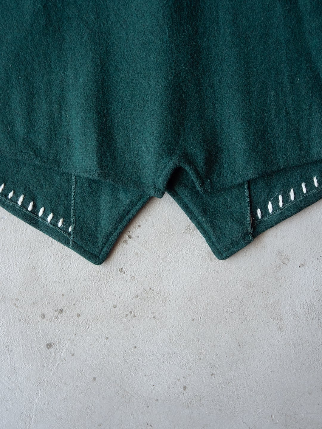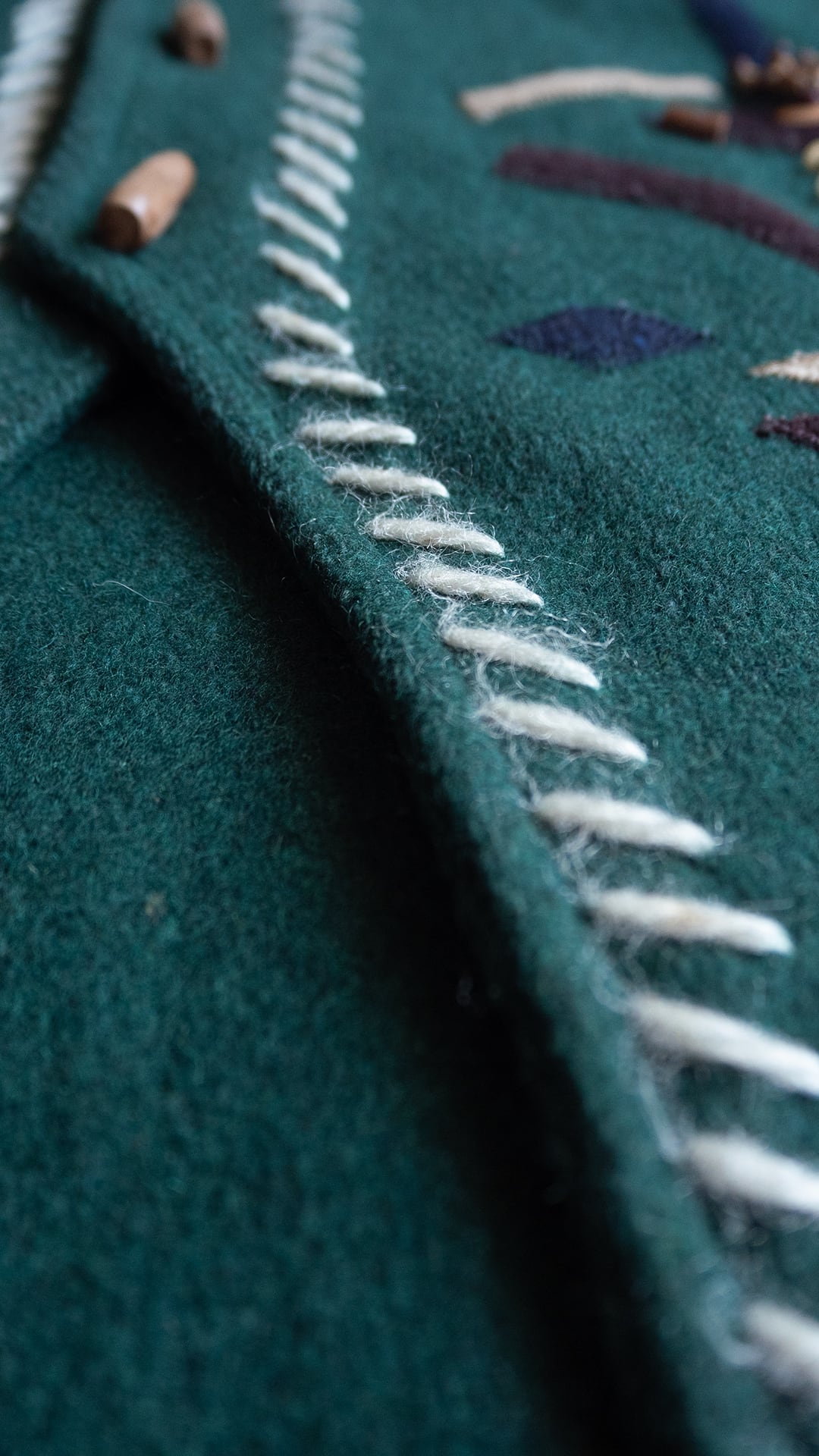 ベース生地はダークグリーンのウール生地で、中肉厚の一枚仕立て。