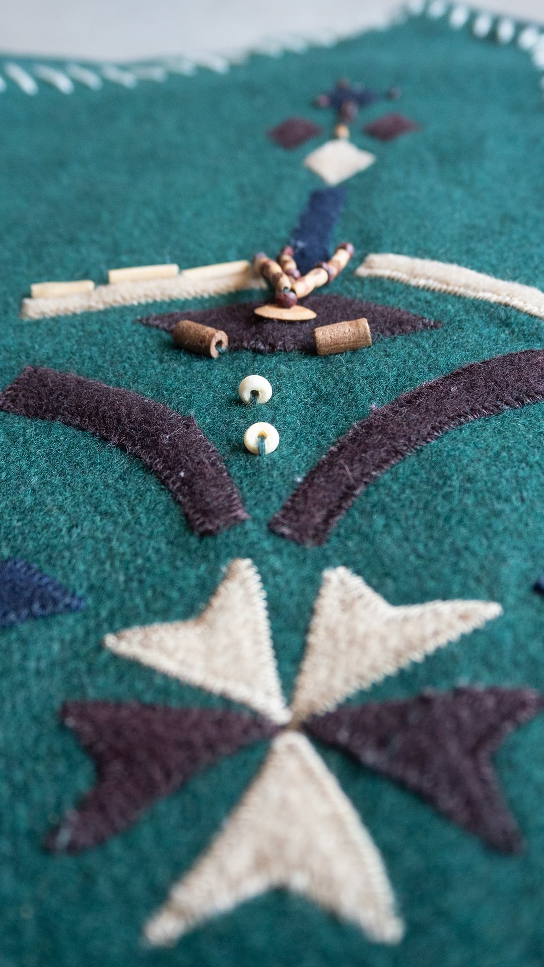 ネイビーやブラウンのフェルト装飾に加え、木製ビーズやボタンといったパーツが付属しています。