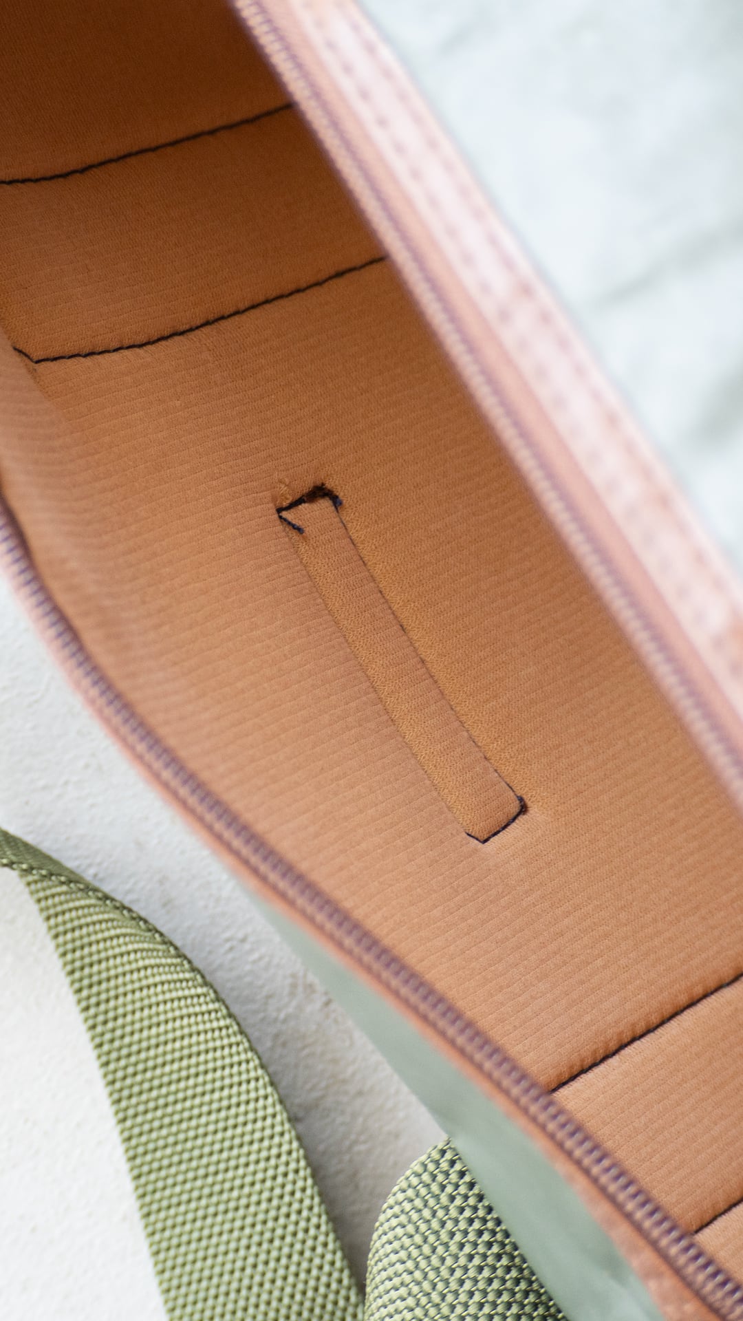 何か特定の目的のために作られたバッグかもしれませんが、もし普段使いでも、このデザインであればカジュアルな恰好に馴染みますし、このクッション材は重宝すると思います。