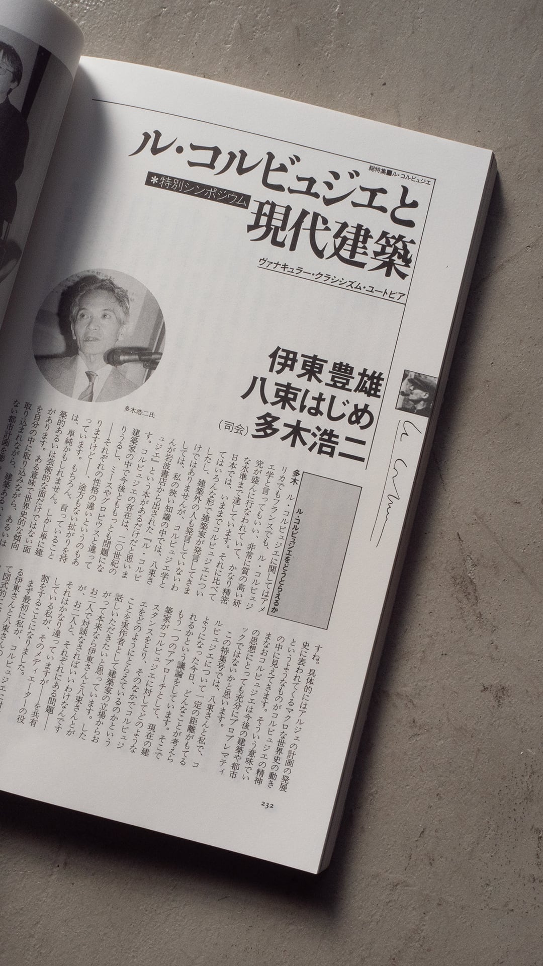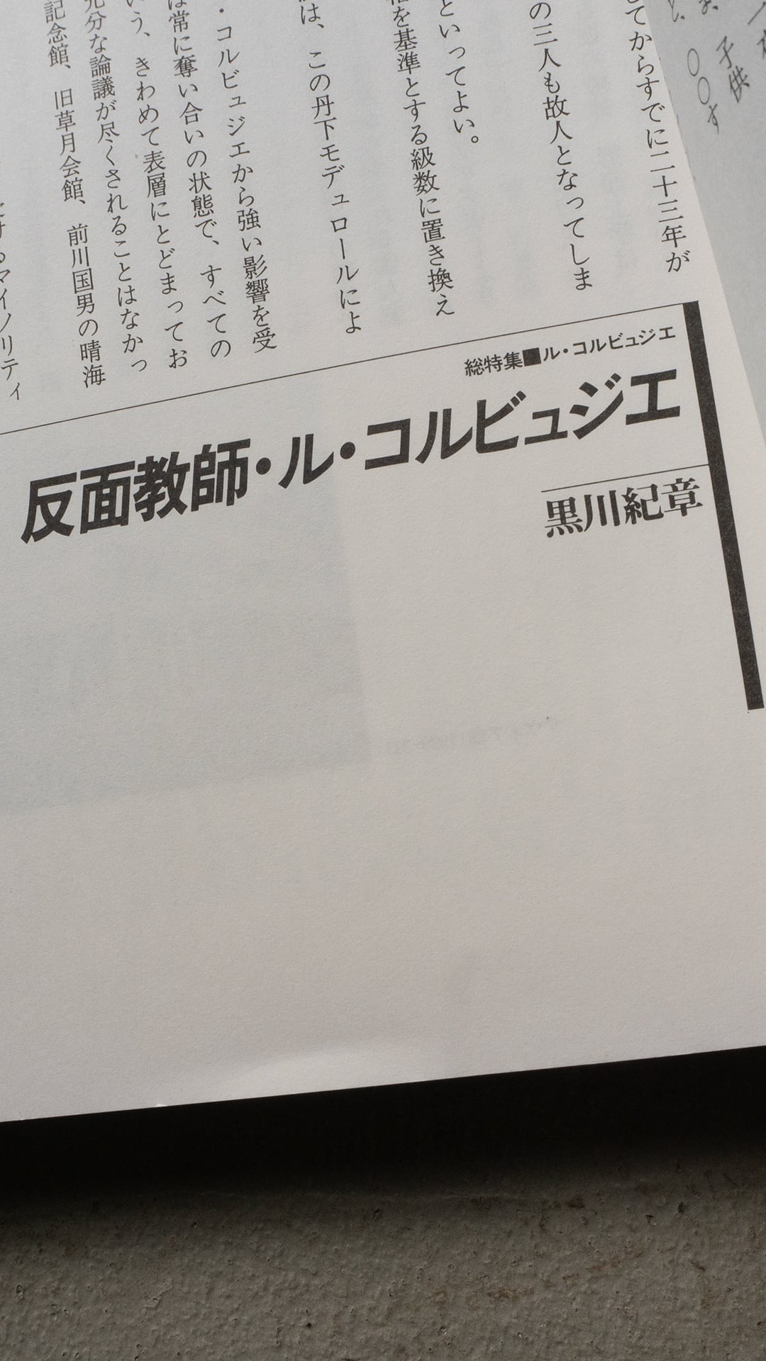 本誌は、ル・コルビュジエとその時代、日常の中のル・コルビュジエ、など国内外の著者によるエッセイや、〈ル・コルビュジエ〉 とはなにか? 現時点のとらえ方の枠組をめぐって(=多木浩二+八束はじめ)、反面教師・ル・コルビュジエ(=黒川紀章)などタイトル通り、建築家ル・コルビュジエについての随筆が並ぶ特集誌です。