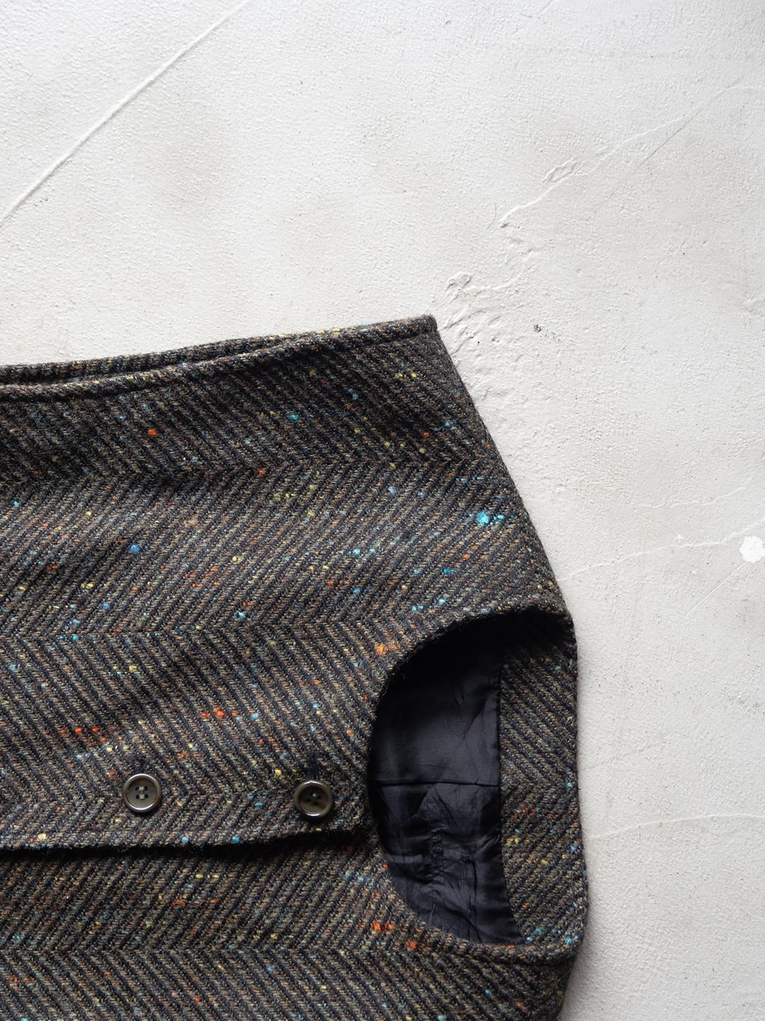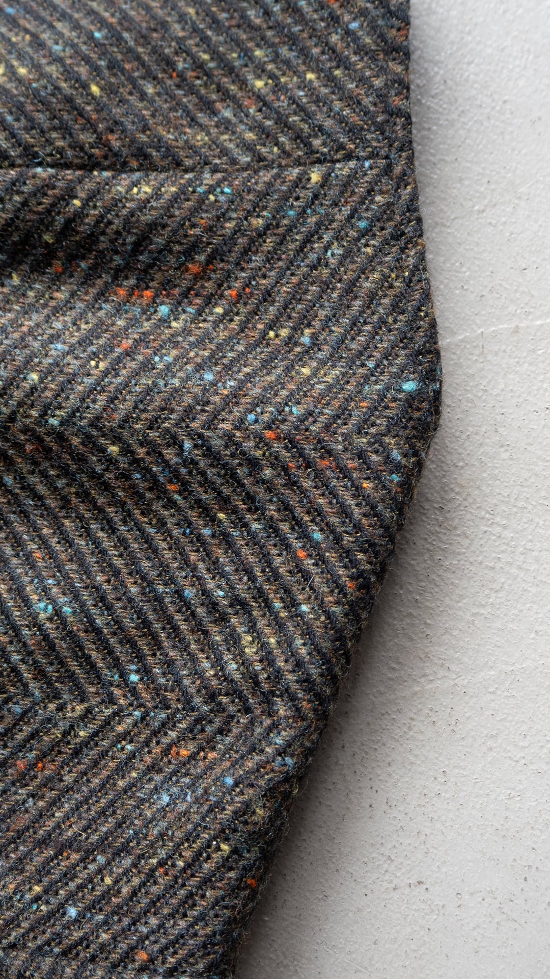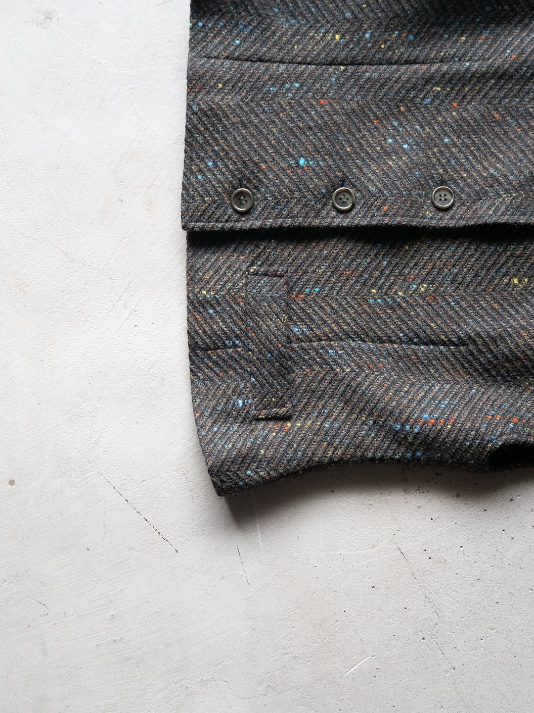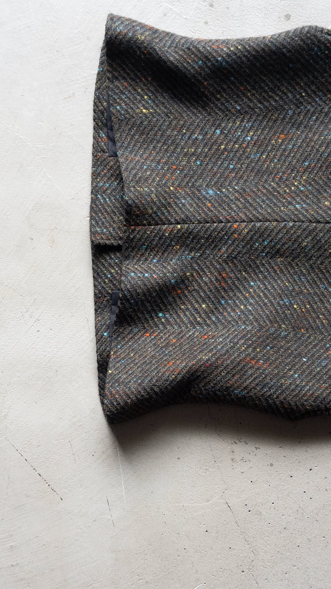 素材のベースはウールだと思われますが、カラーネップが複数色混じっていることから化学繊維もミックスした、幅広いコースのヘリンボンツイードです。