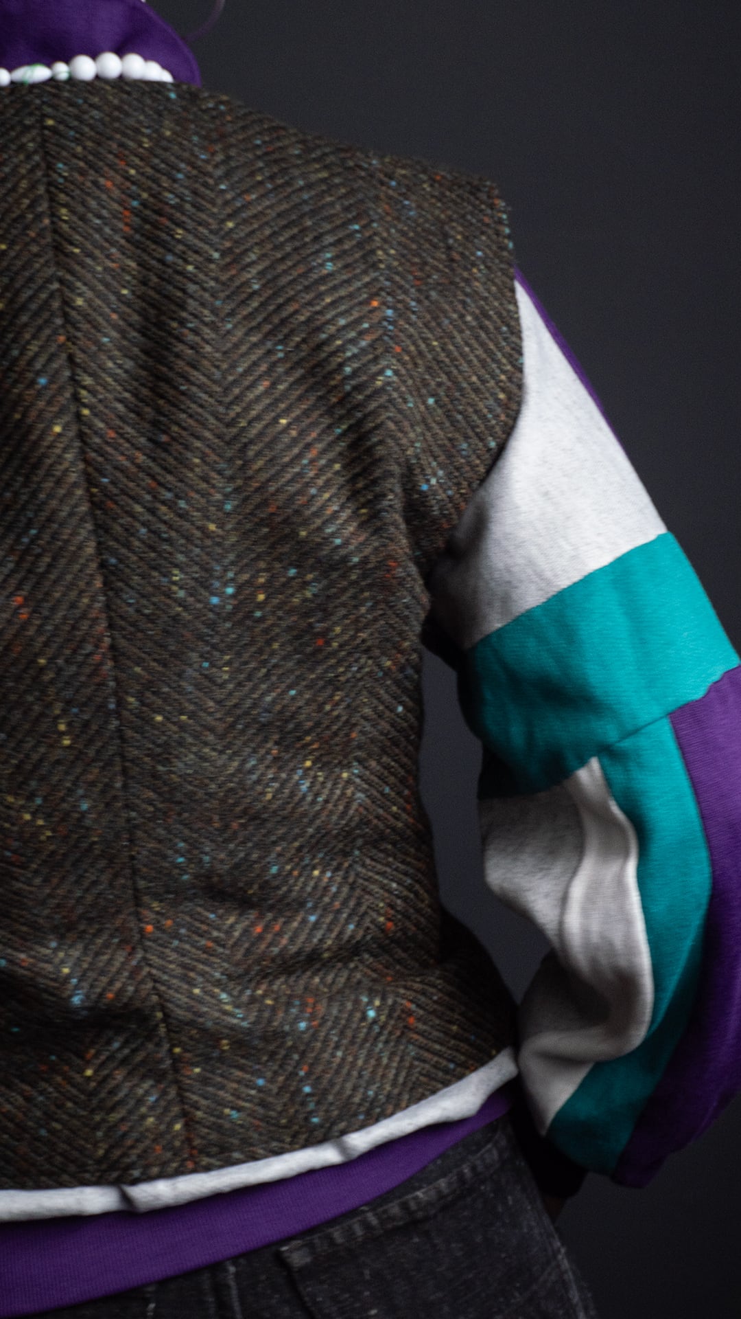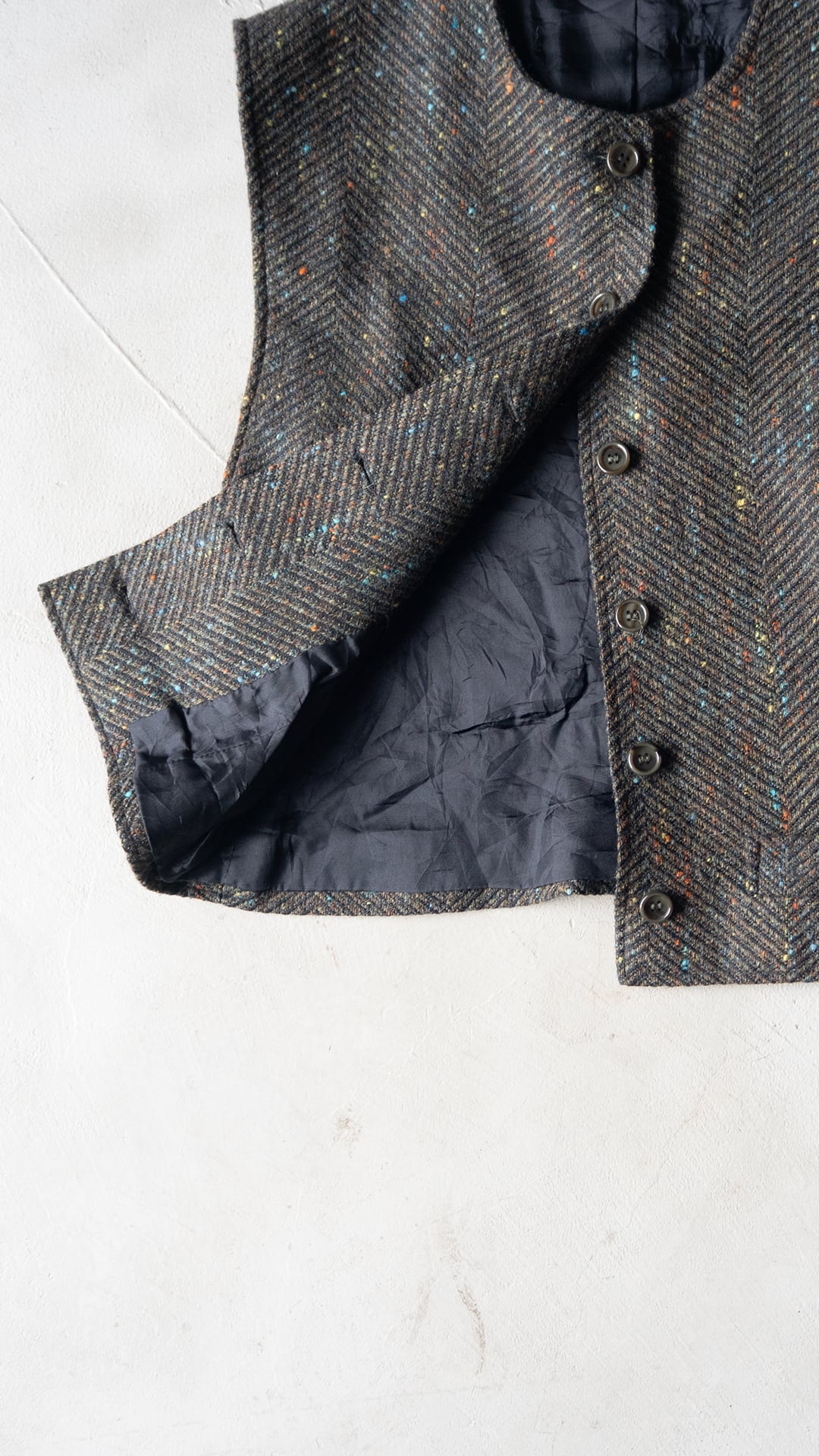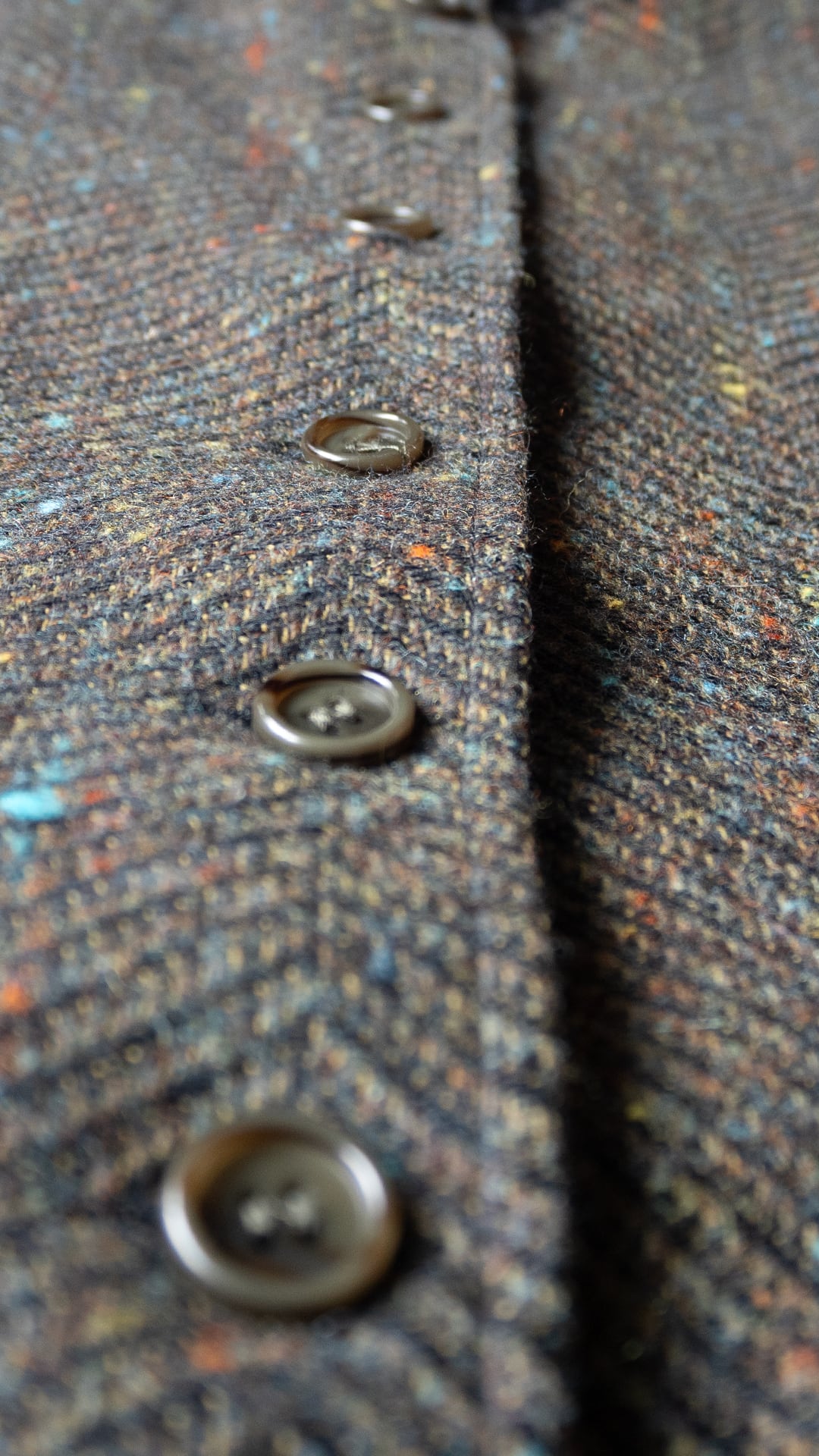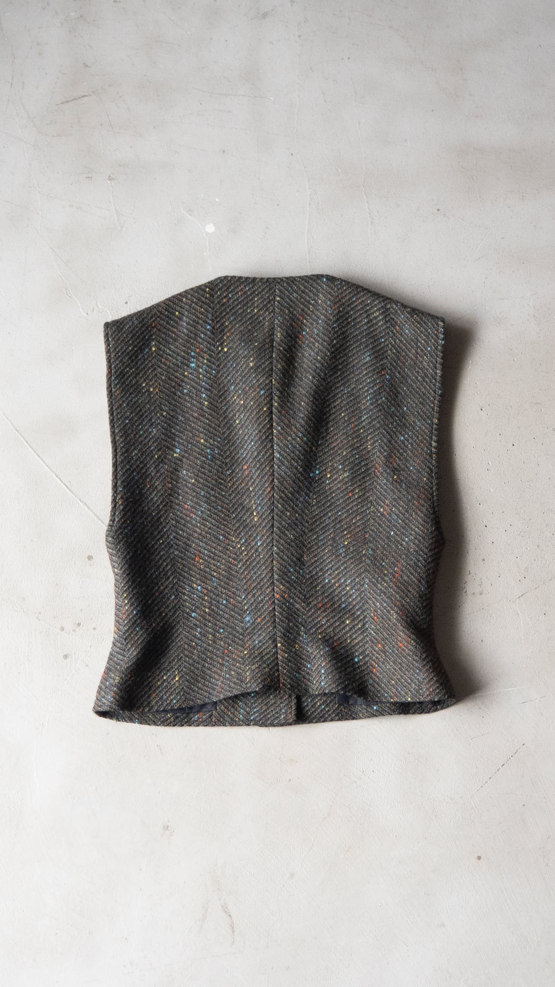 素材のベースはウールだと思われますが、カラーネップが複数色混じっていることから化学繊維もミックスした、幅広いコースのヘリンボンツイードです。