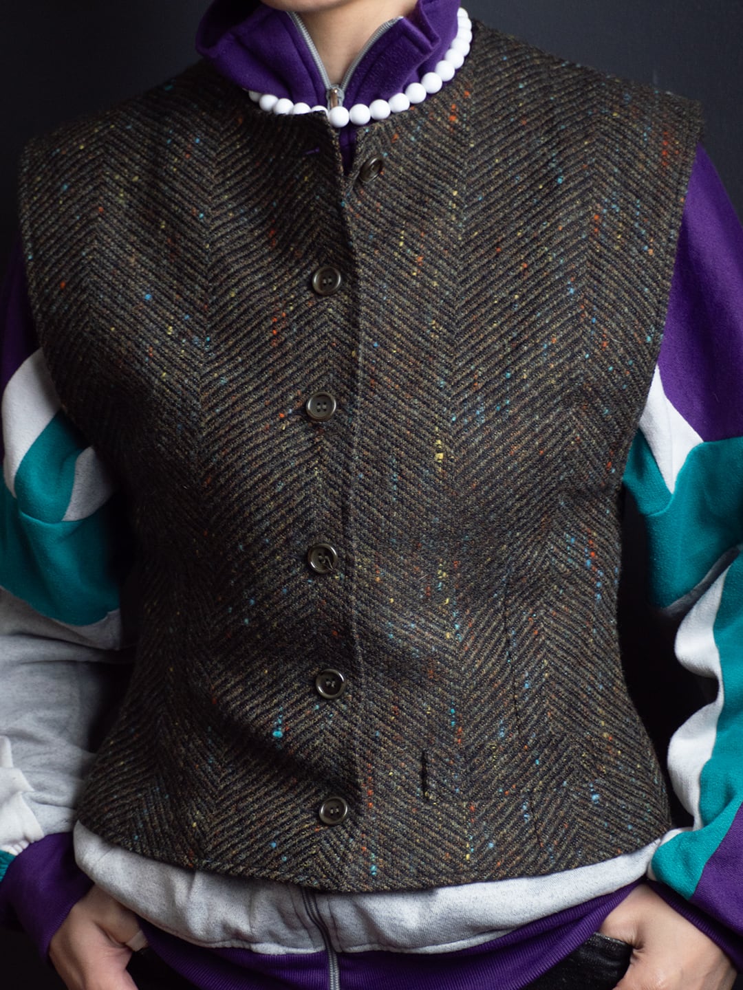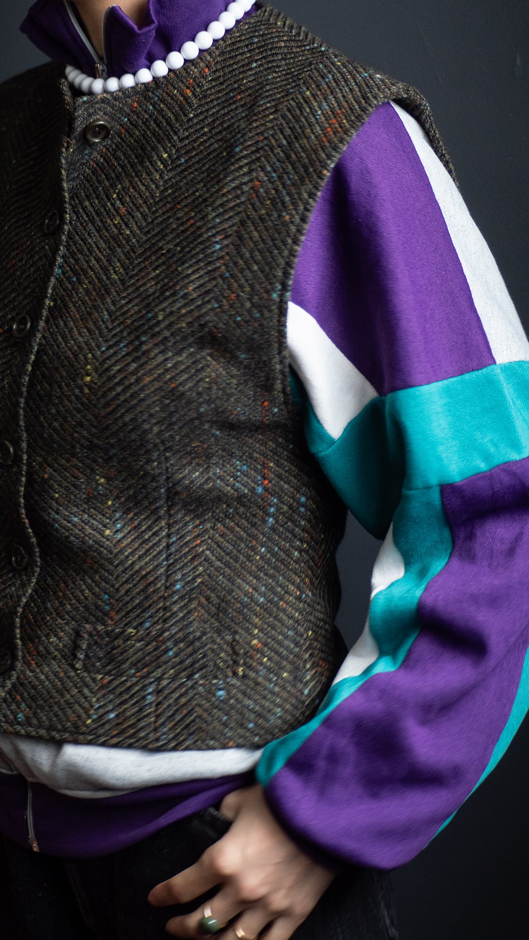 セラストアとしては、'80s'90sのレトロなローカルスポーツジャージをインナーにして色を遊びつつ、このベストらしい肩幅の広さとウエストの狭さというメリハリを生かして女性らしいクラシックな装いを楽しんでいただければと思います。
