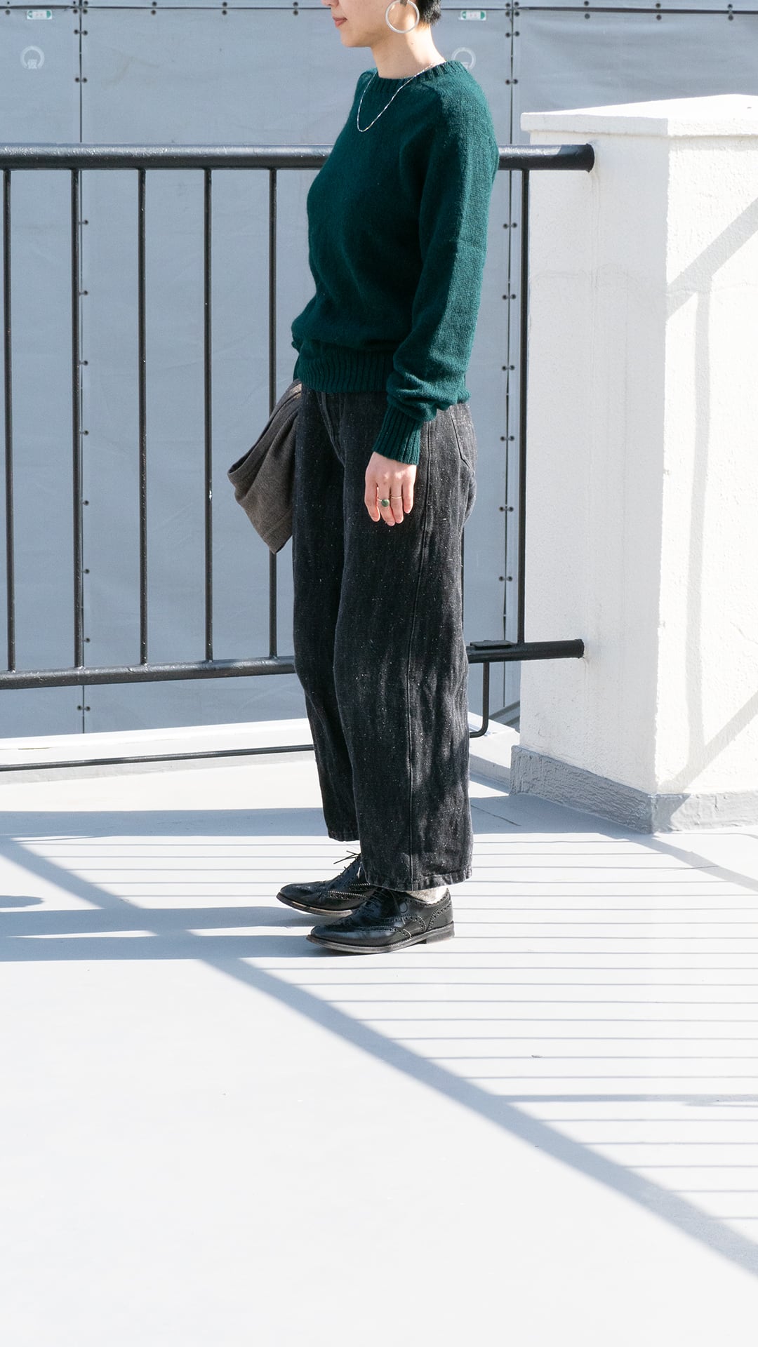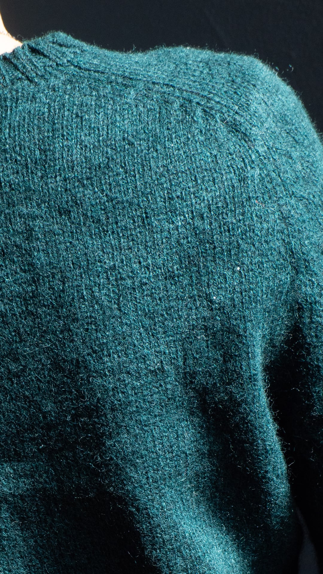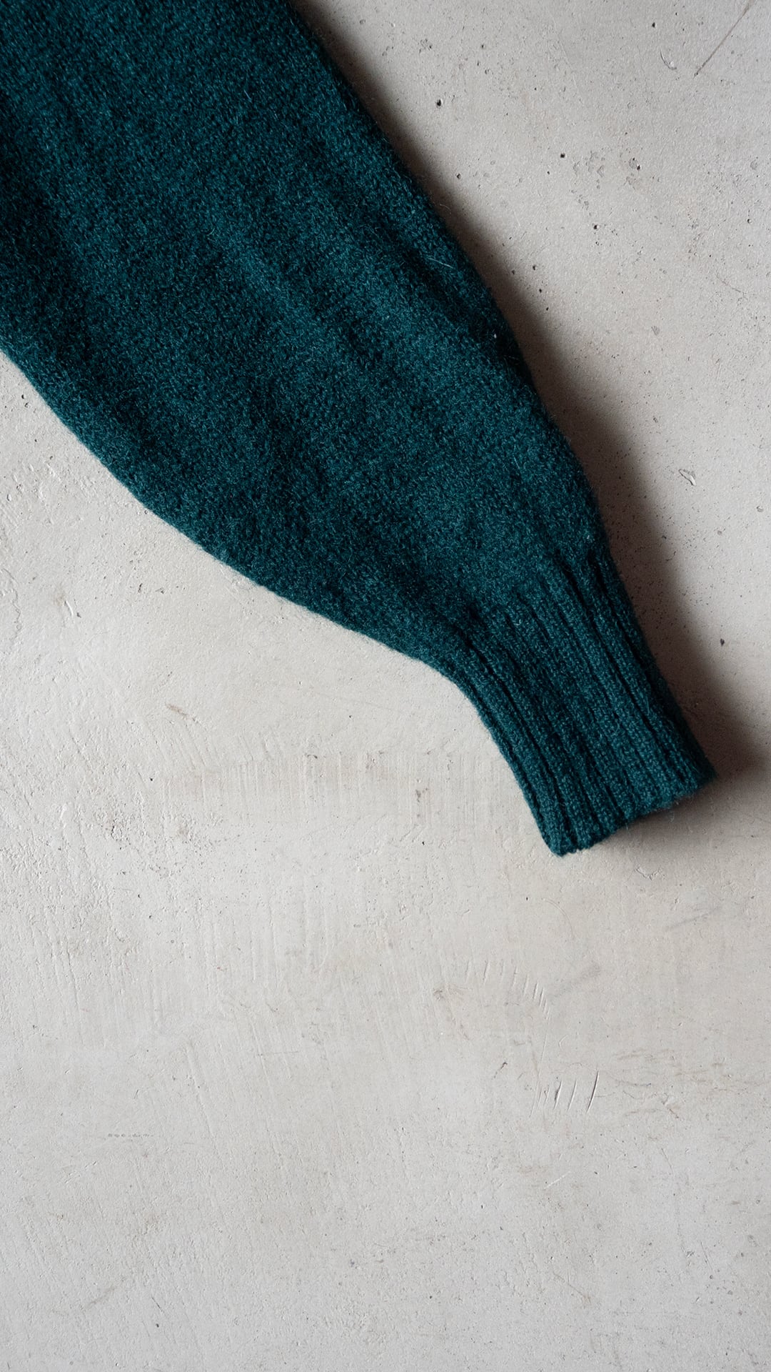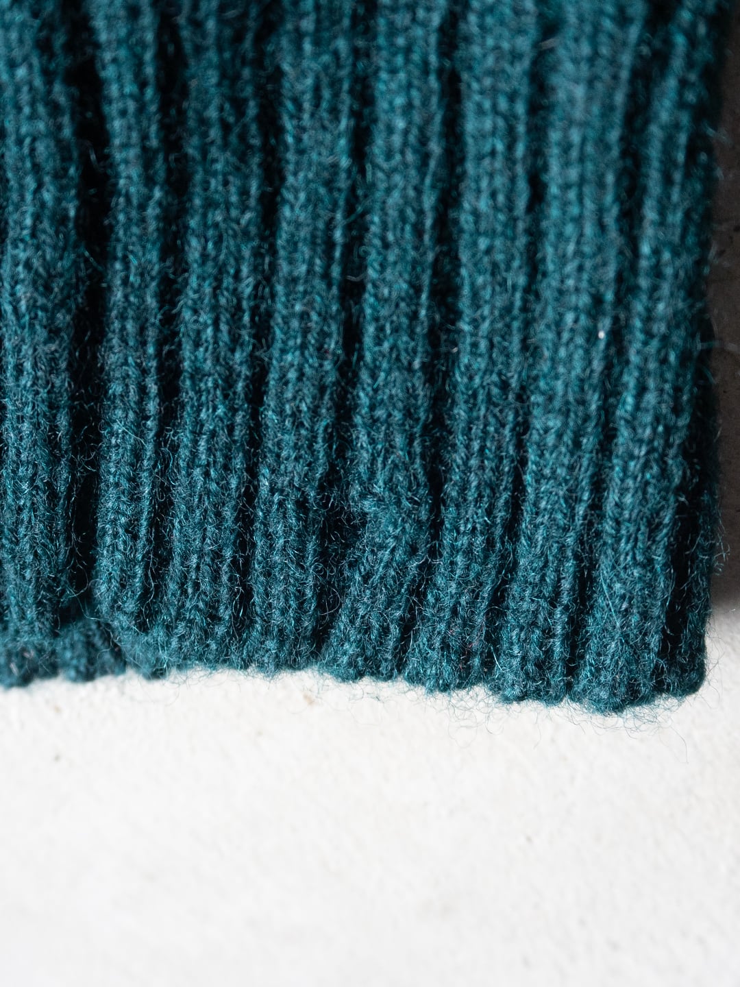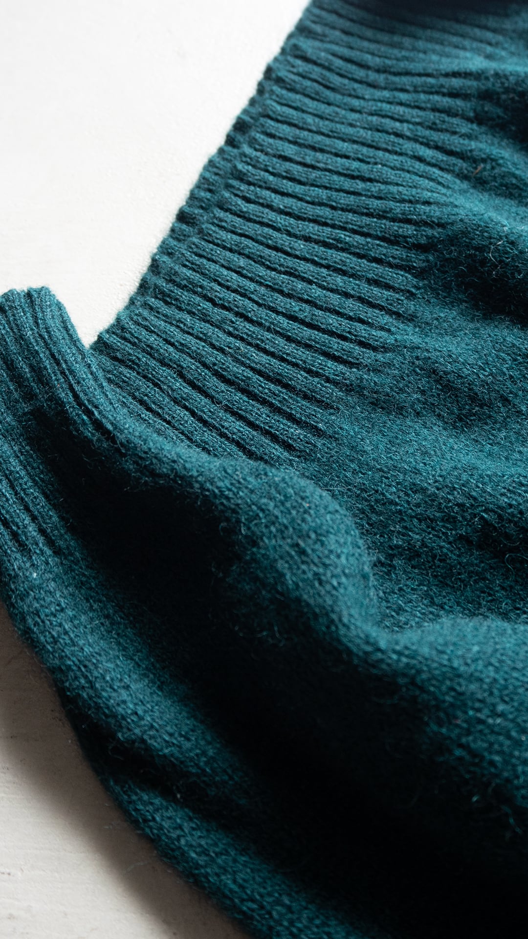 身頃や袖の天竺編みの嵩感を受け取るように、同程度の厚みとなる首元、袖口、裾のリブ網に繋げています。