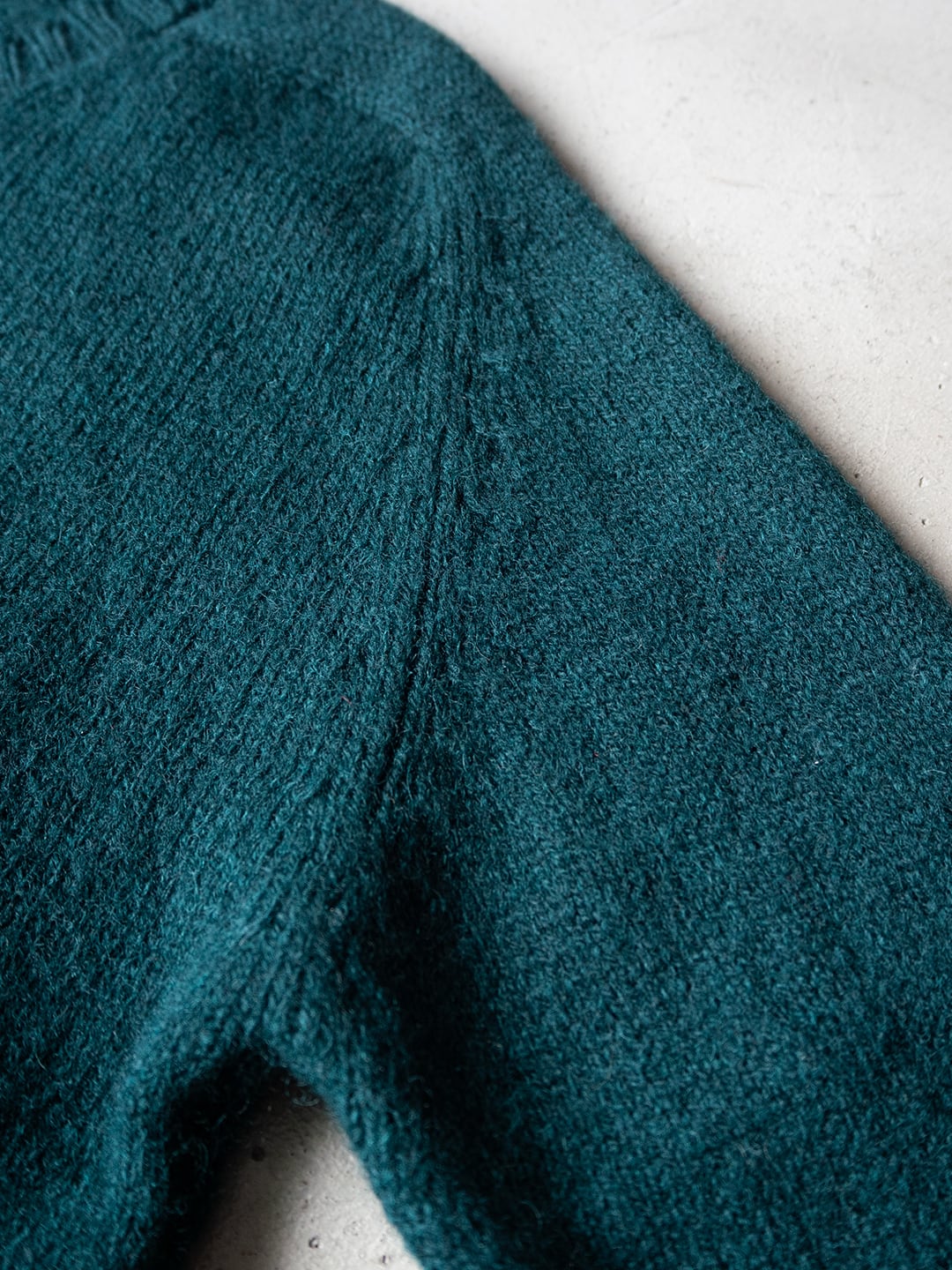 成型機にて編み立てた後、縫製により仕上げた、天竺編みベースのニット。昔ながらな袖付けとなる「サドルショルダー」によるパタンニングです。