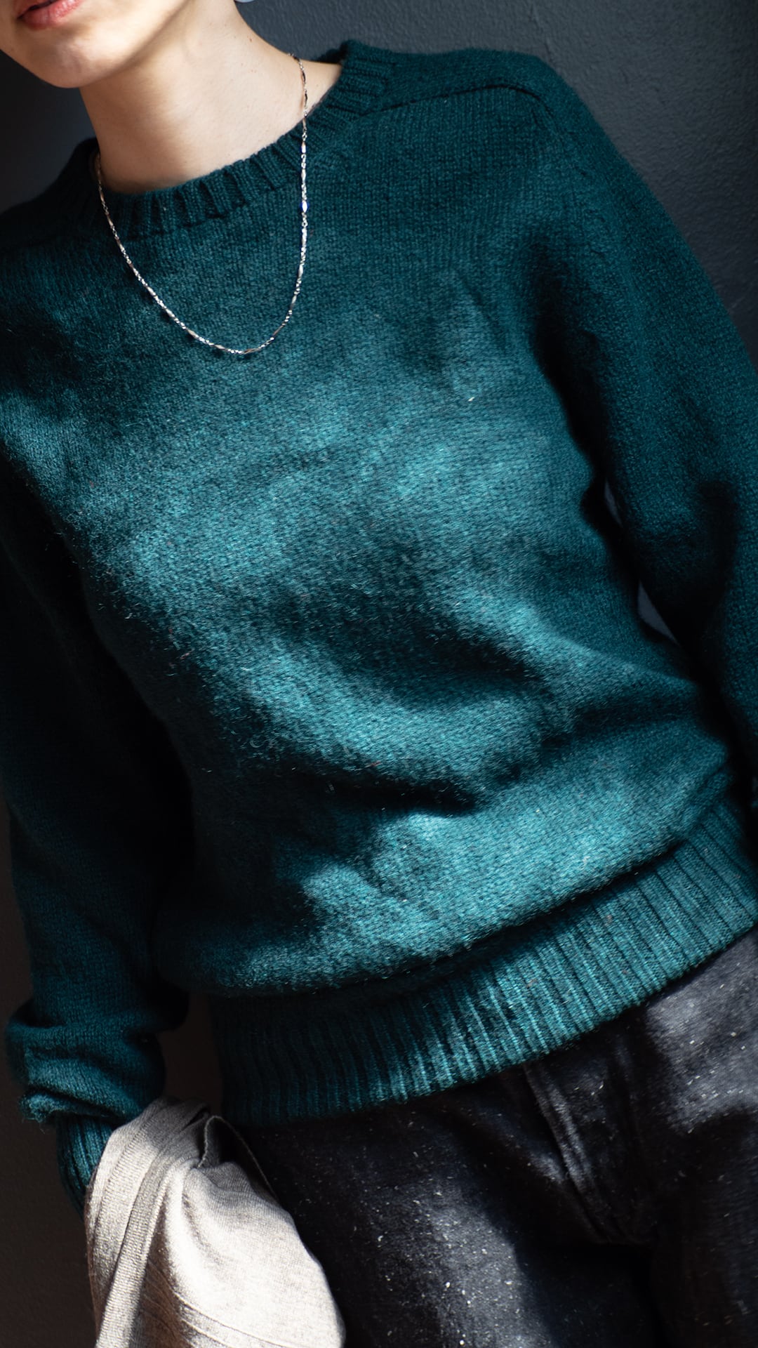 今回の一着は、ウール100%で、紡毛ウールを主に使用した、弾力と膨らみのあるニットです。
