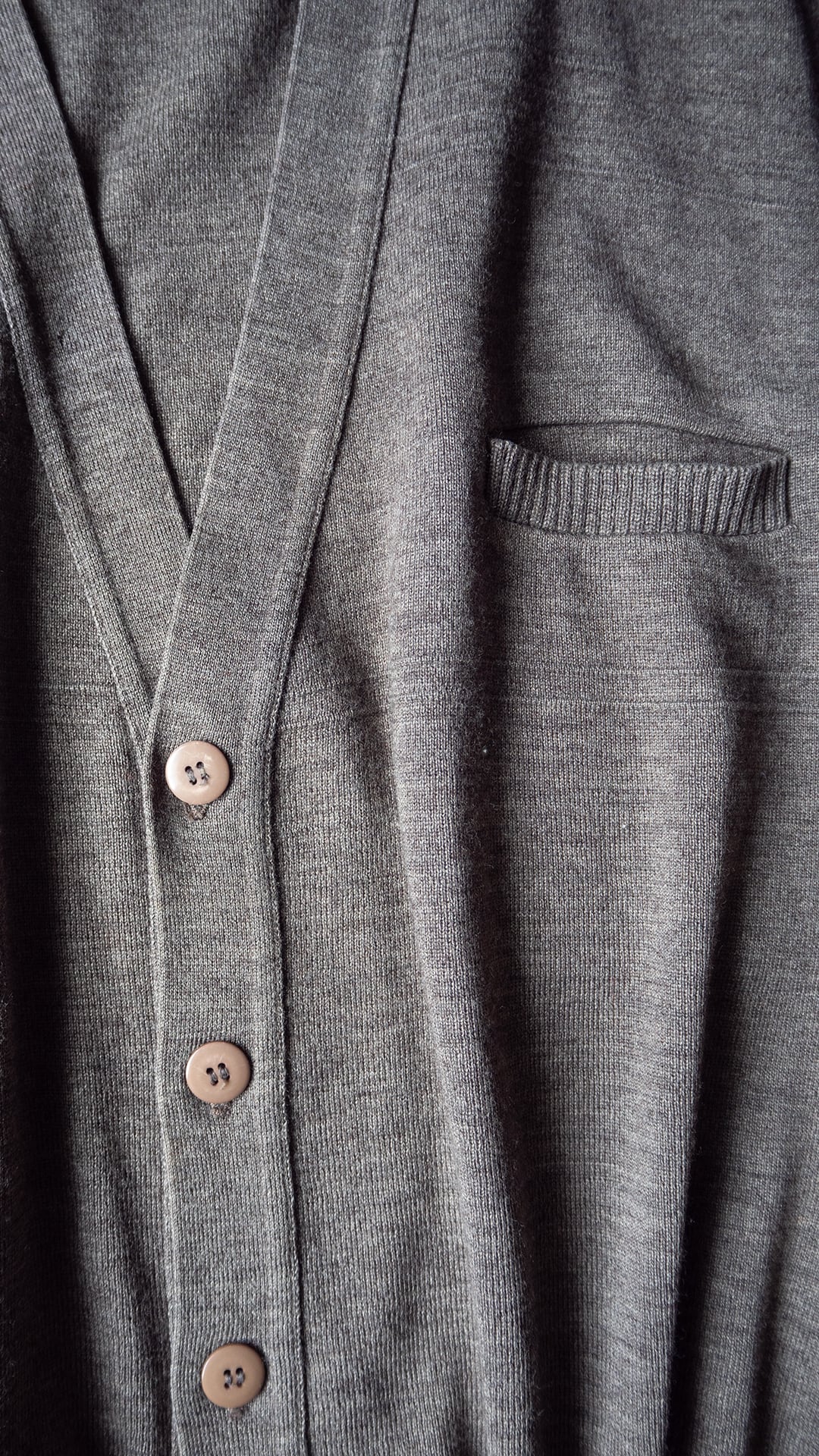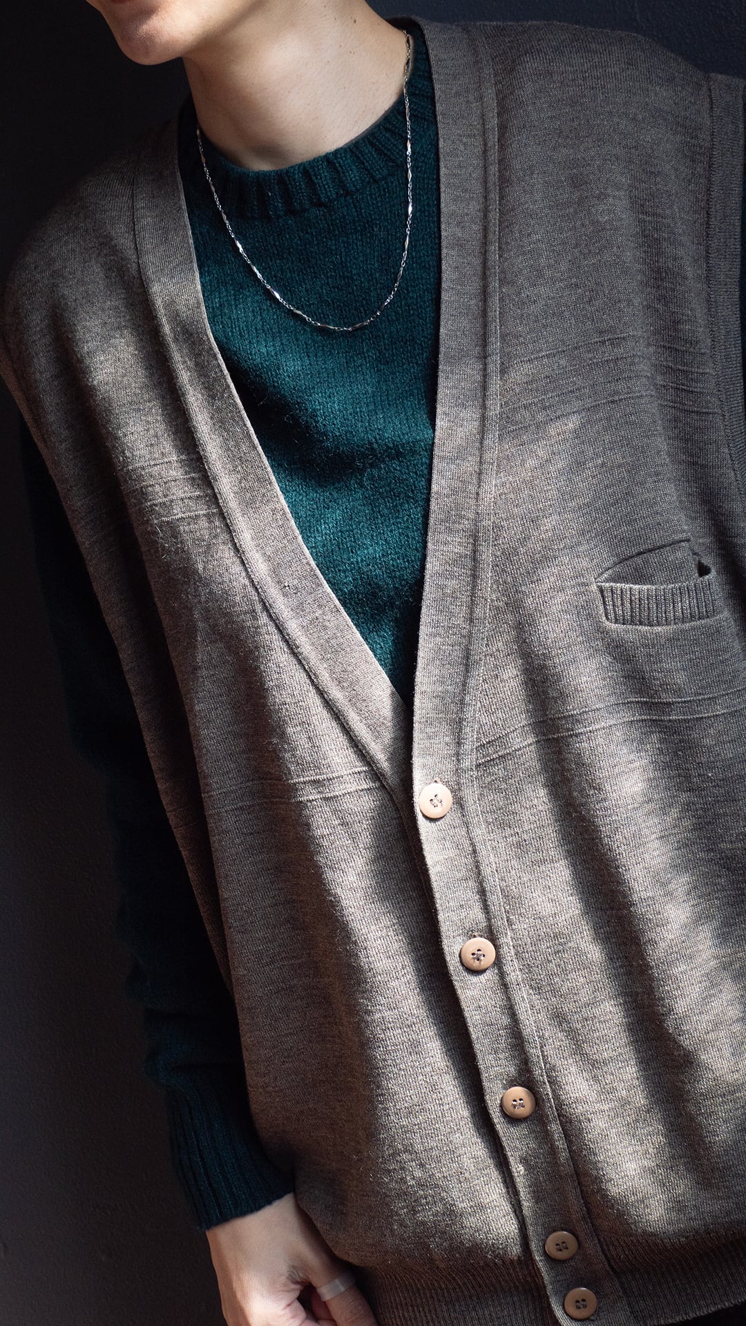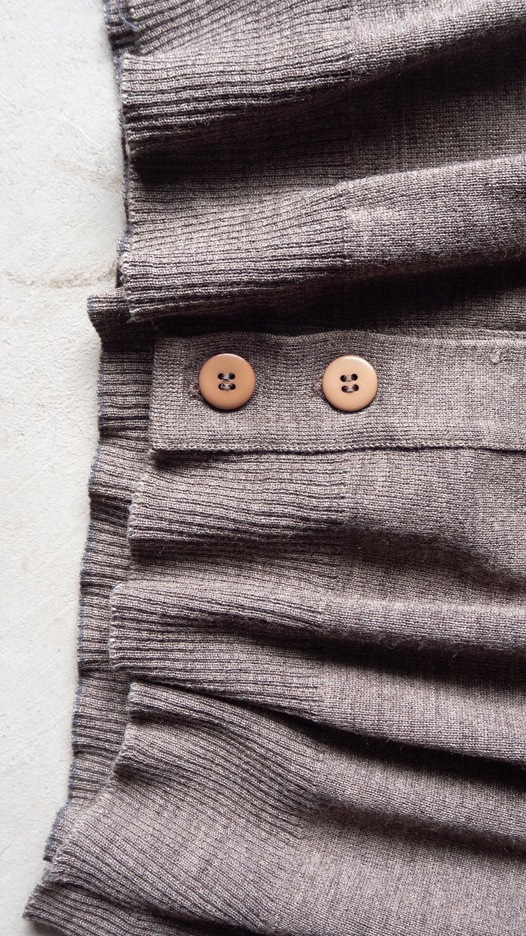 成型機によるパーツ編み立てと縫製によるリンキングで仕立ててあります。縫製周りも硬くなりすぎず、身生地のなめらかさが生かしたら全体感も魅力です。身頃に入った横段ラインやボタンの質感選びもさりげない意匠で、着用時の生地感を活かしたデザインだと思います。