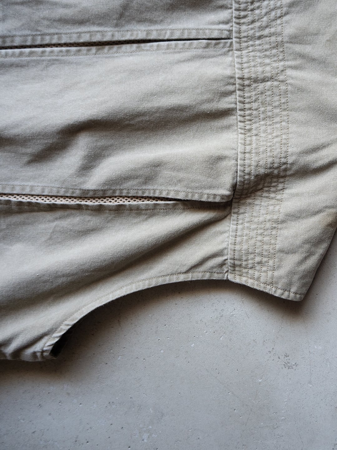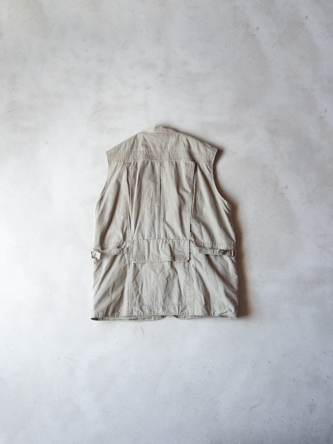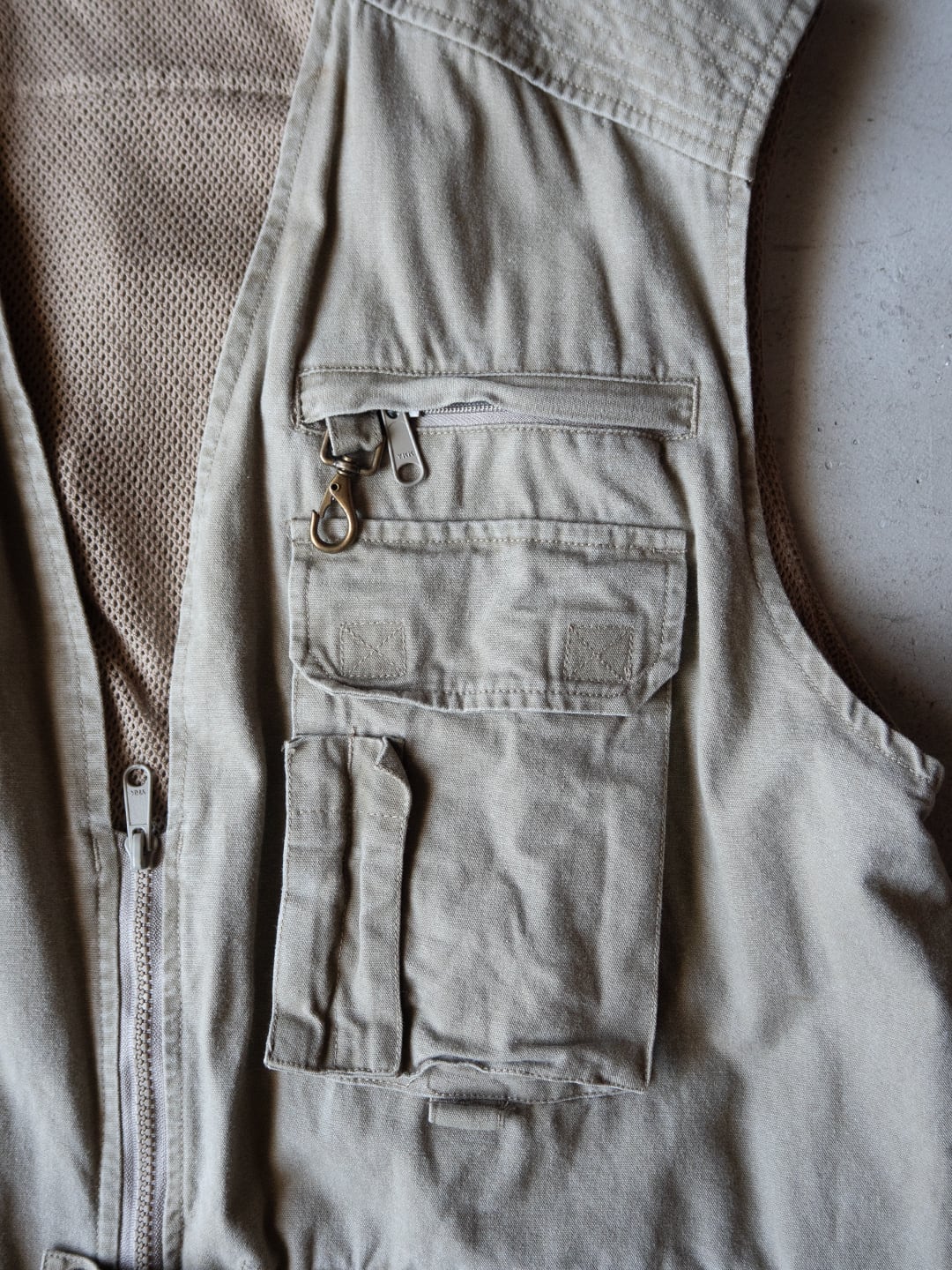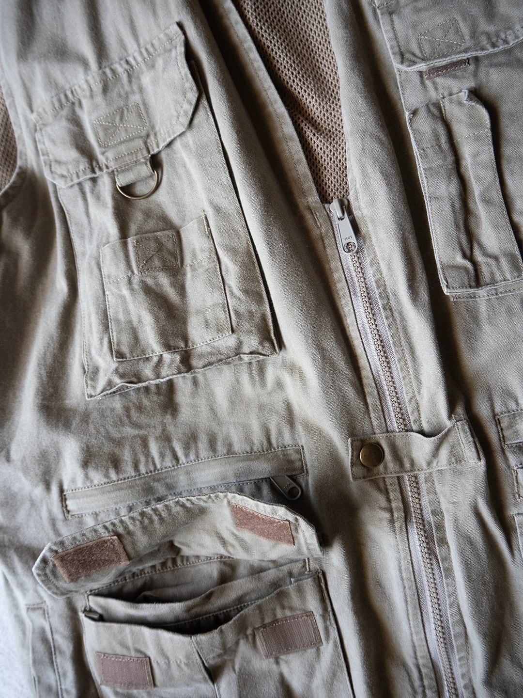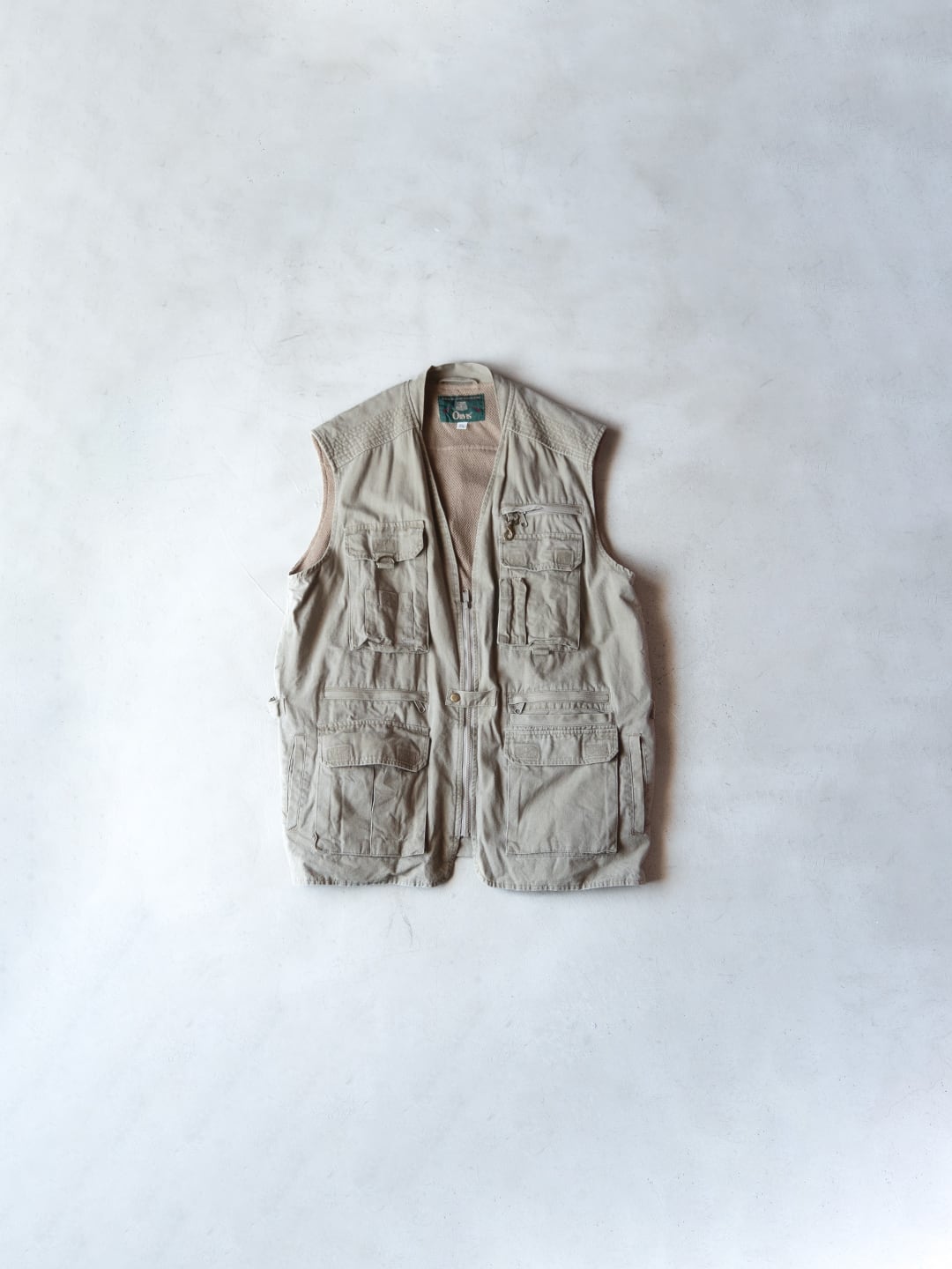 本個体は、コットン100%のシェルで、ライナーとして上部にポリエステルメッシュ、下部には薄手のコットンが用いられたオーバーサイズのベストです。フロントはジップで、スナップタブが付属、襟はVネック上部に月形の襟が付属します。フロントには小分けポケットが充実し、開閉はジップかベルクロという多収納ポケットが両胸、両腰に付属。左右対称ではなく、用途に合わせて左右いずれも単独で仕様が組まれています。