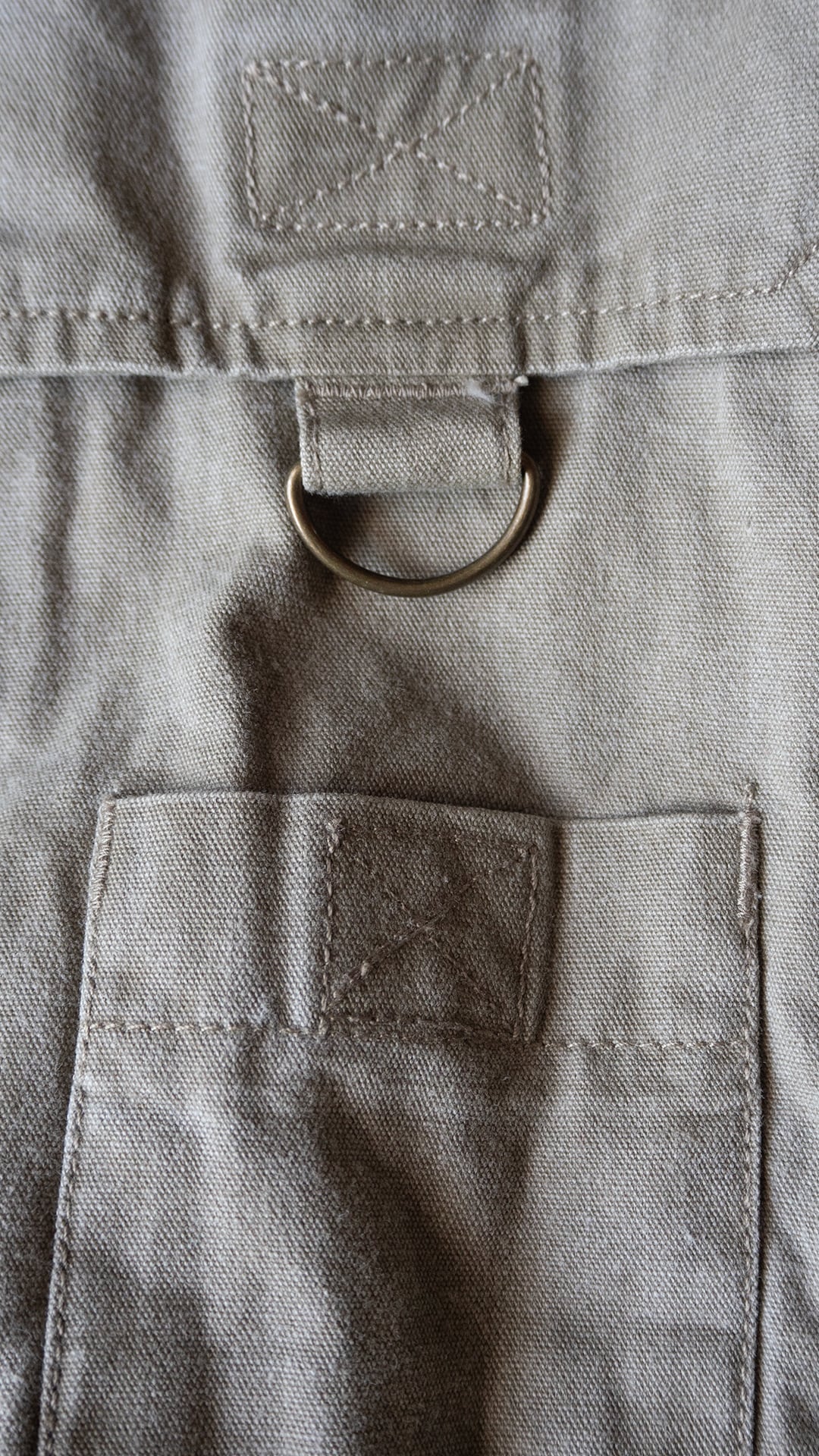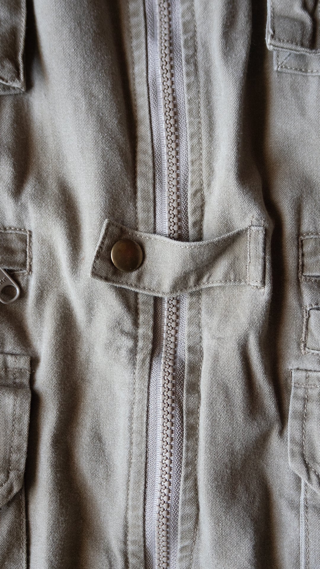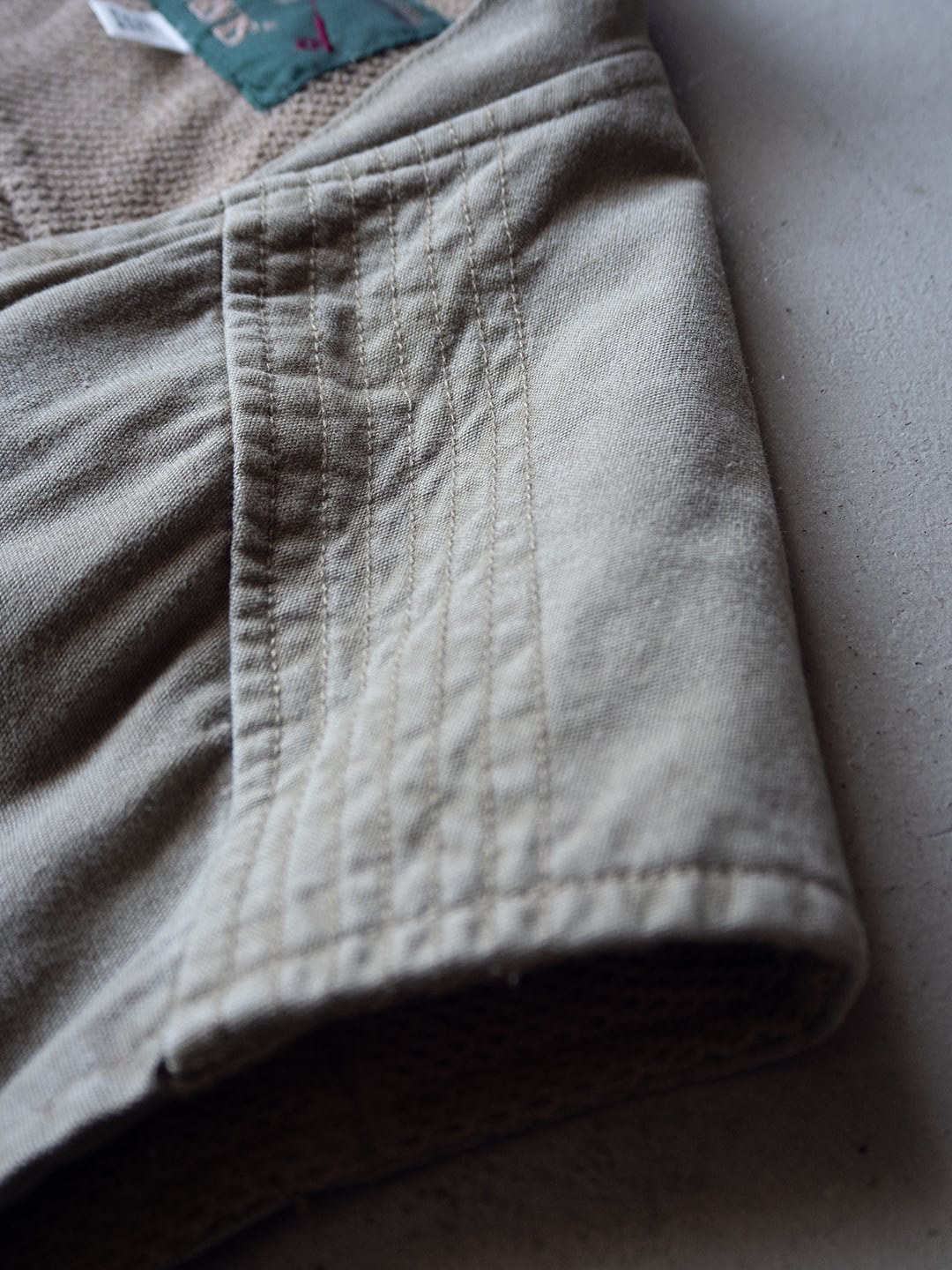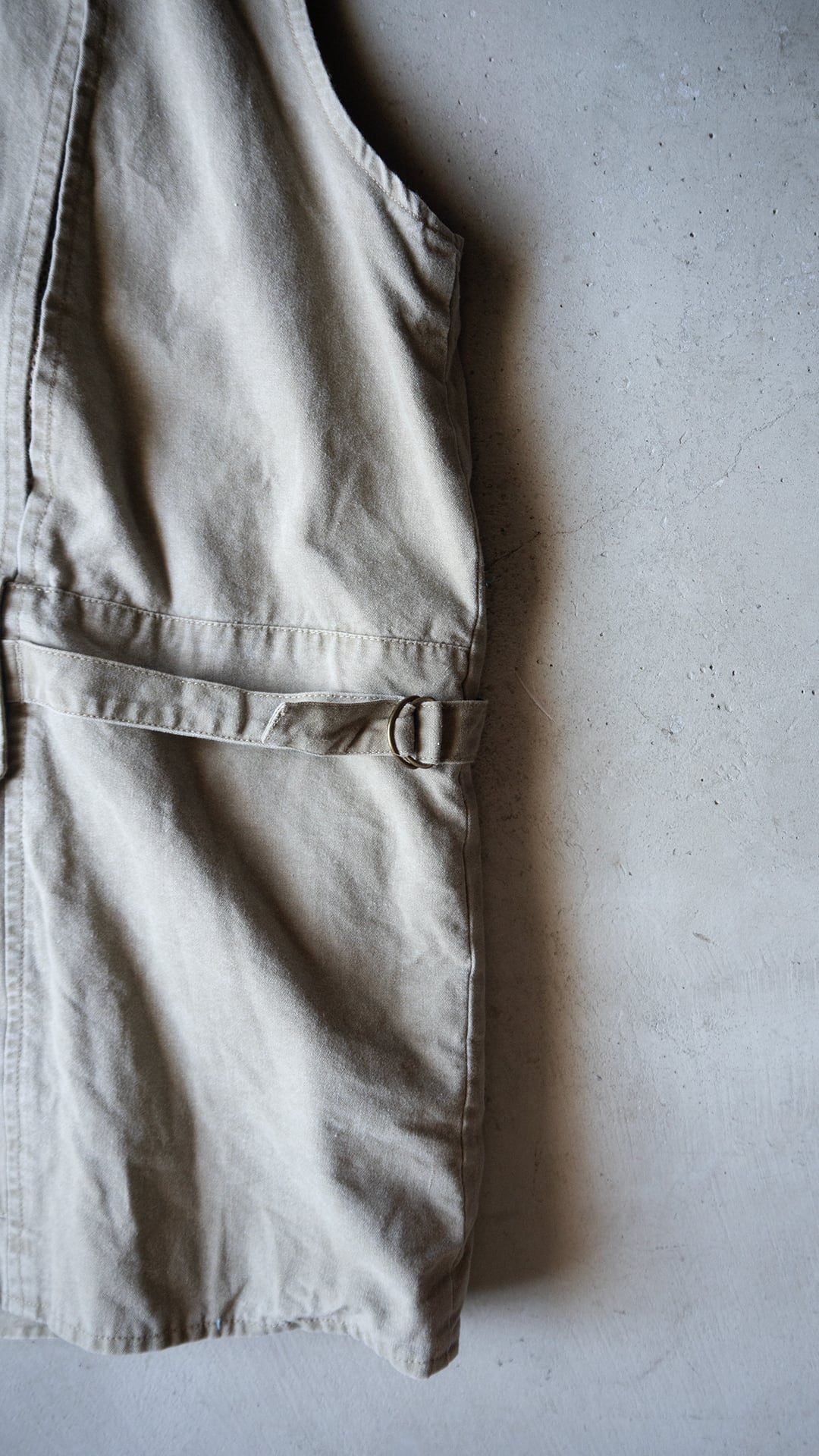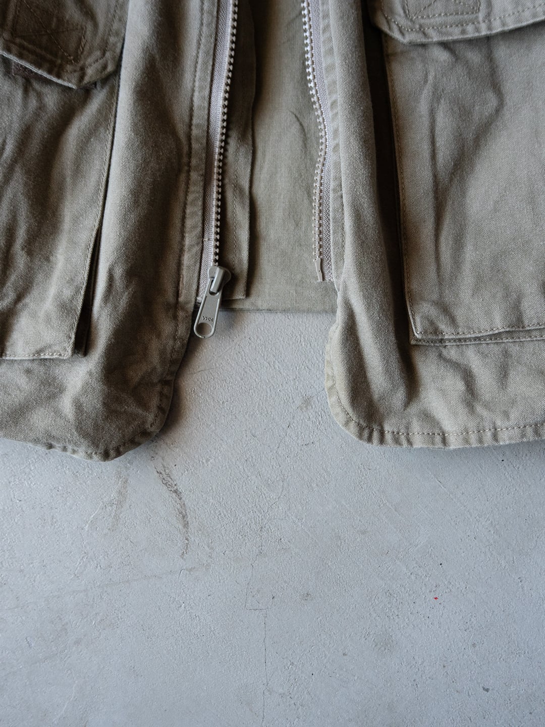 本個体は、コットン100%のシェルで、ライナーとして上部にポリエステルメッシュ、下部には薄手のコットンが用いられたオーバーサイズのベストです。フロントはジップで、スナップタブが付属、襟はVネック上部に月形の襟が付属します。フロントには小分けポケットが充実し、開閉はジップかベルクロという多収納ポケットが両胸、両腰に付属。左右対称ではなく、用途に合わせて左右いずれも単独で仕様が組まれています。
