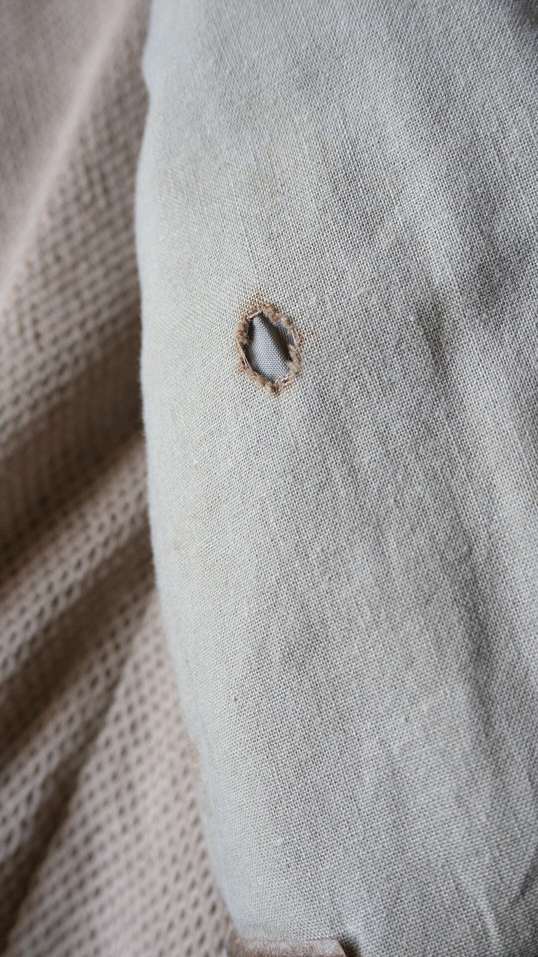 左前身頃見返し側(内側)に穴 (1cm程度)がございます(写真9枚目掲載)。
