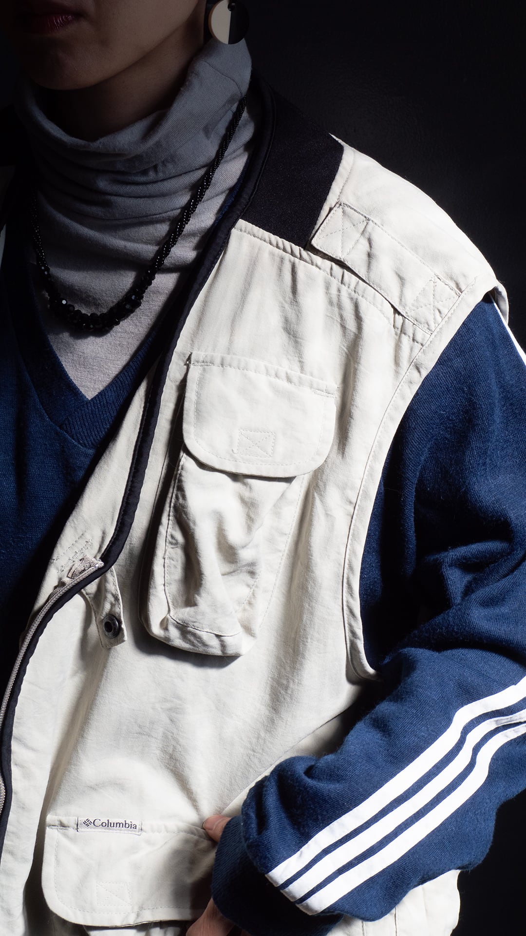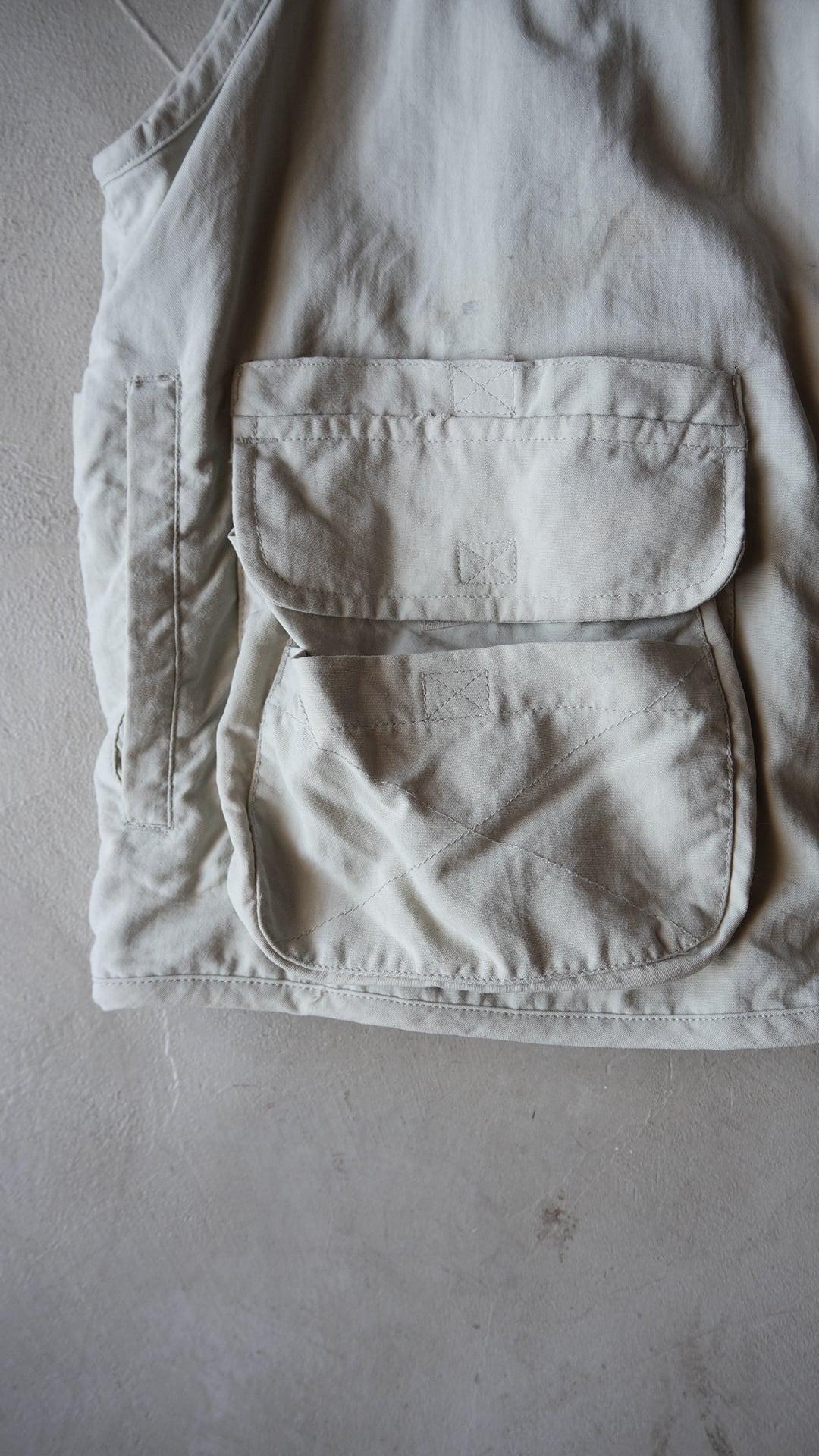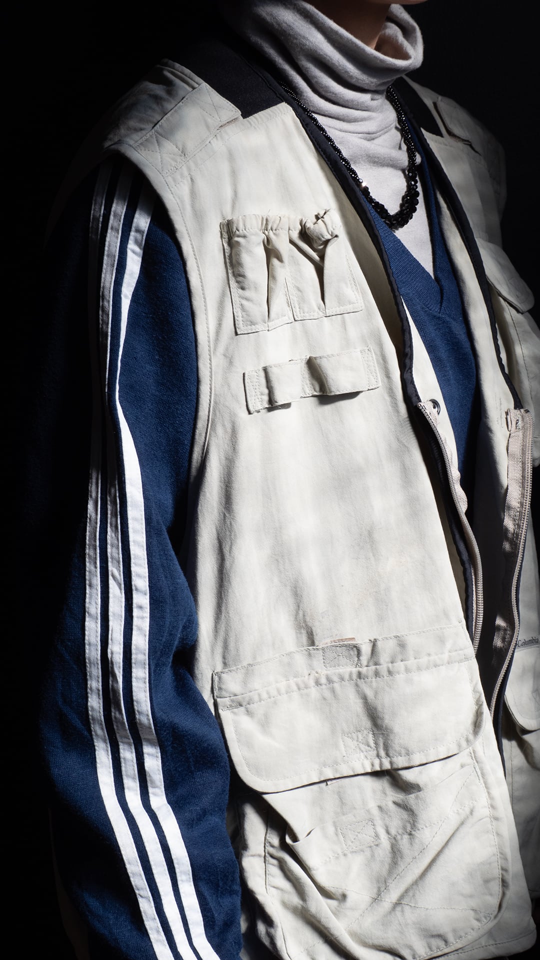 ボディは艶がなくマットな質感が特徴のライトグレー色のナイロンシェル。襟ぐり上部の生地切り替え、前立て端にパイピング、裏地上部のメッシュといずれもブラックで統一されています。ベルクロでフラップを閉じる立体マチ付きのポケット、ポケット口にゴムが通してあったり、2部屋のポケットを仕切る部分を外し1部屋に合併できる仕様を落とし込むなど、さまざまなシーンを想定した多機能・他収納ベストとして企画されています。