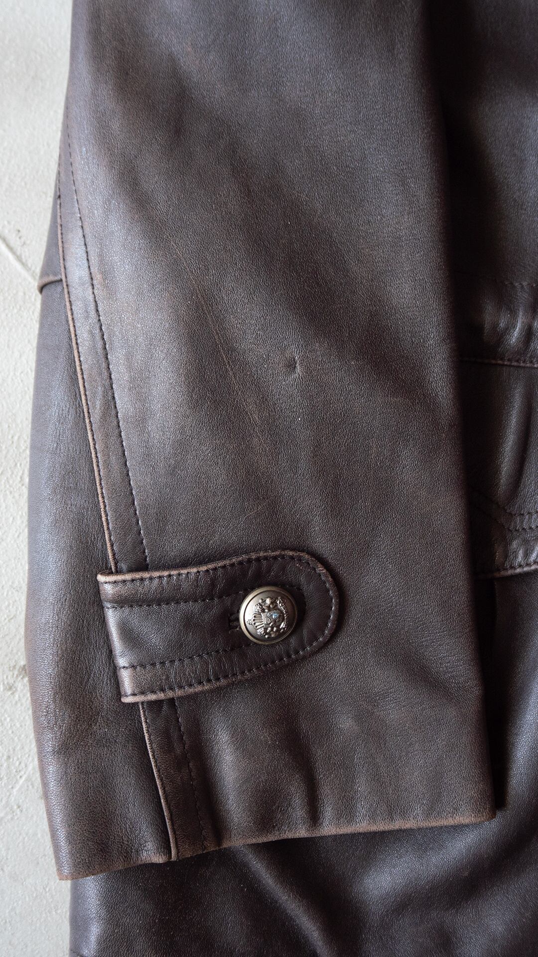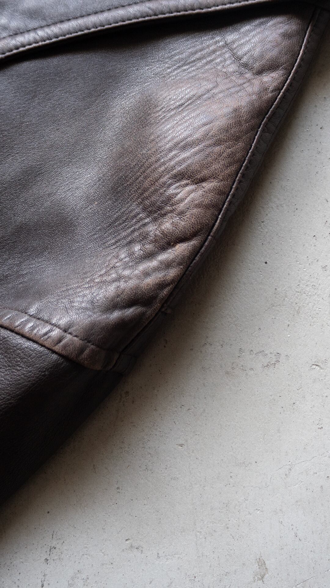 レザーの状態は、肩周りや襟や裾、袖口の端々に表面剥離、スレがあり、劣化しています。