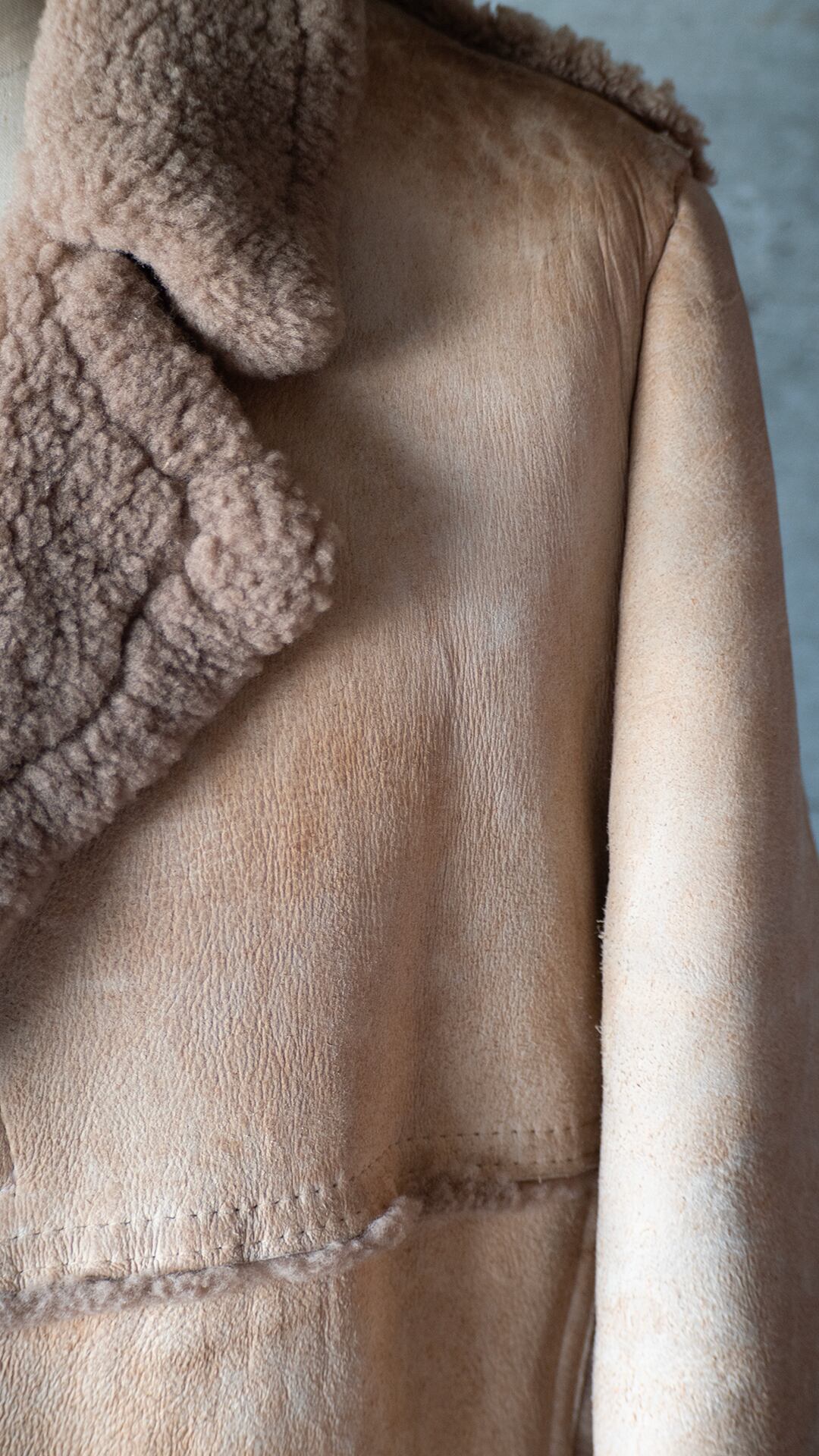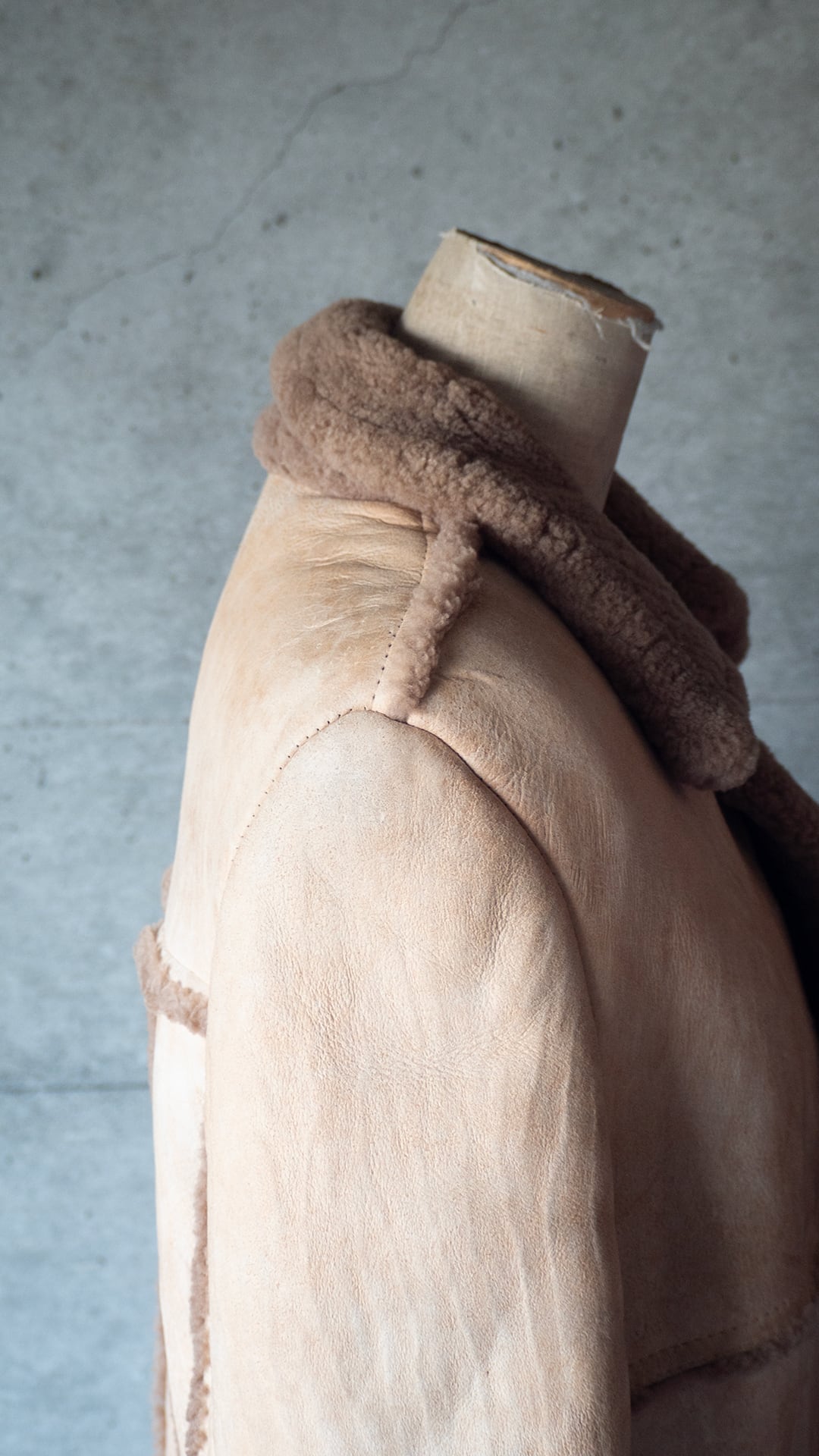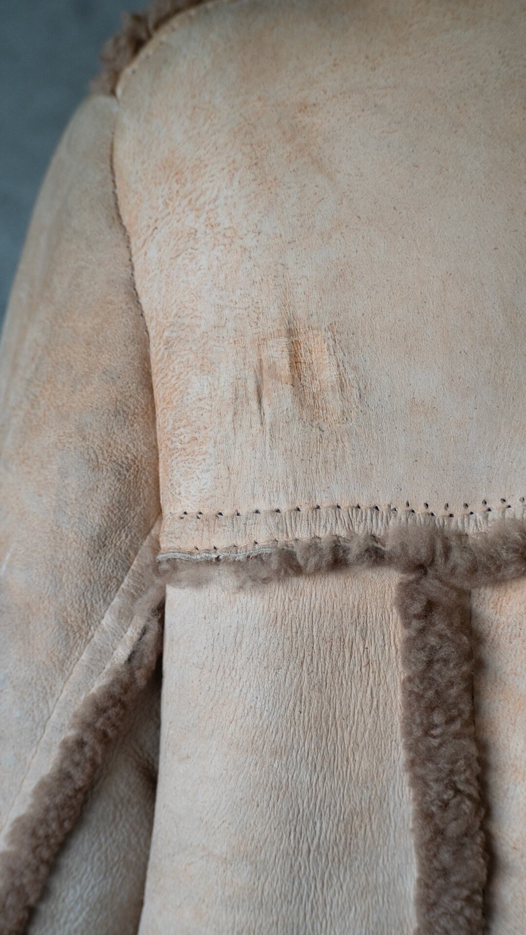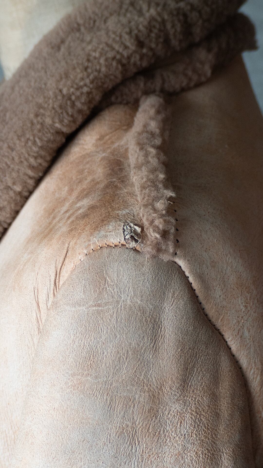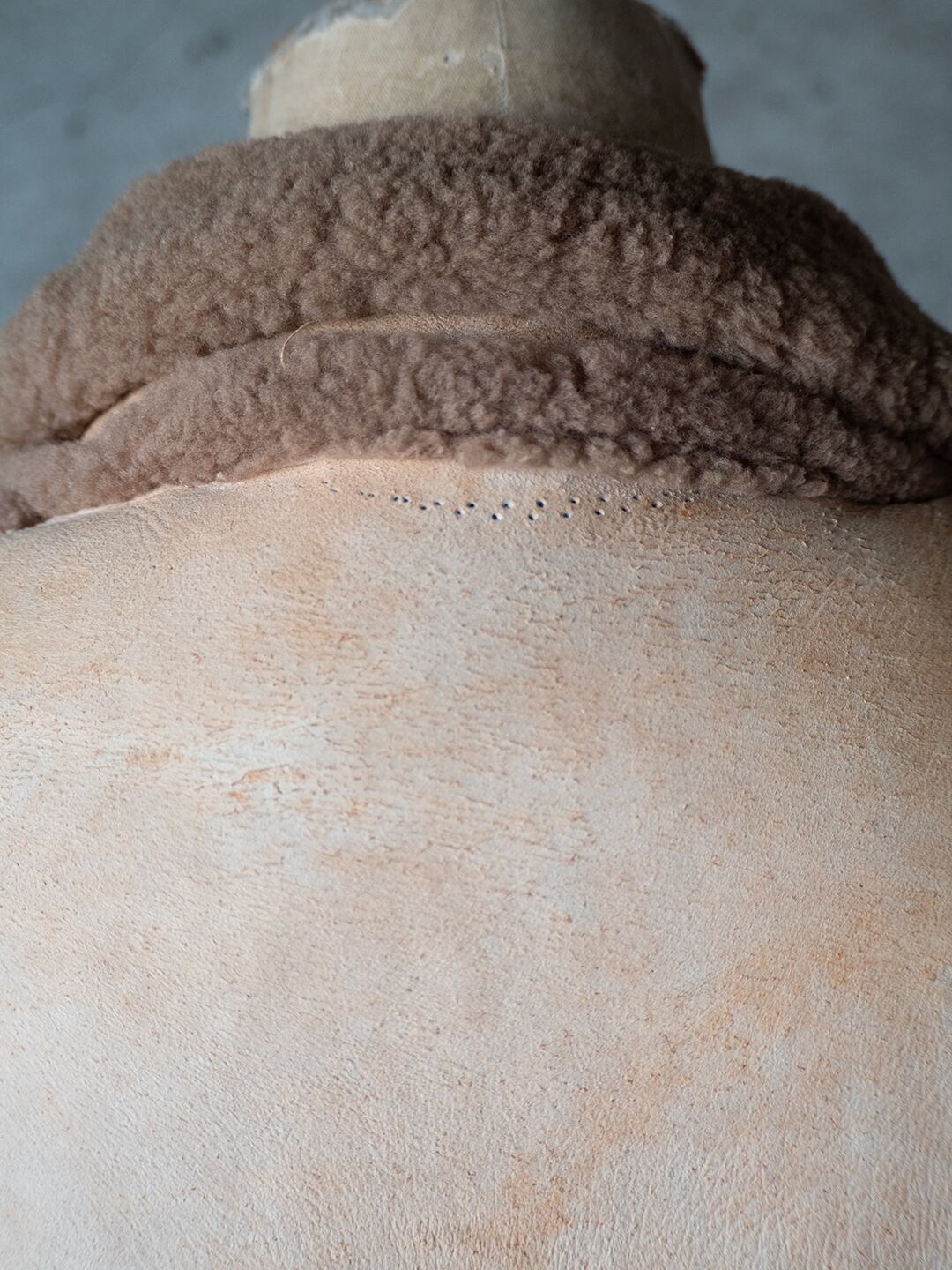 生々しい羊の革の裏面にある繊維ムラ、表面の毛の密度などをそのまま残し、シンプルに仕立てられていると思います。首の裏側は針穴だけが見えている箇所があり、縫製糸のほつれがあります。ただ着用時の状態、堅牢さにはほとんど影響がないため、そのままにしています。