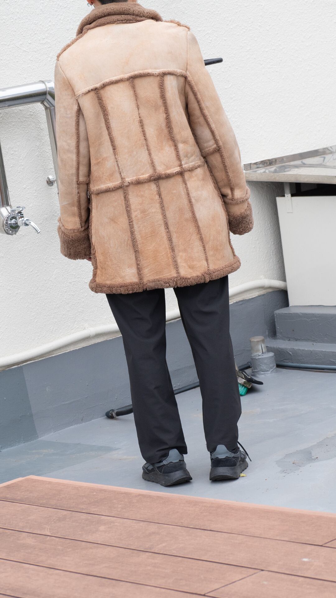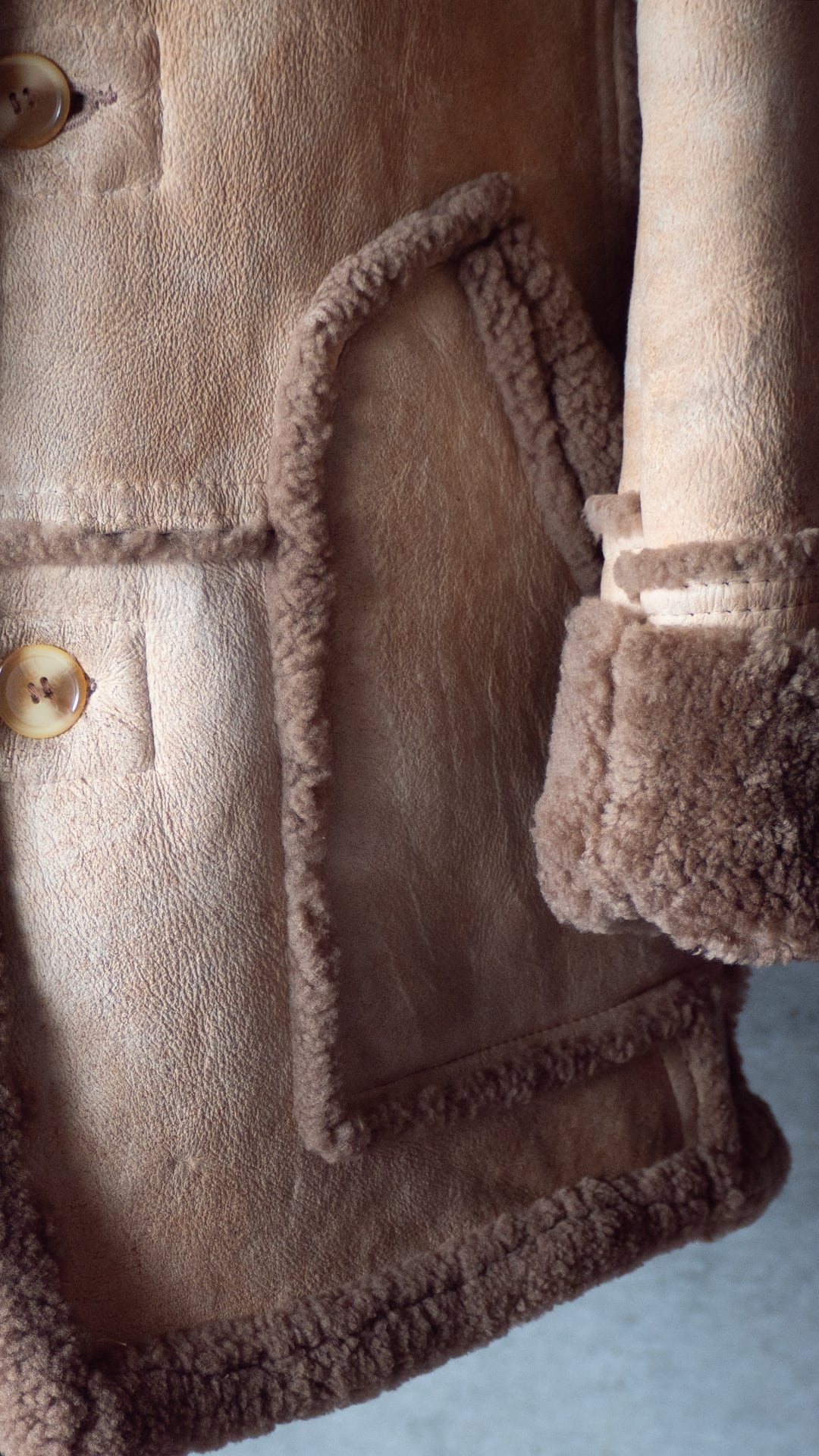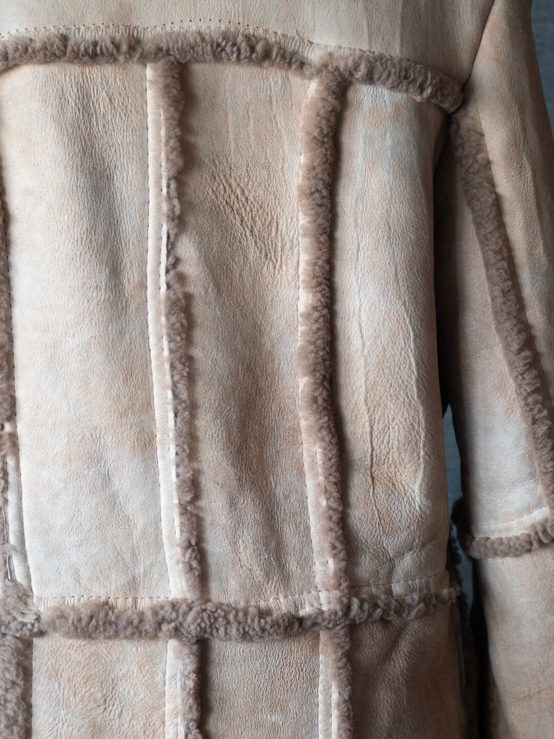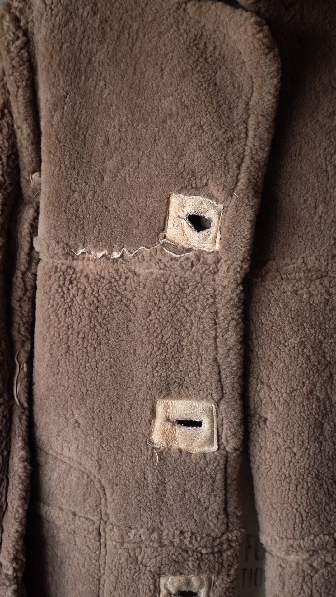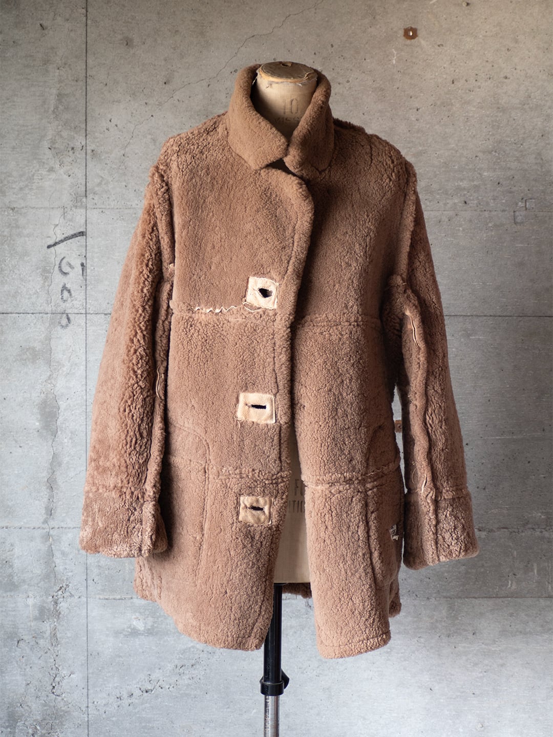 生々しい羊の革の裏面にある繊維ムラ、表面の毛の密度などをそのまま残し、シンプルに仕立てられていると思います。首の裏側は針穴だけが見えている箇所があり、縫製糸のほつれがあります。ただ着用時の状態、堅牢さにはほとんど影響がないため、そのままにしています。