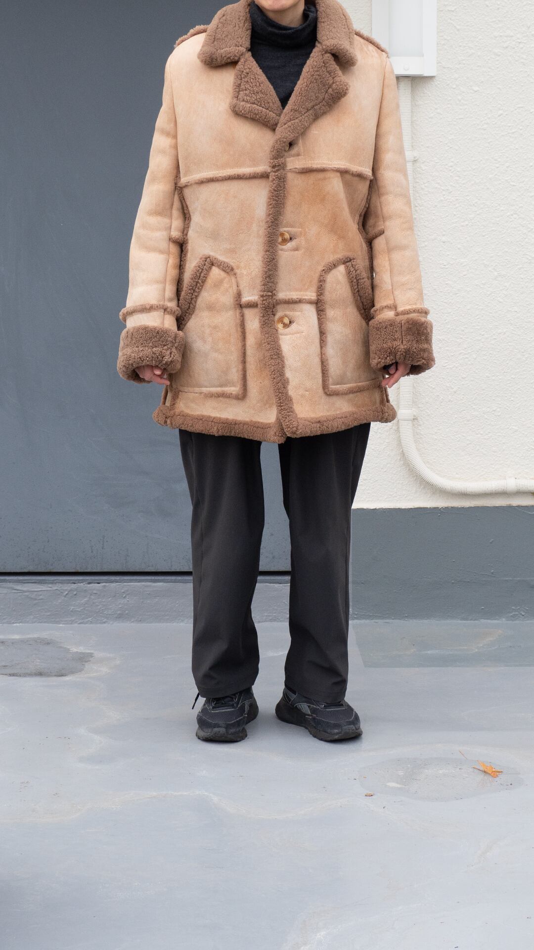 今回のムートンコートは、膨らみと弾力のあ羊の毛がびっしりと残されたシープレザーで仕立てられた贅沢な一着。