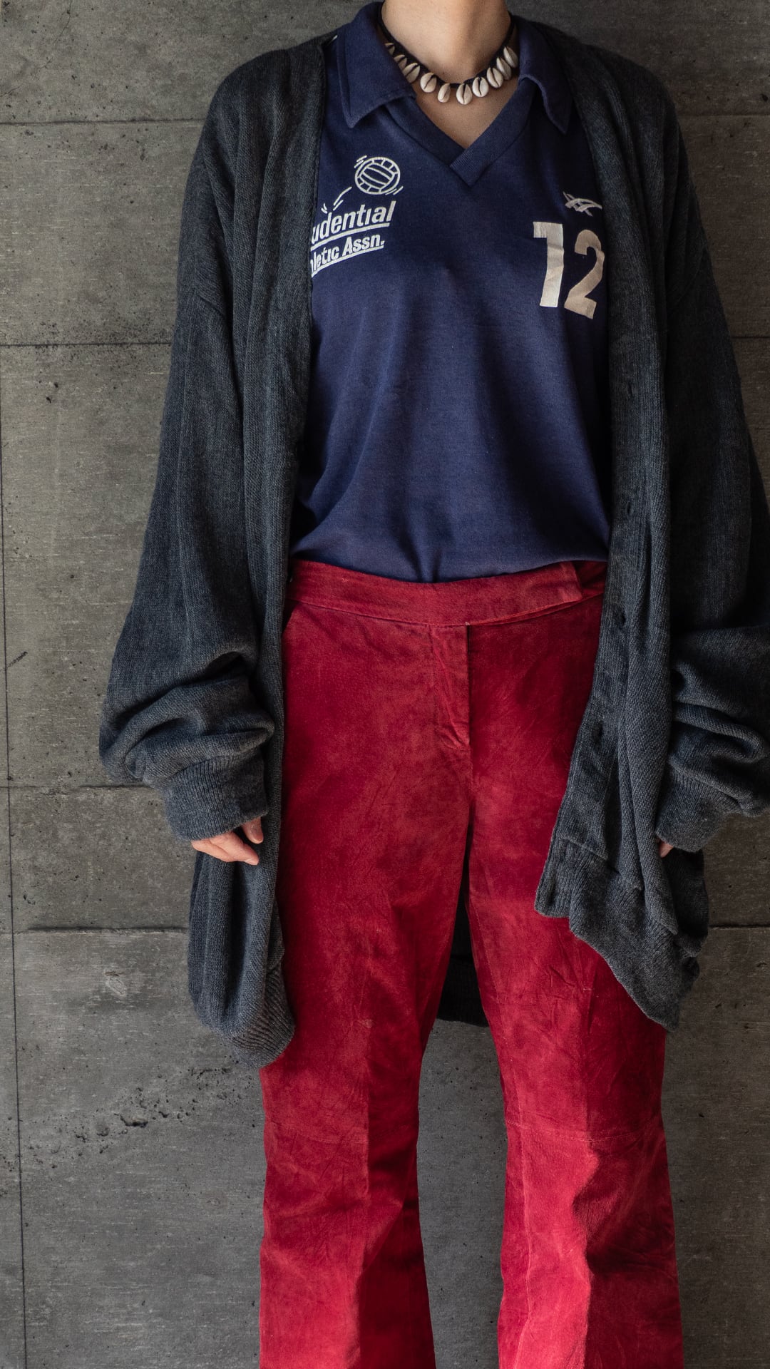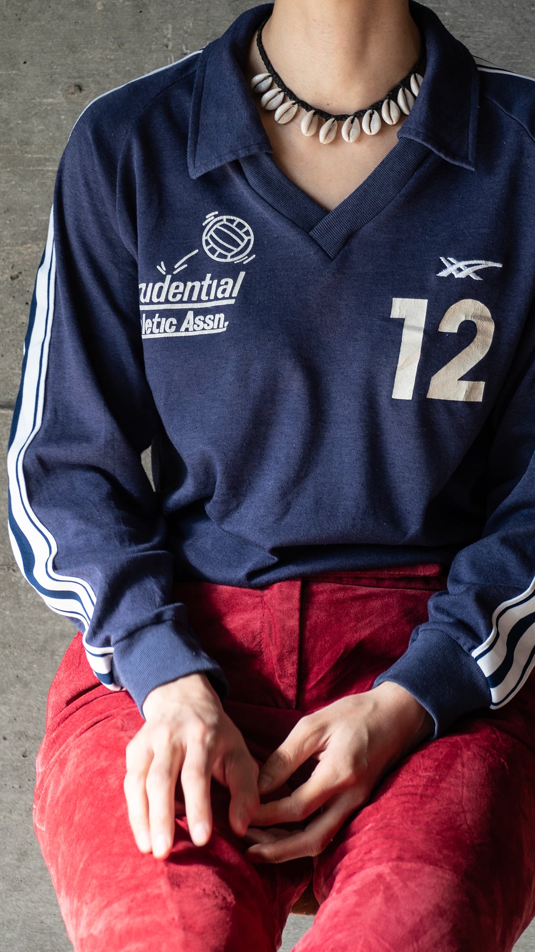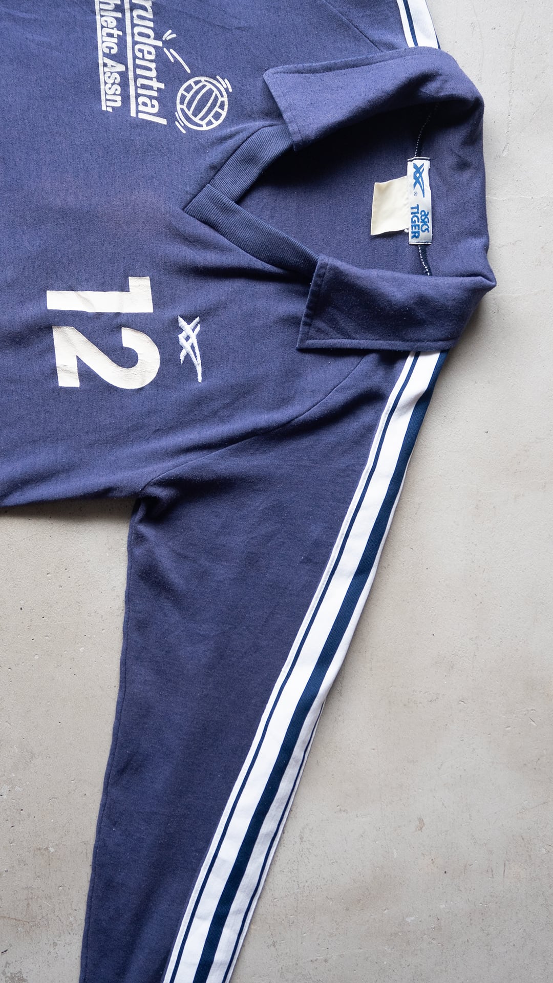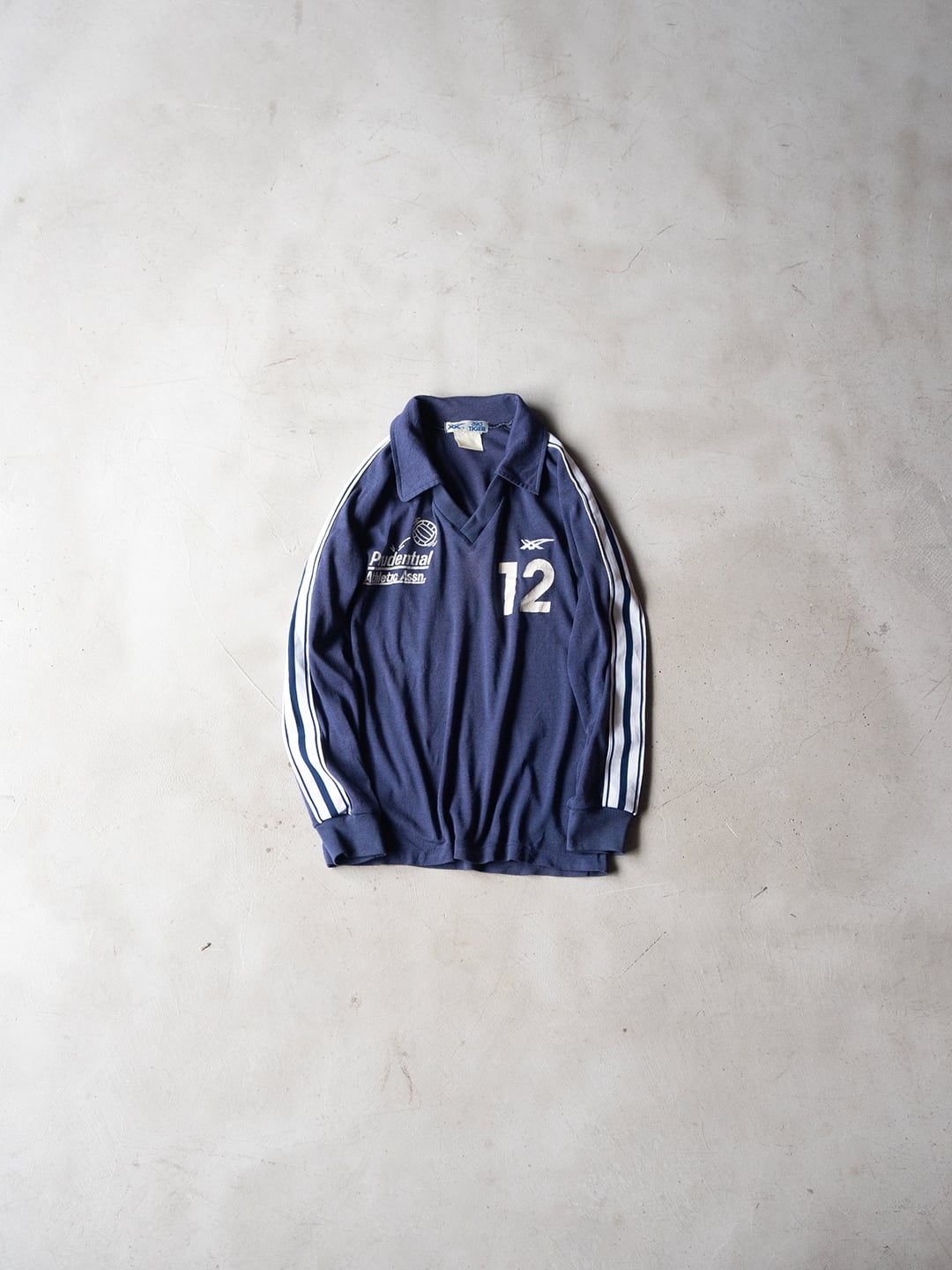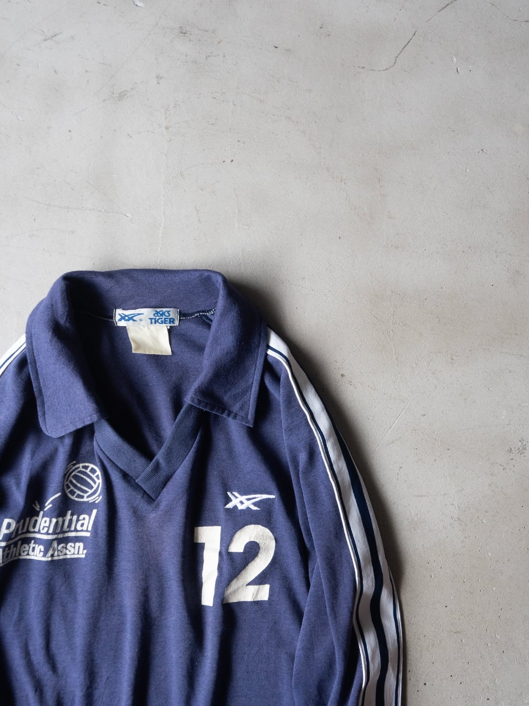 企業ロゴと背番号が入った、アシックスタイガー(ASICS TIGER)のVネックスポーツシャツ。本個体は、タグのデザインから80年代製だと思われます。流通していたのはアメリカで、右胸のPrudential Athletic Assnは、プルデンシャルという企業が発足させた運動協会を指していると思います。ボールのデザインから、バレーボール競技用のユニフォームなのだと思います。