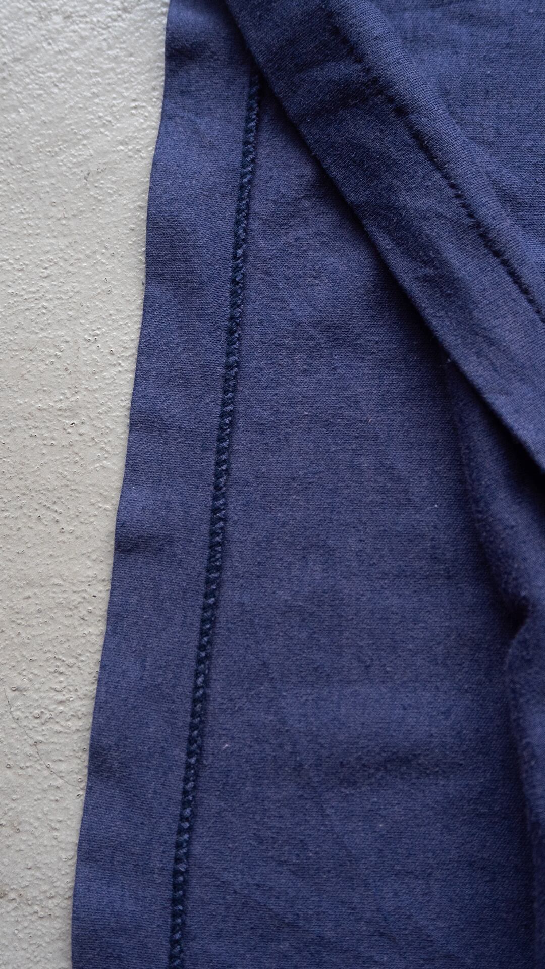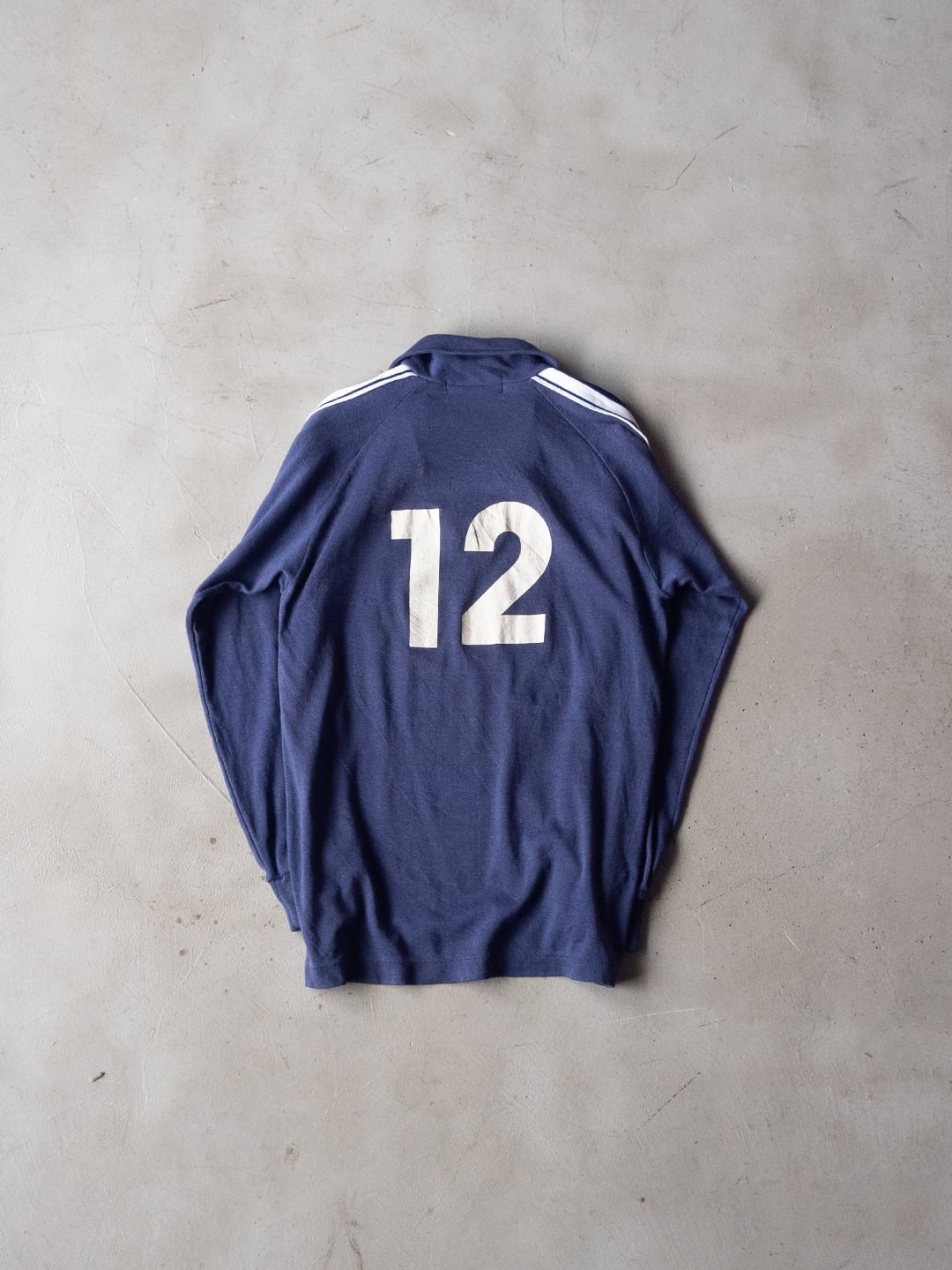 素材表記が消えており、セラストア店主の見解となりますが、生地はコットンベースのスムース編み。ポリエステルがアクリルが混じっていると思われ、衿やボディ裏に毛玉が散見されます。ラグランスリーブで外側に太幅の側章ラインが上付けされています。ピッチが異なる2ライン、ホワイトとネイビーの組み合わせが大変クールです。