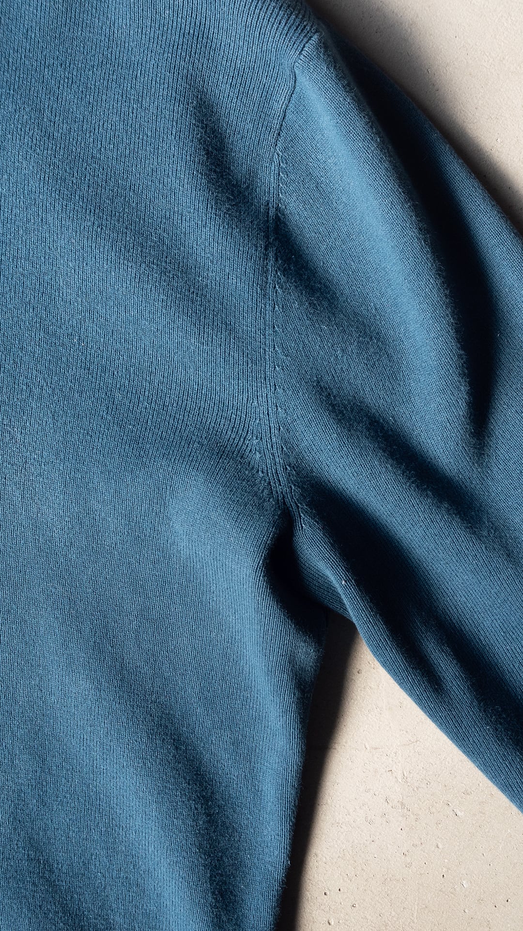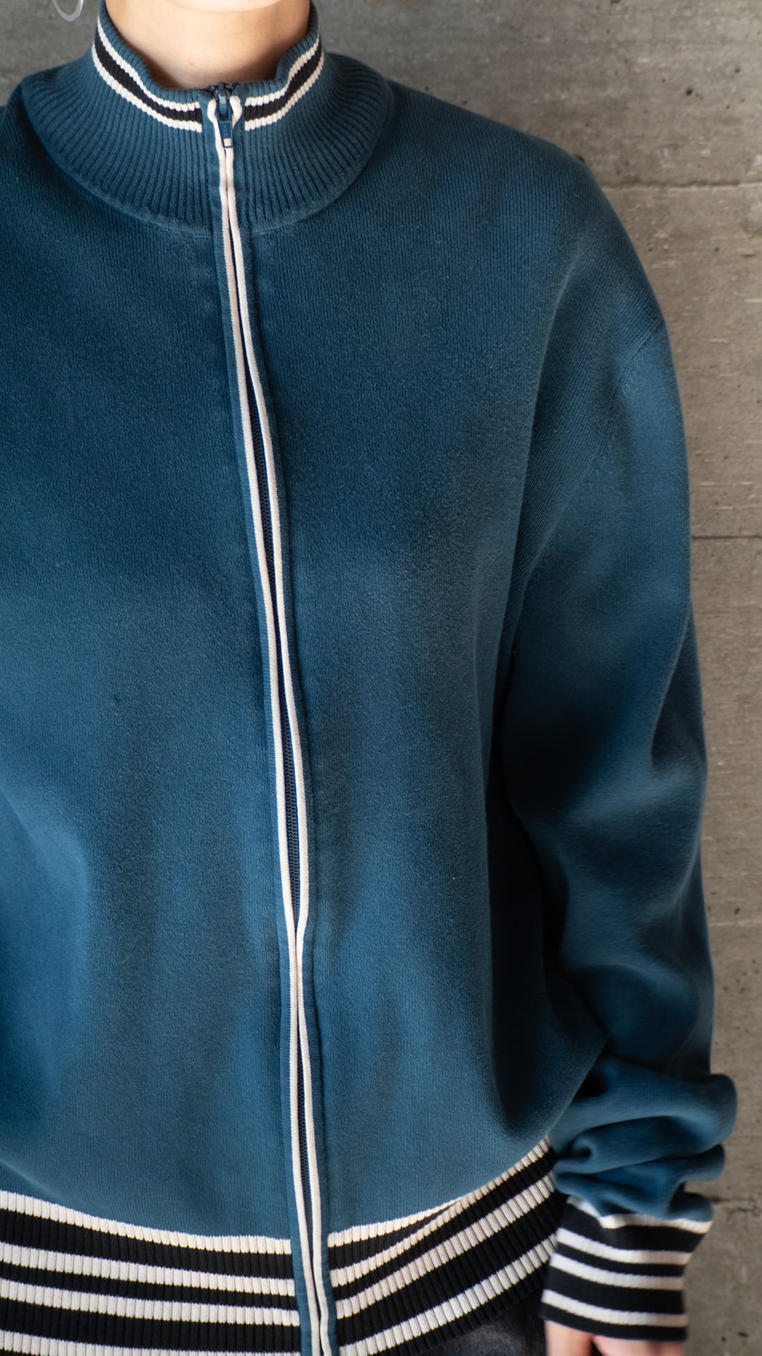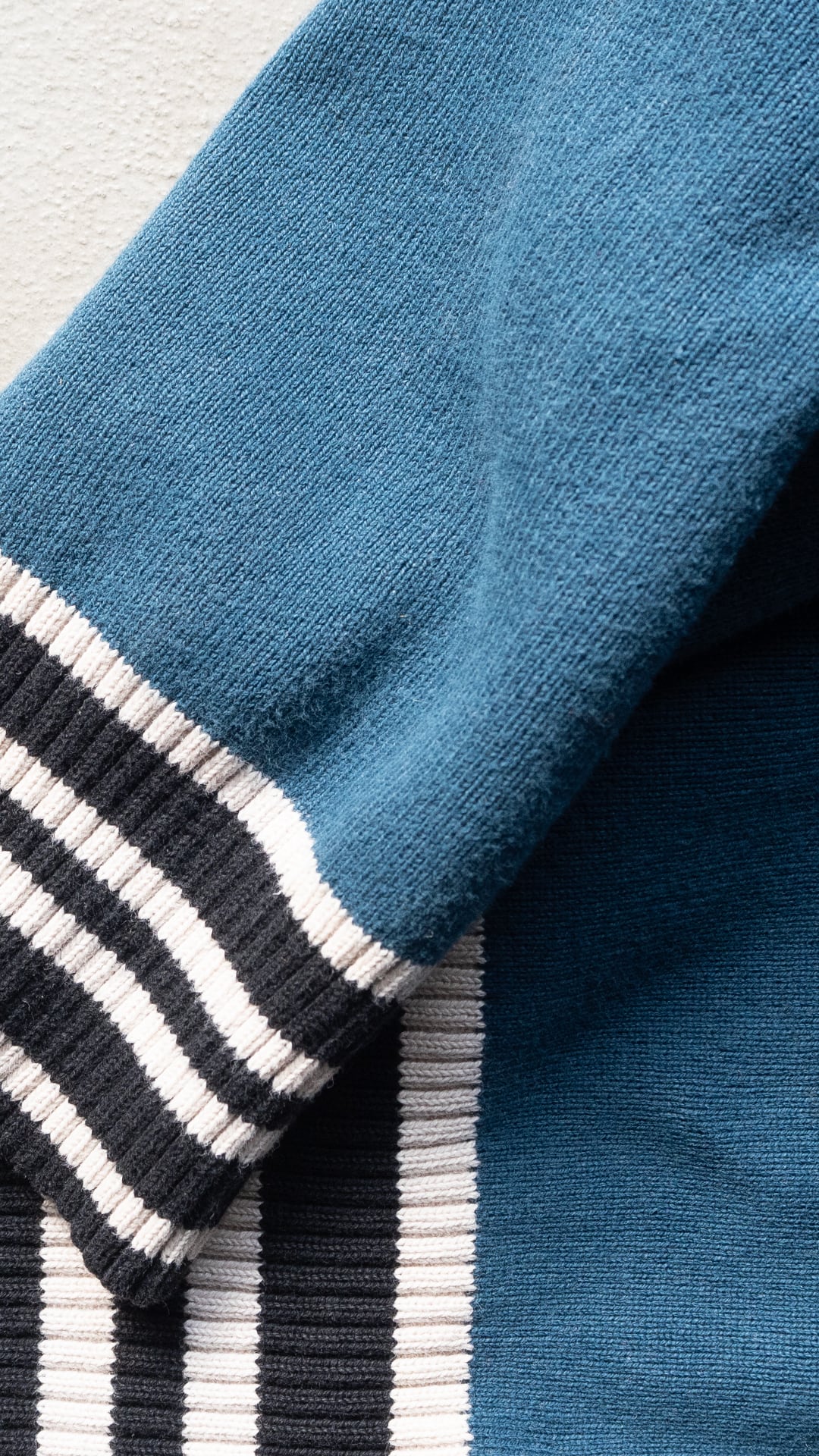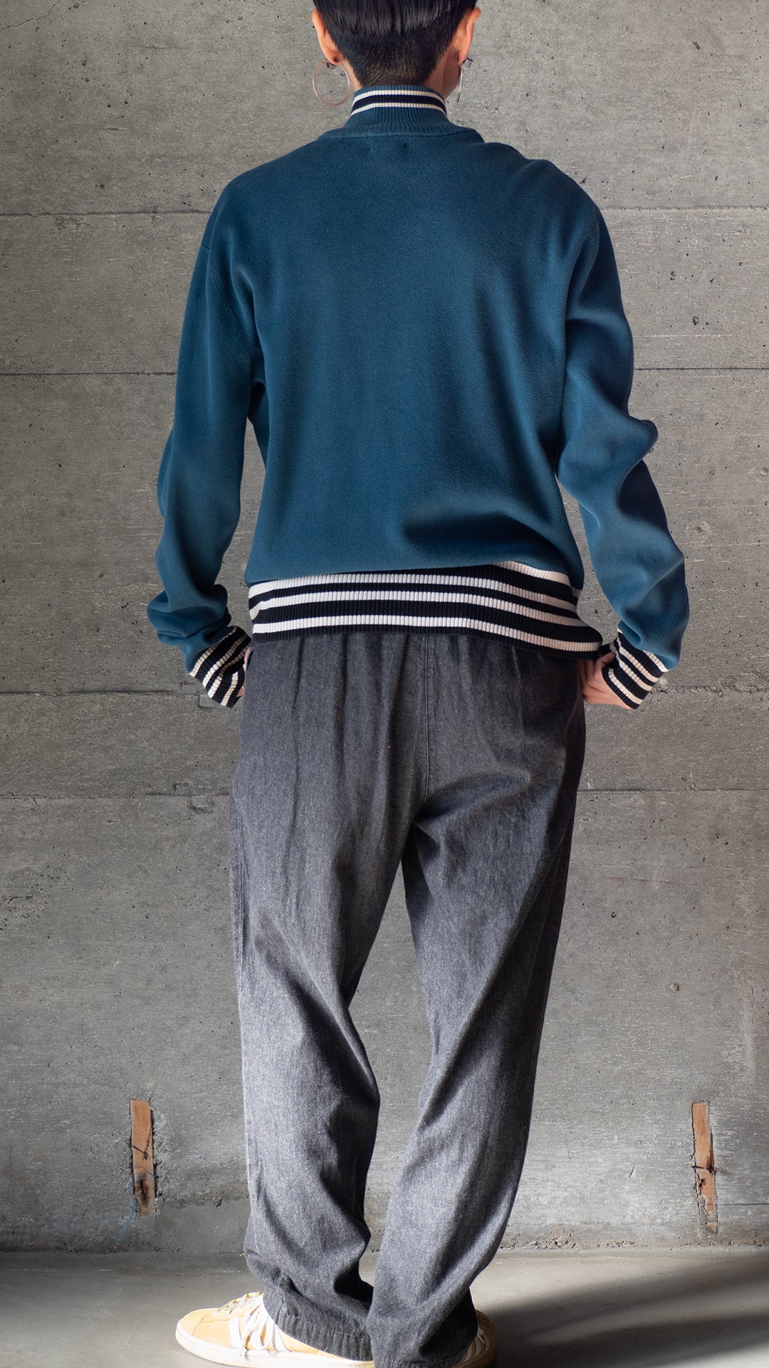 ボーダーリブの配色に惹かれ、セラストアでピックしました。このようなハイネックでジップトップ、肌に触れても心地よいコットンベース、そしてトリム柄のニットソーは、セラストアでのコーディネートに大変活躍します。トラッドなジャケットやコートスタイルを少し崩したり、牧歌的なニットやベストスタイルをちょっとモダンに見せたりする脇役アイテムとして幅広く活躍します。