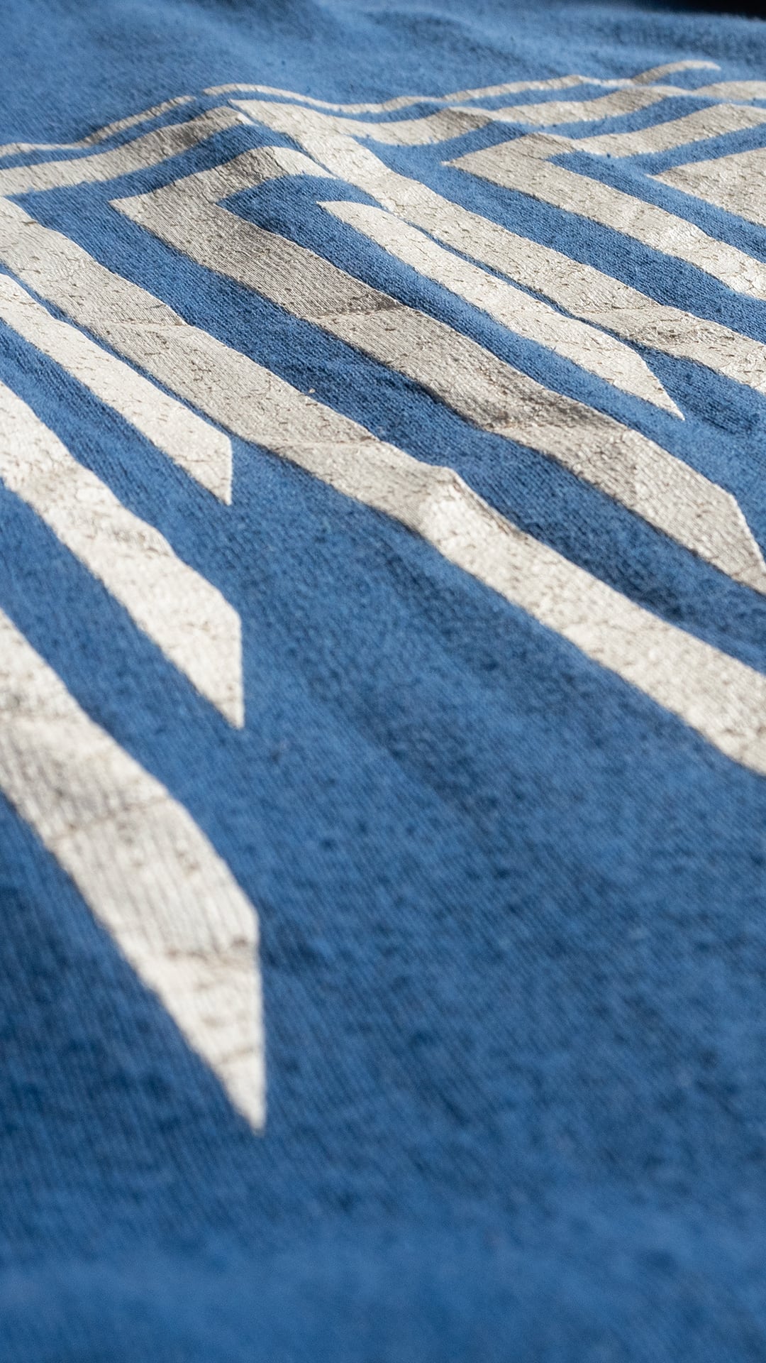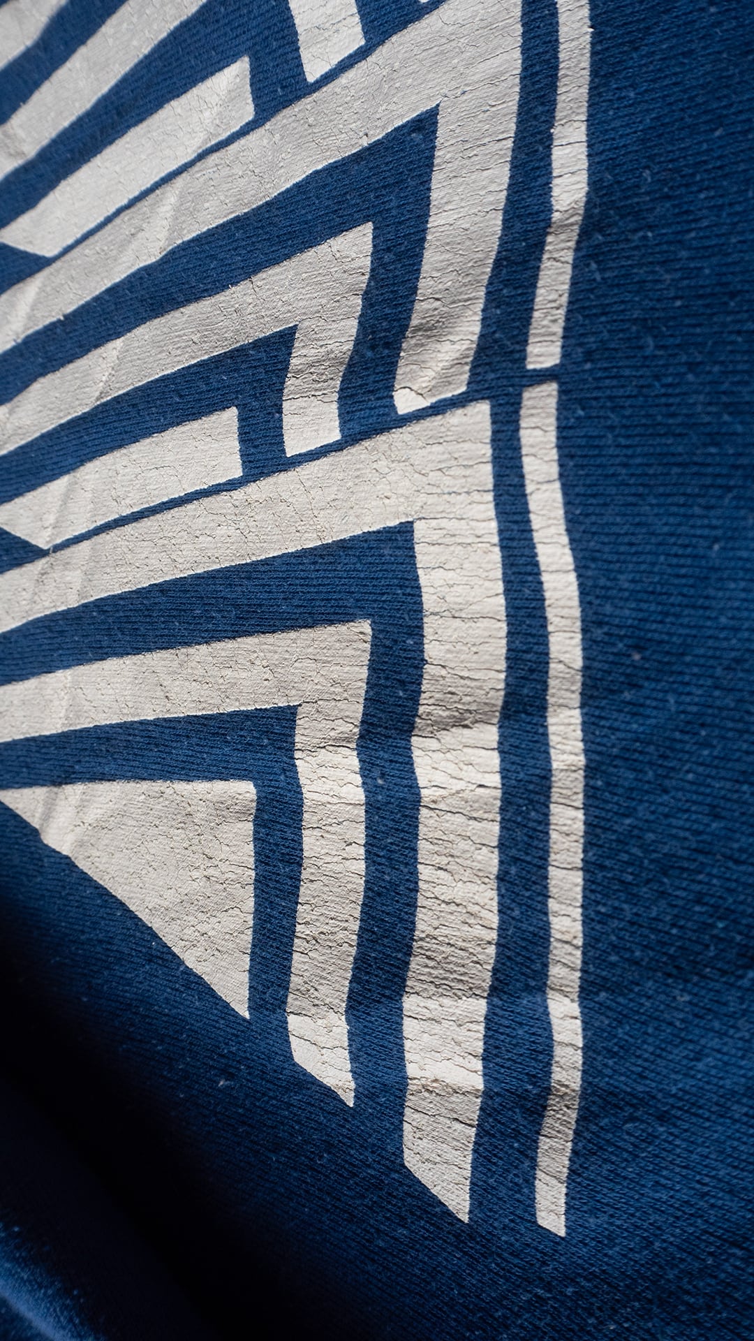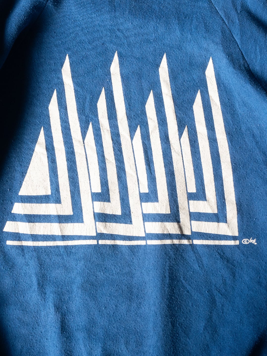 白い顔料プリントはひび割れていますが、鋭角を連ねたグラフィックの雰囲気は健在。米国流通のアイテムだけに、ヨットと水平線を限りなくデフォルメしたものでしょうか。