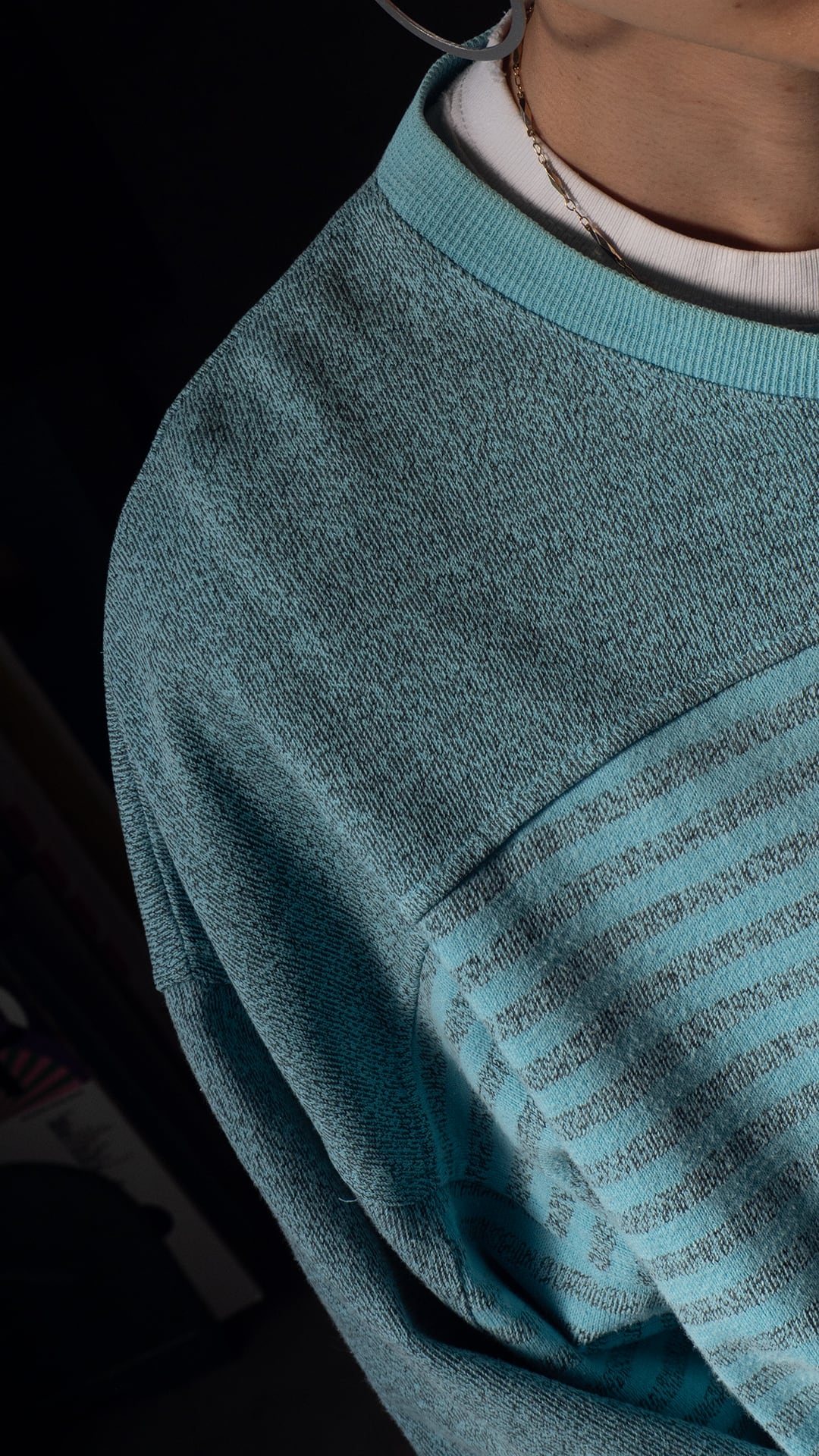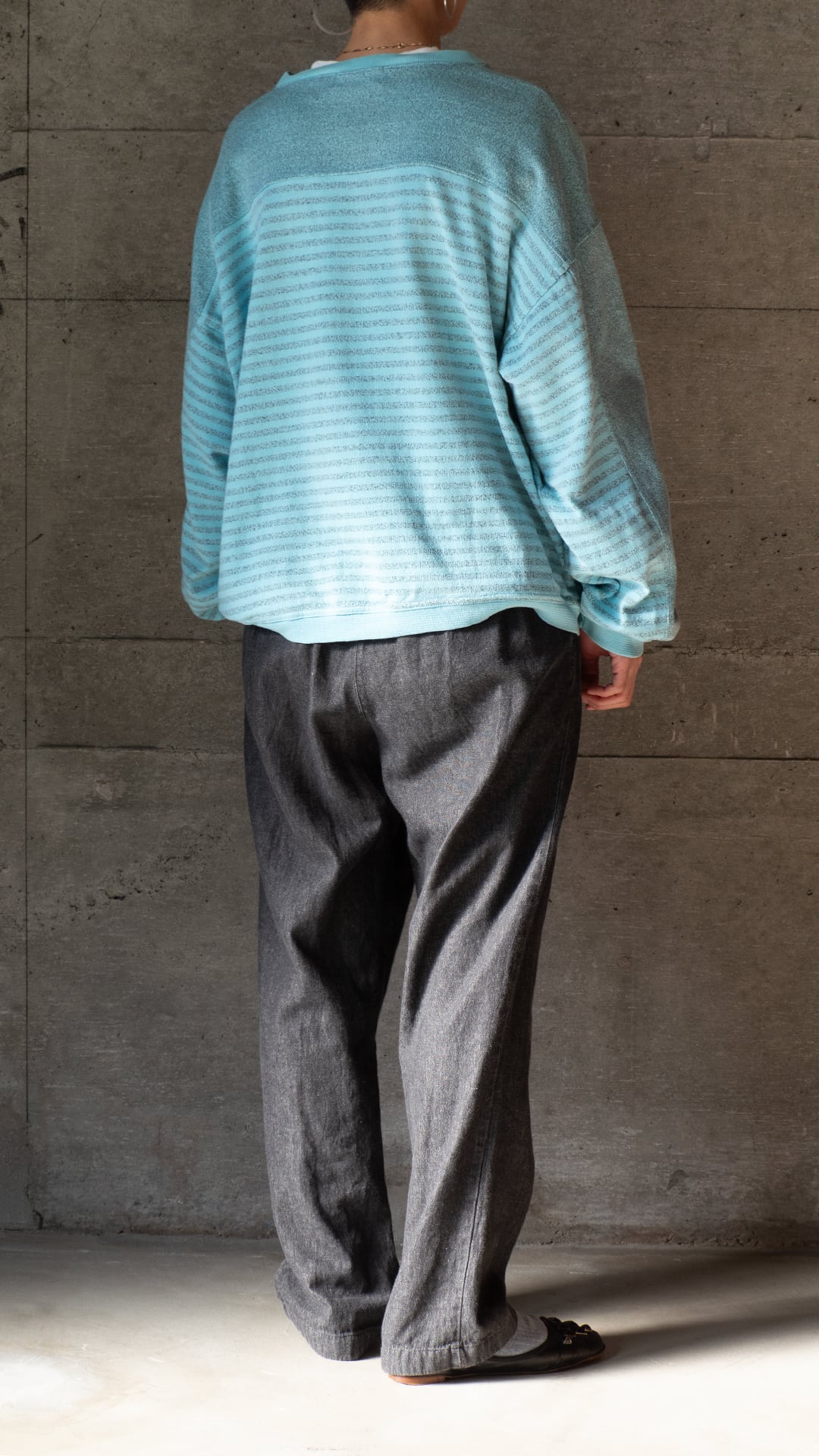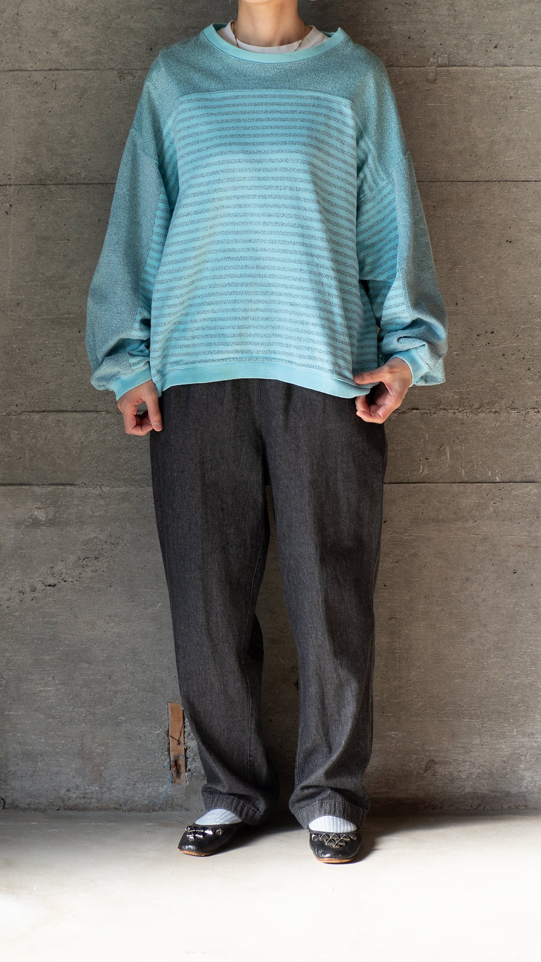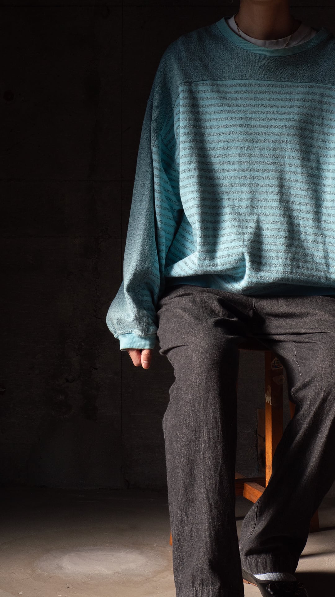 ライトグリーンベースの撚り杢糸を無地、ボーダーで編み分け、それぞれの生地を組み合わせることで仕立てたカットソーです。