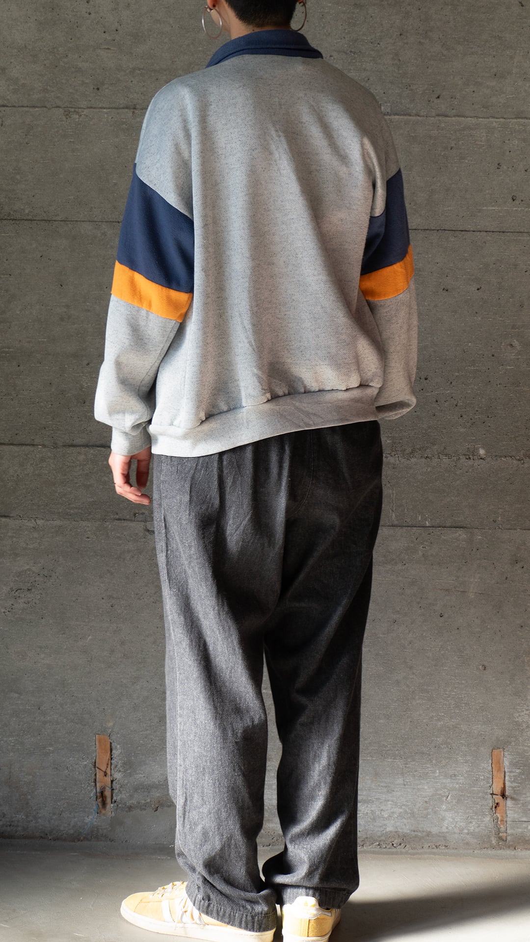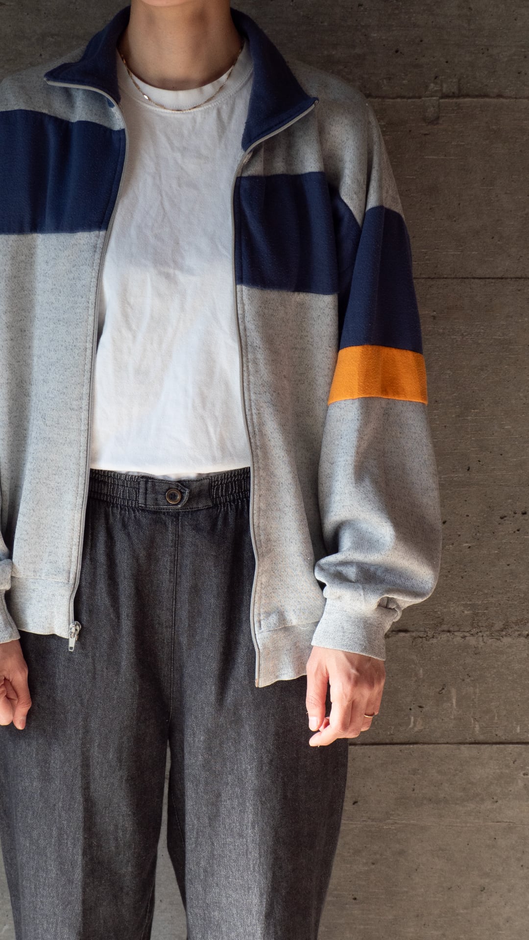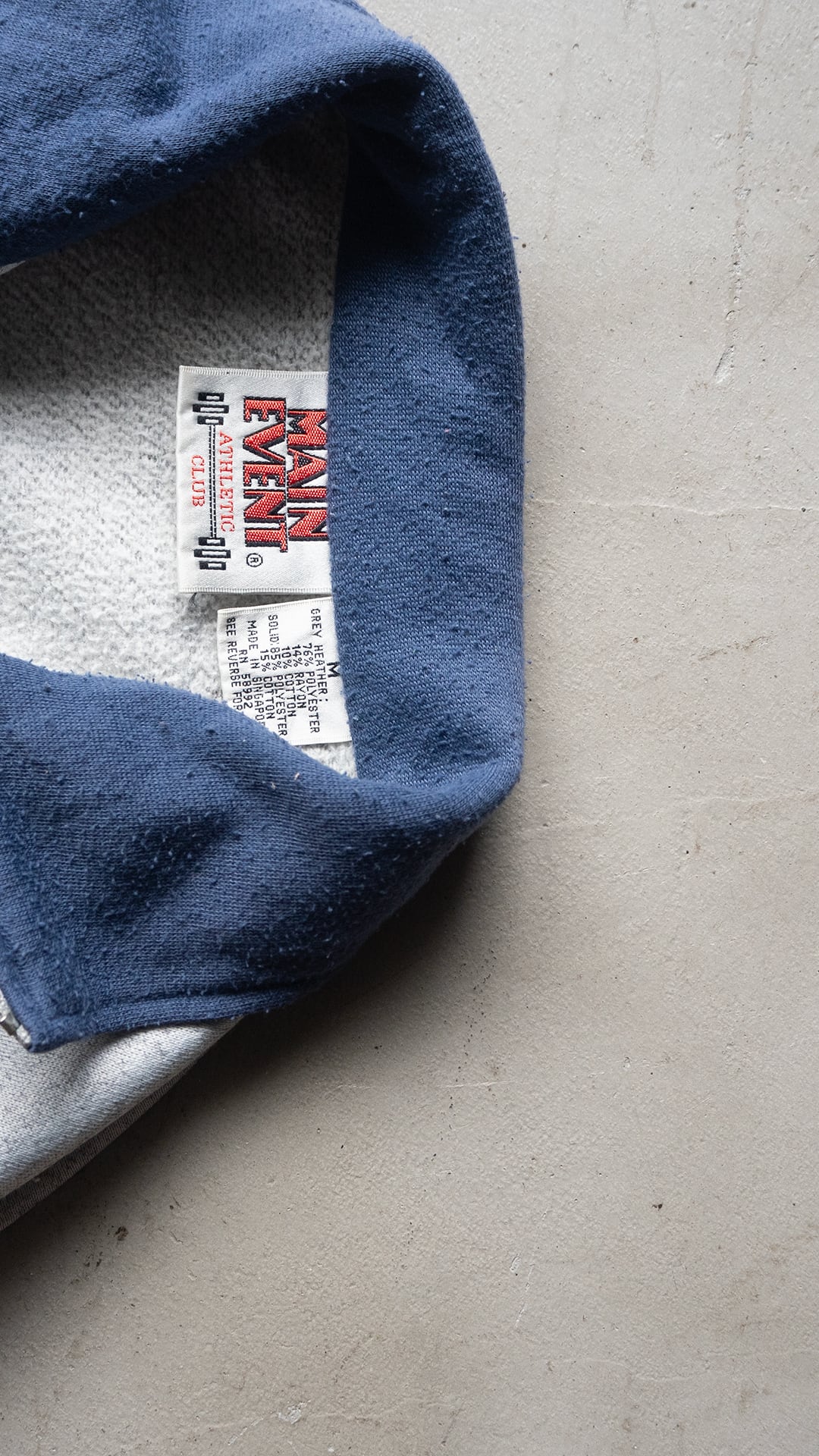 真鱈な杢糸で編み上げたスウェットをベースに、褪色したネイビーとイエロー、そして毛玉すら生地の雰囲気を高める要素に感じる、レトロスポーツなジップトップです。ブランドは「MAIN EVENT ATHLETIC CLUB」。すでに消滅している80年代頃の米国ローカルブランド。本個体は、80年代製と推定されるヴィンテージです。
