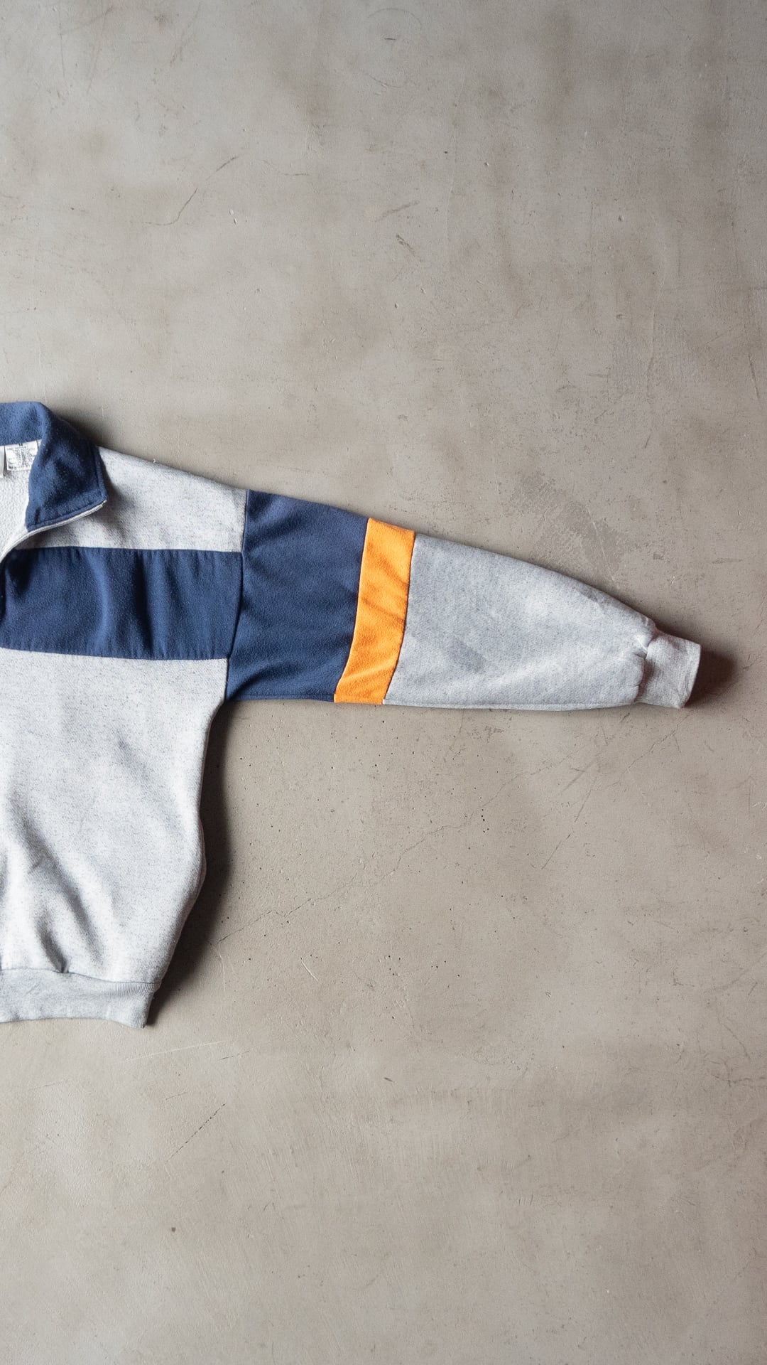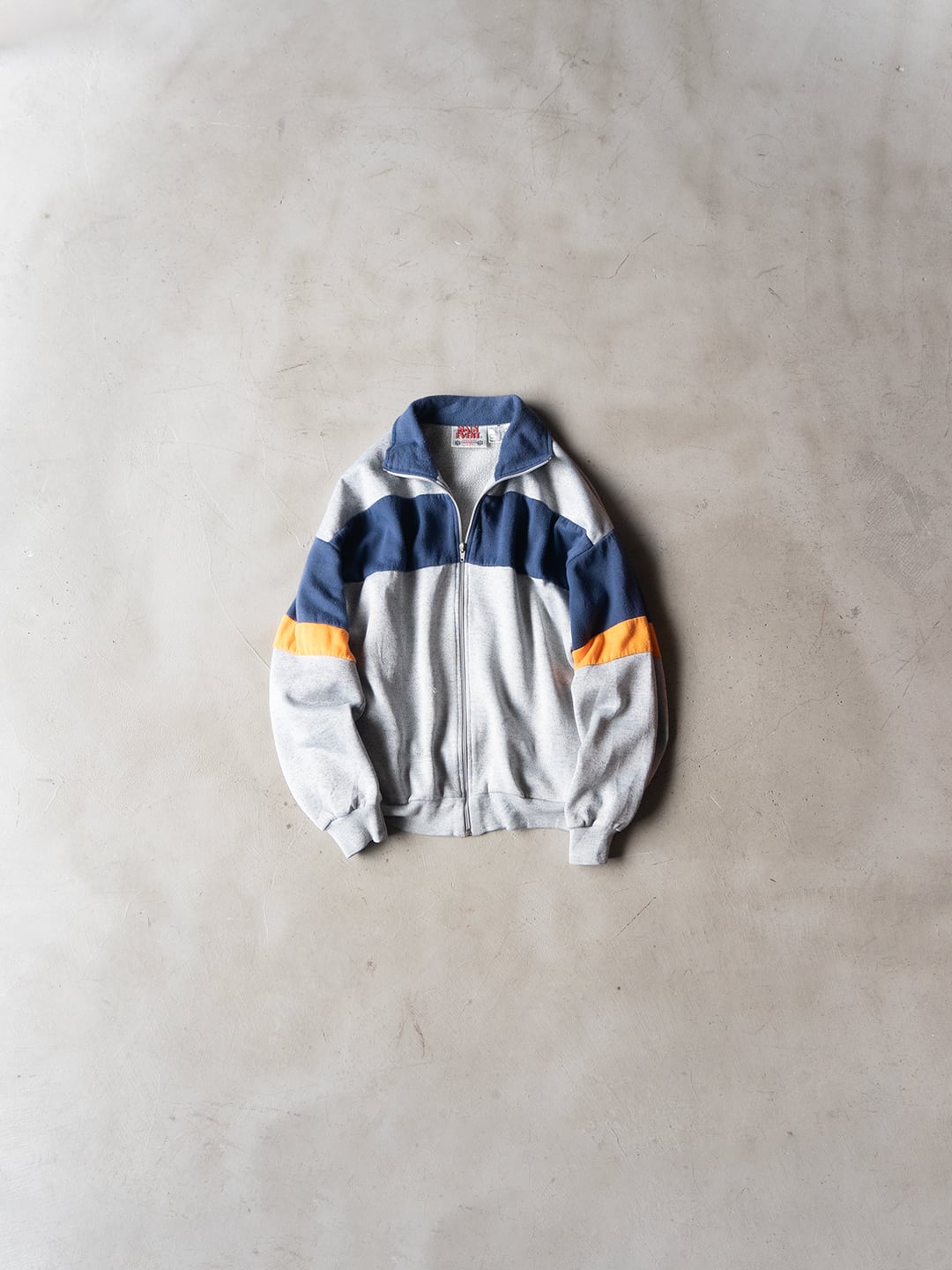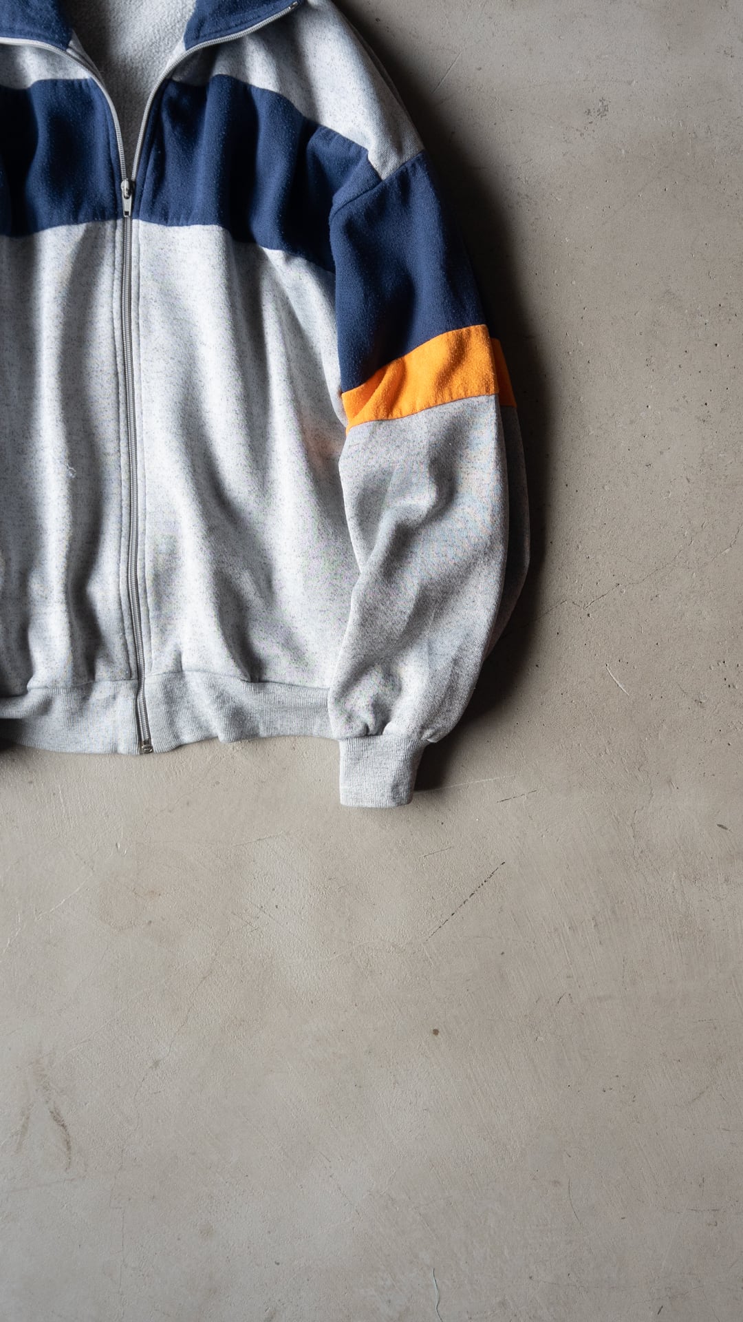 真鱈な杢糸で編み上げたスウェットをベースに、褪色したネイビーとイエロー、そして毛玉すら生地の雰囲気を高める要素に感じる、レトロスポーツなジップトップです。ブランドは「MAIN EVENT ATHLETIC CLUB」。すでに消滅している80年代頃の米国ローカルブランド。本個体は、80年代製と推定されるヴィンテージです。