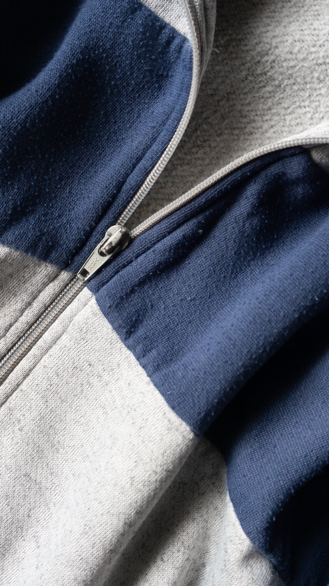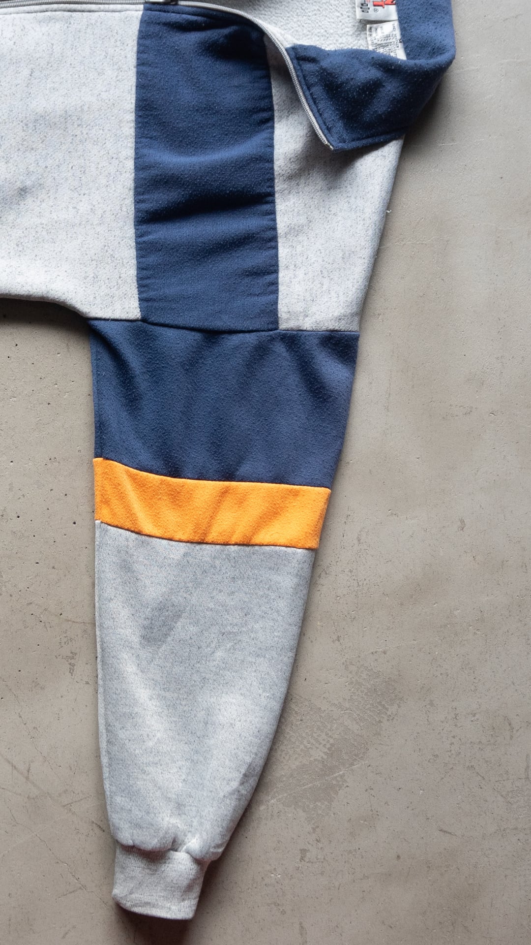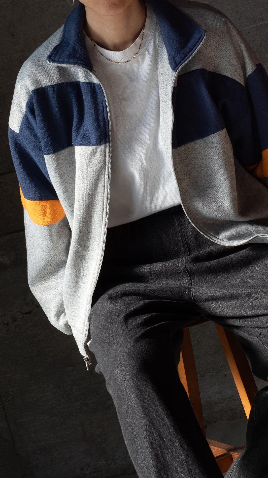 この年代らしいカラーブロックのスポーツデザインで、それぞれ縫製で剥ぎ合わせてあります。フロントジップで両腰にシームポケットがあります。