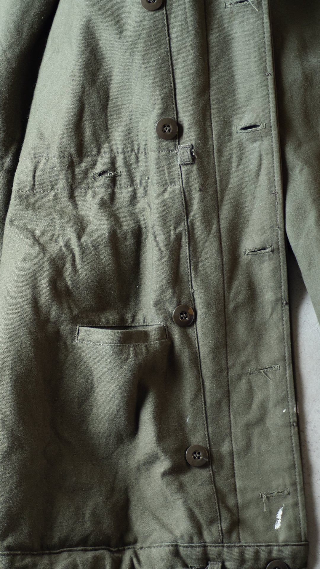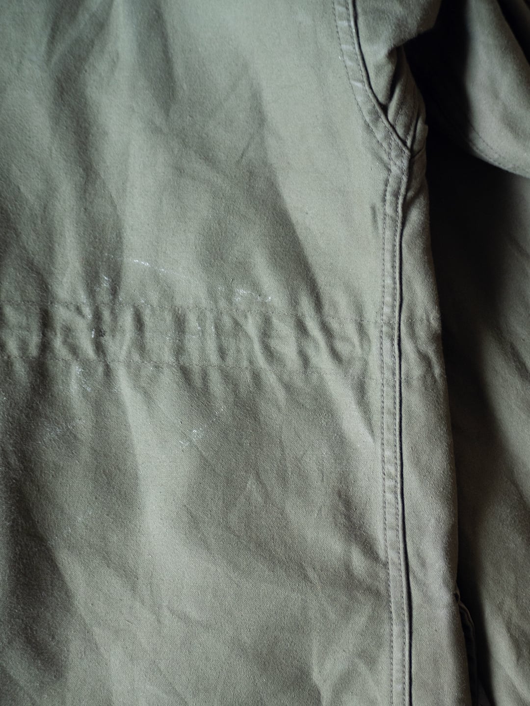 左前身頃の下部の裾が15cmほど破れていることが懸念されるかとも思いますが、ヴィンテージらしい個体が辿った轍として受け止めていただければと思います。高密度なサテンクロスになるため、ほつれが進行することは多少はあっても、洗うたびに糸の解撚が留めの役割を果たし、ほつれが進行しても負荷を加えなければ数ミリ程度だと思います。