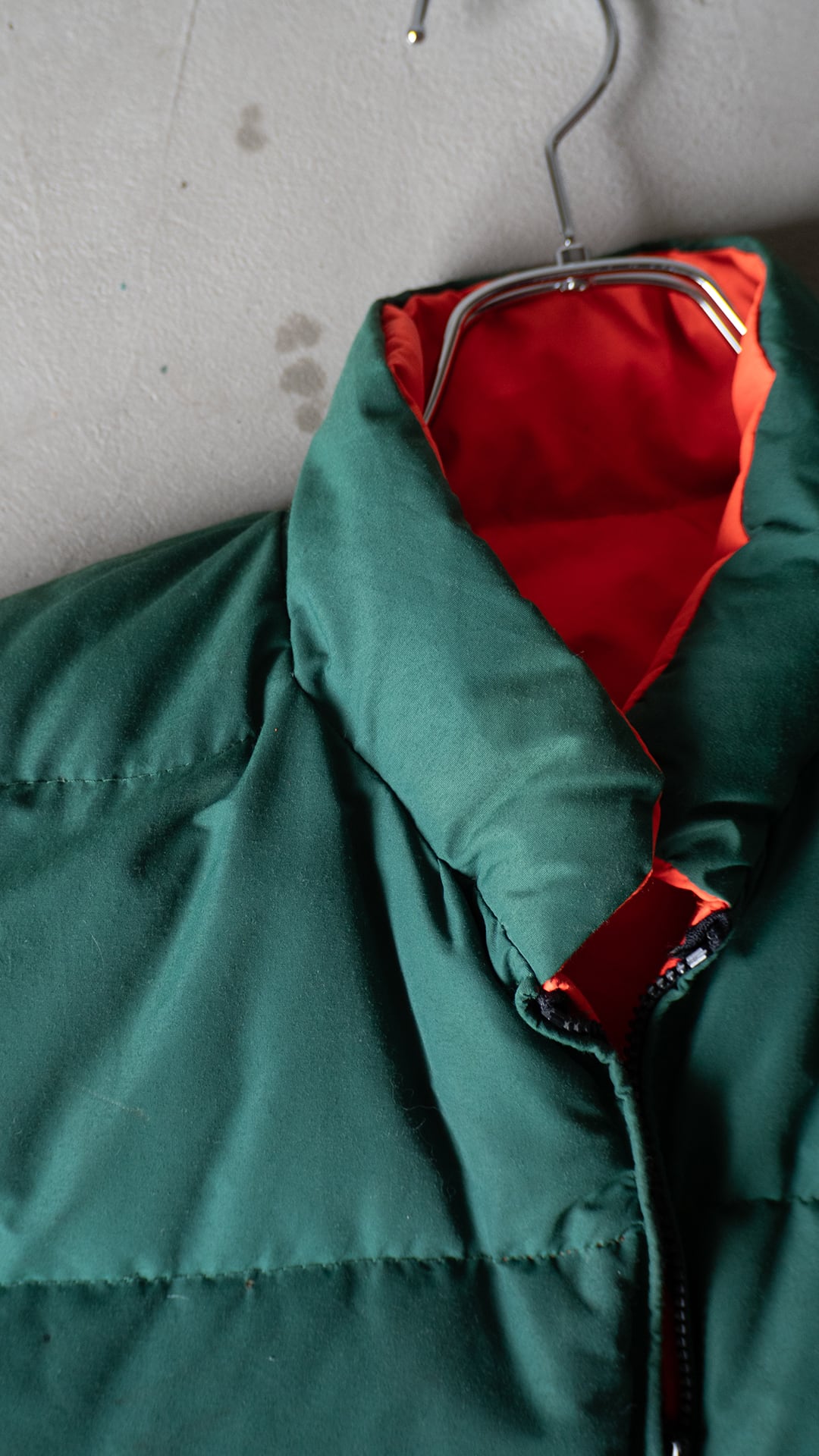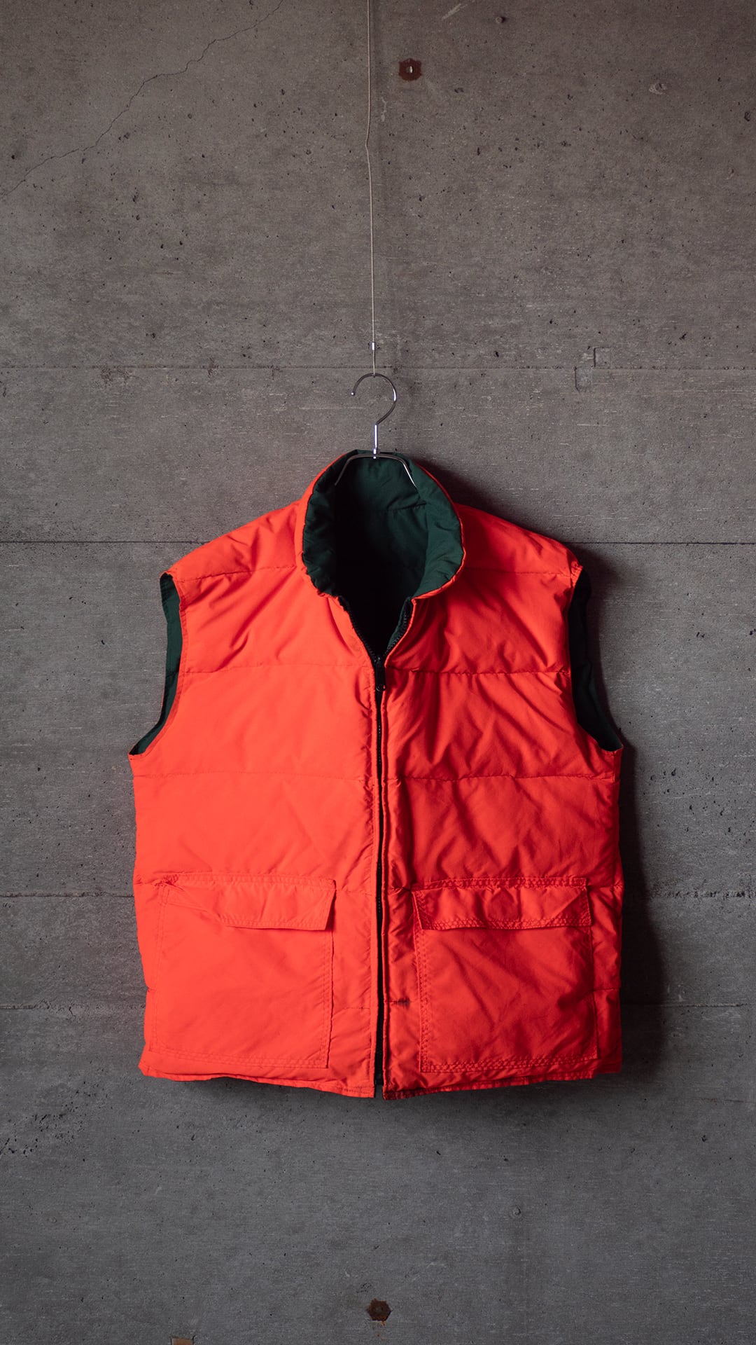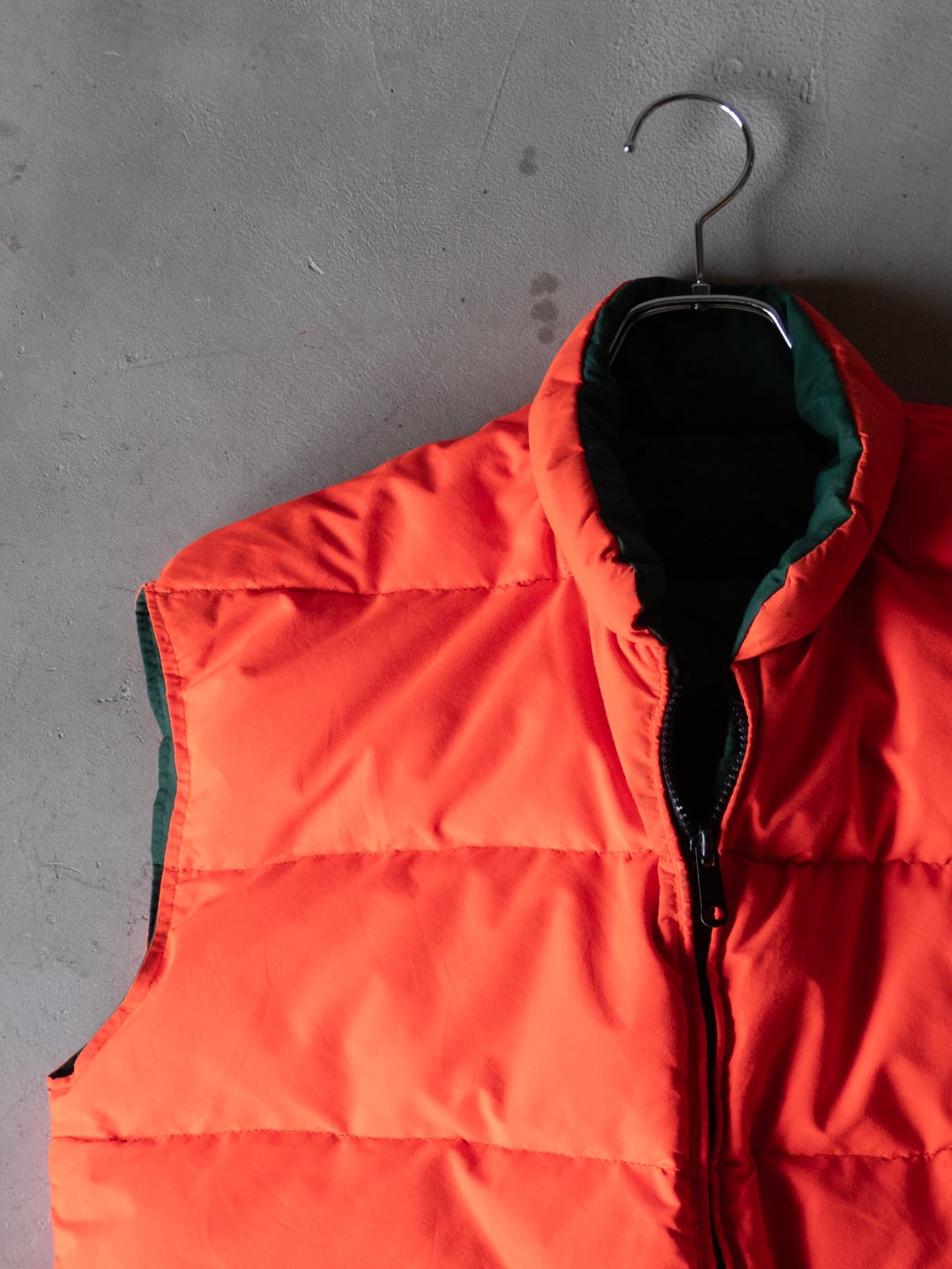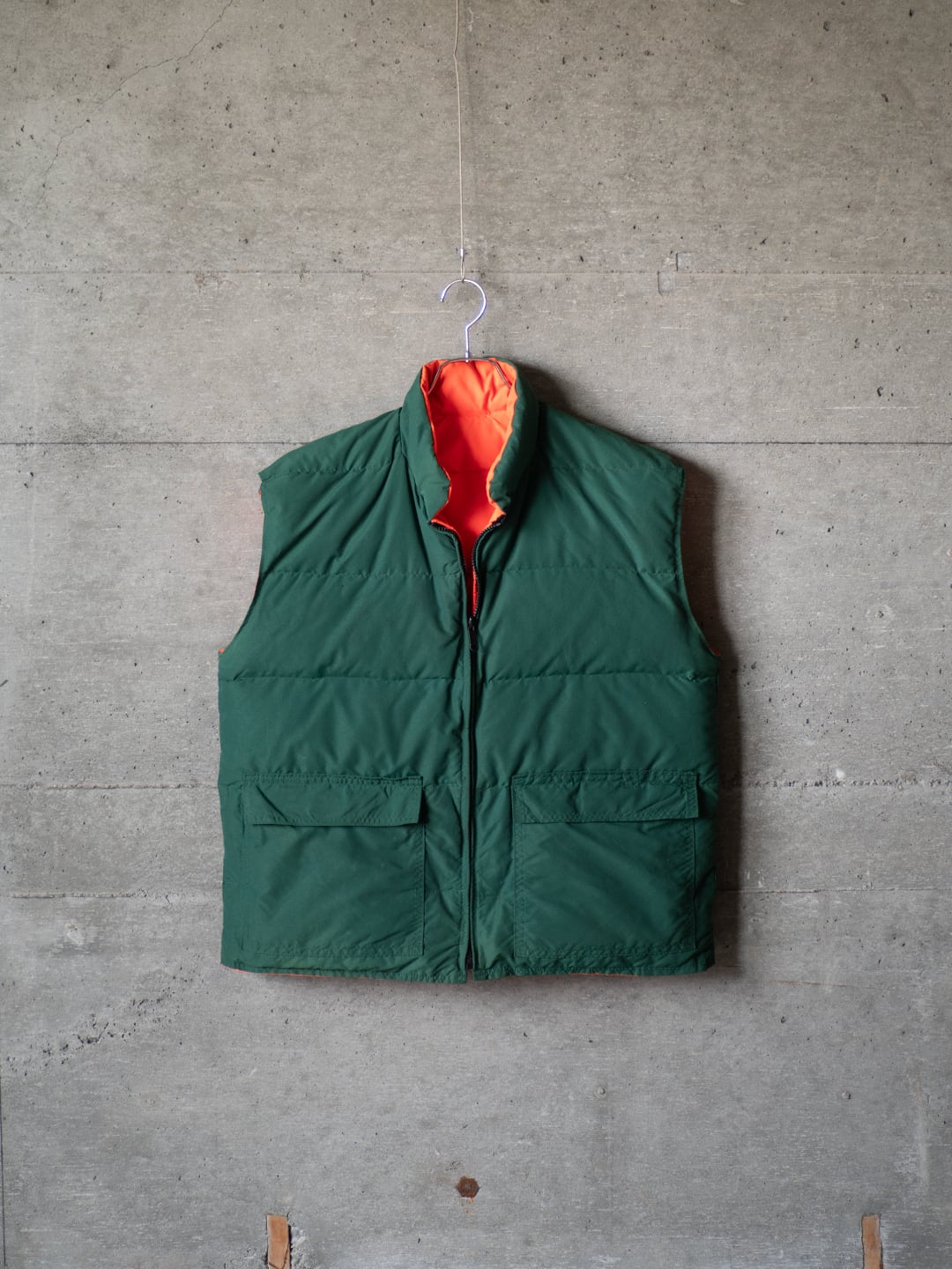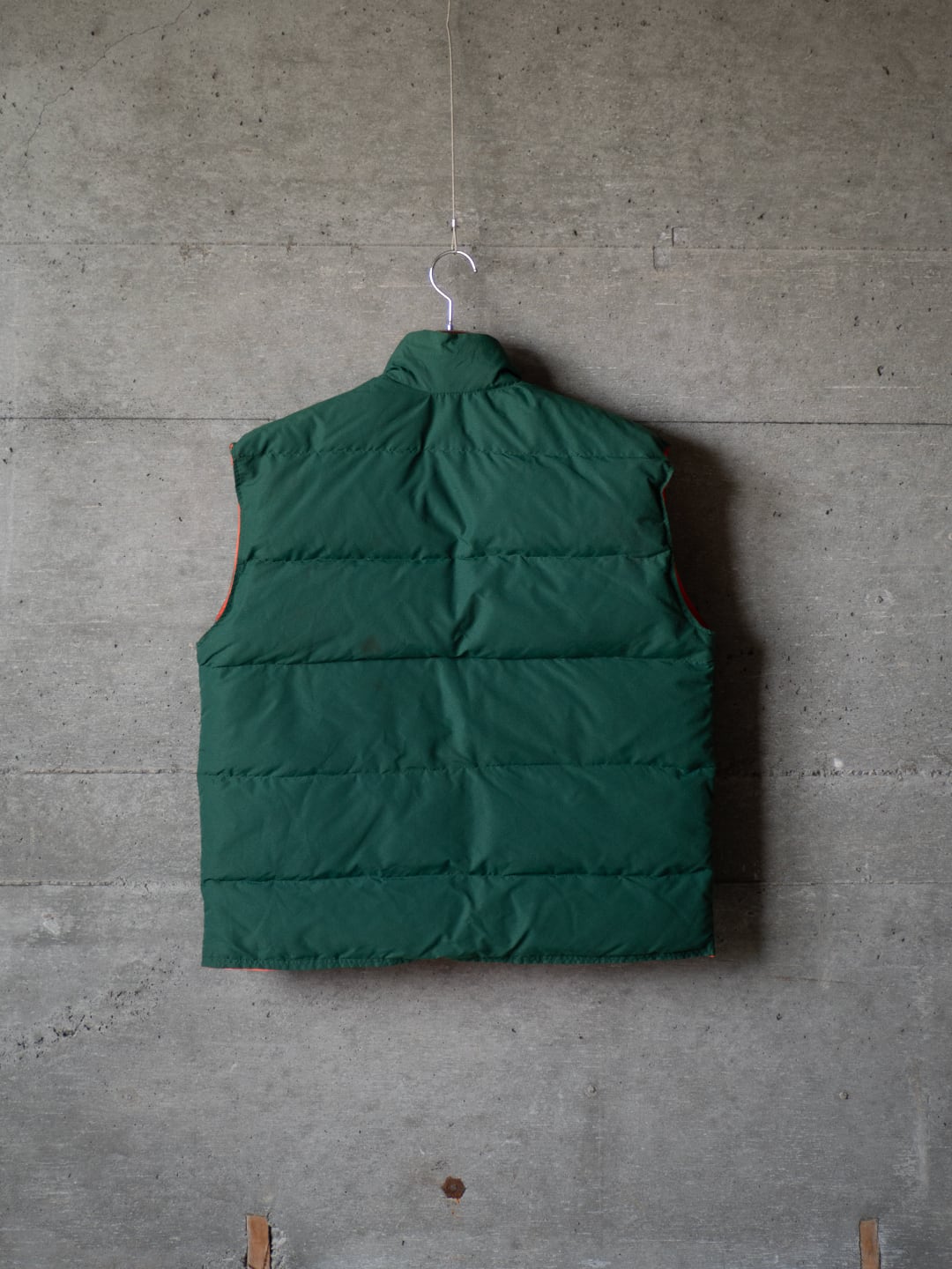 今回セラストアでピックしたいベストは、両面がナイロン100%のシェル。この時代のナイロン織物らしい、やや乾いた感じですがマットな質感のオックス組織です。そして色、ダークグリーンとオレンジ色というカラーの組み合わせに大変惹かれました。四角い形はやや肩幅を強調させますが、まさにオールドなシルエットを感じるポイントです。腰あたりにくる中綿の分量を(意図的にか、結果的にかは真偽不明)減らしているのも特徴です。
