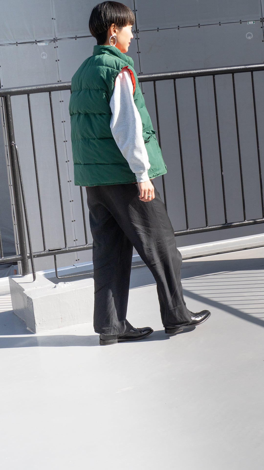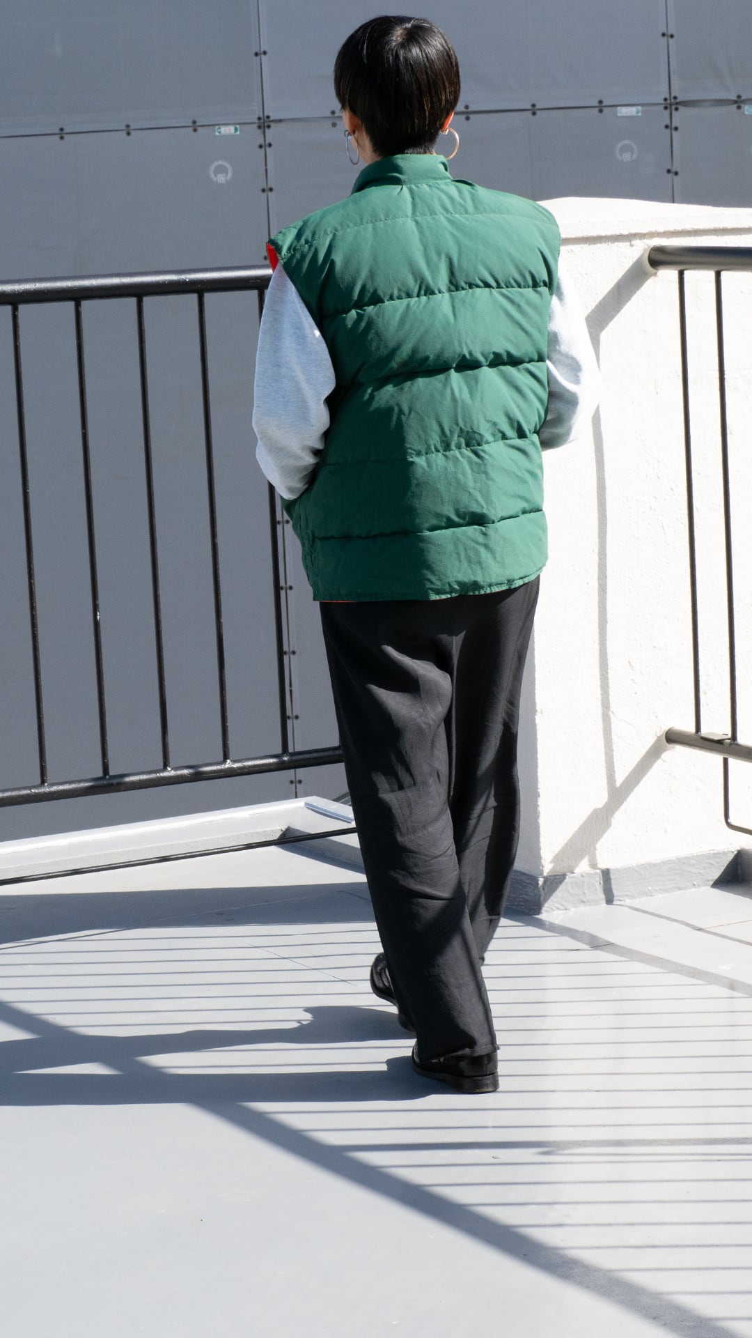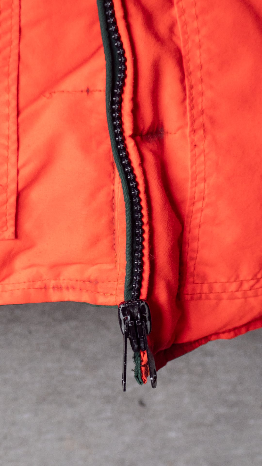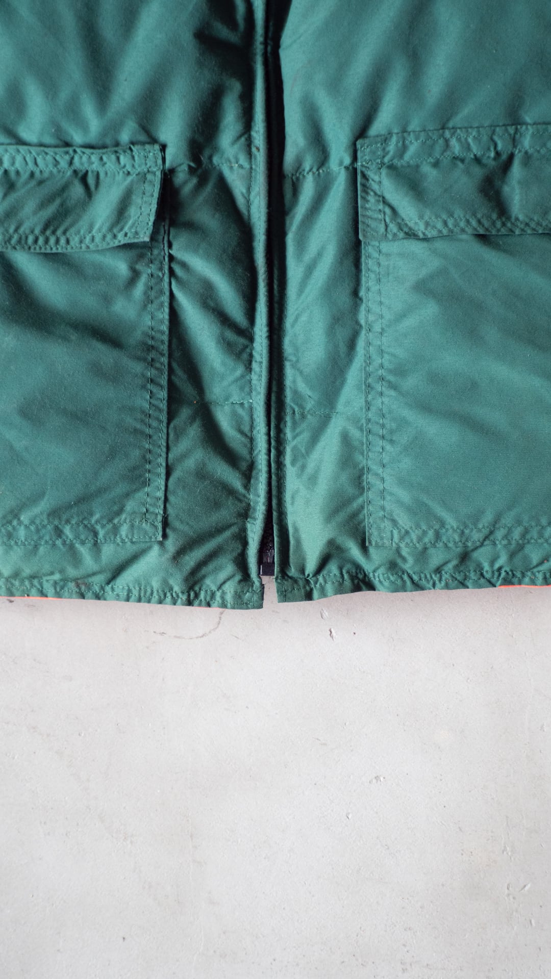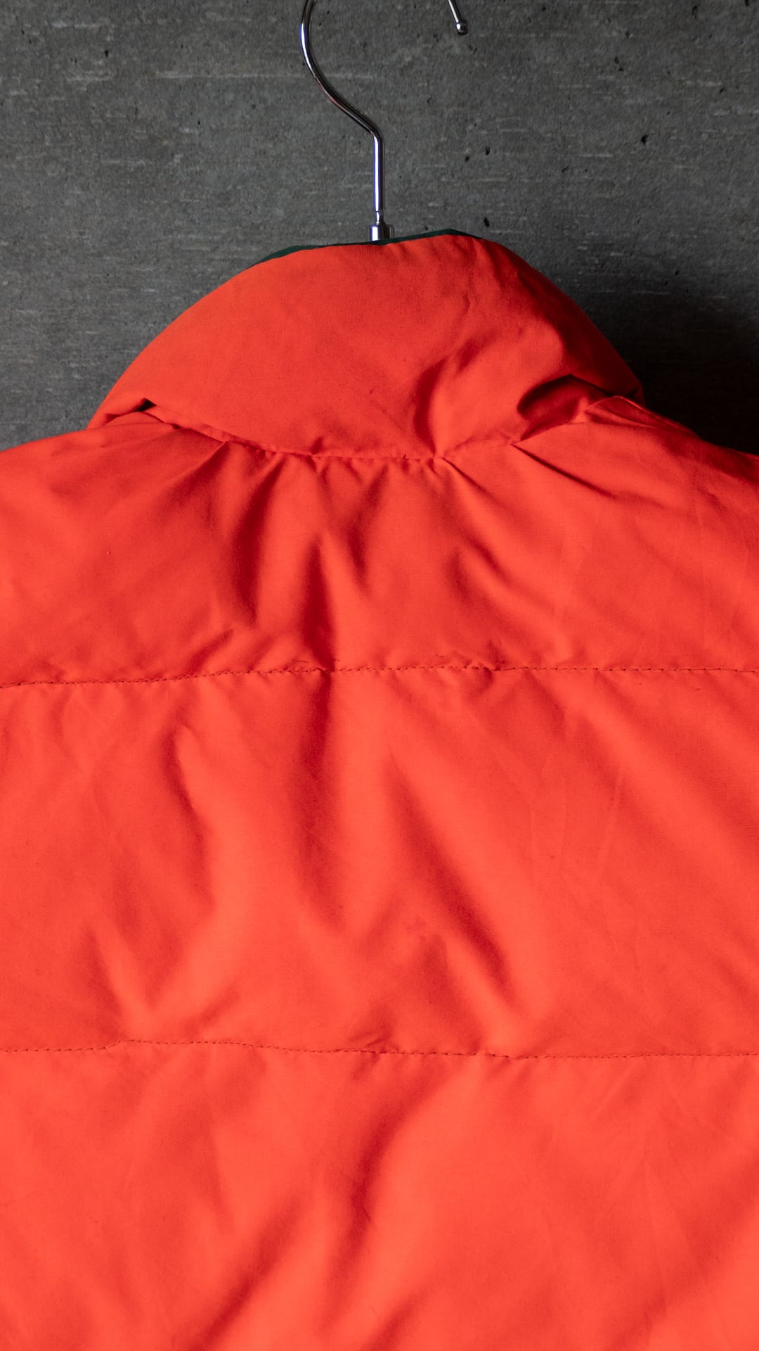 今回セラストアでピックしたいベストは、両面がナイロン100%のシェル。この時代のナイロン織物らしい、やや乾いた感じですがマットな質感のオックス組織です。そして色、ダークグリーンとオレンジ色というカラーの組み合わせに大変惹かれました。四角い形はやや肩幅を強調させますが、まさにオールドなシルエットを感じるポイントです。腰あたりにくる中綿の分量を(意図的にか、結果的にかは真偽不明)減らしているのも特徴です。