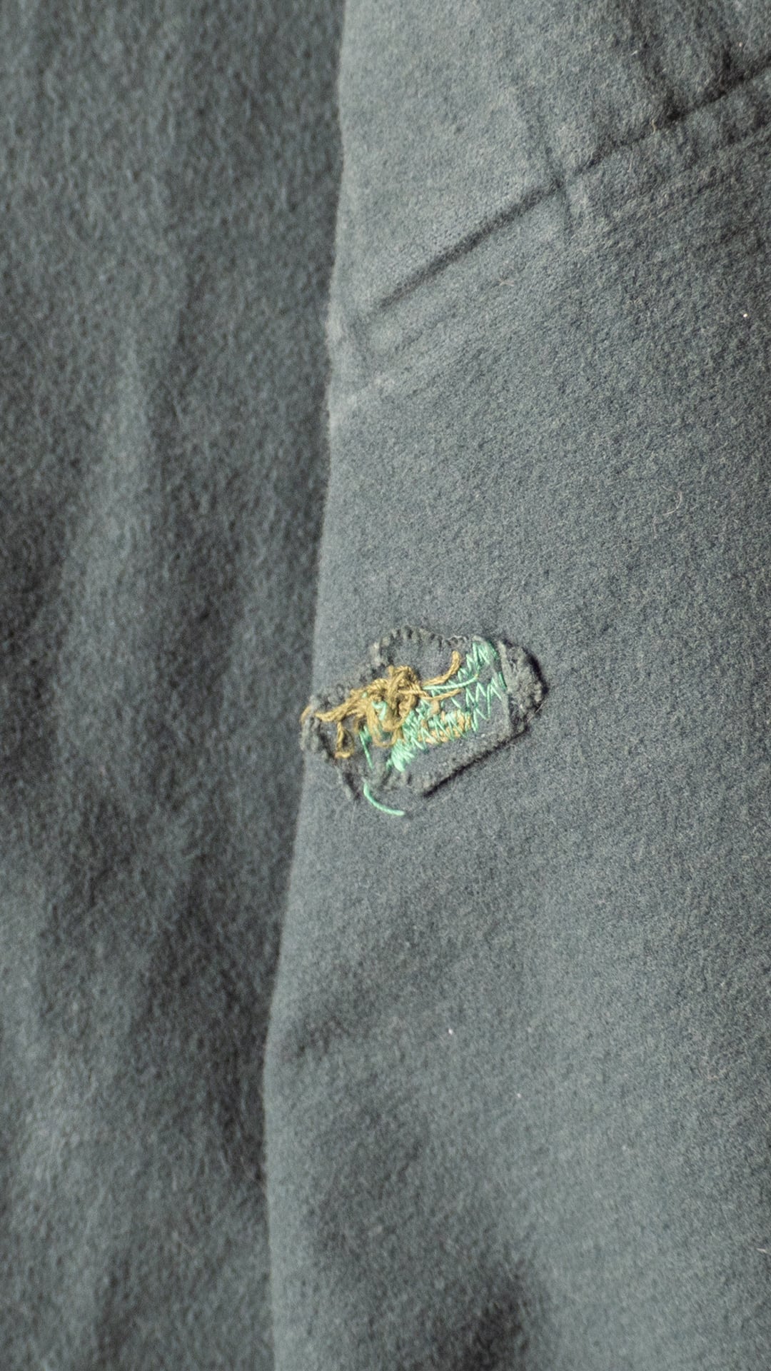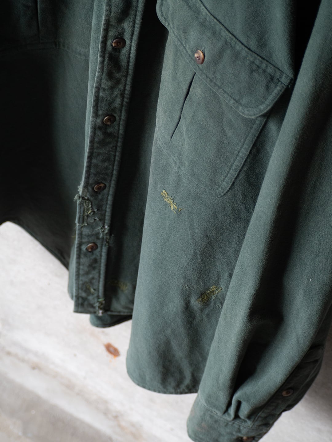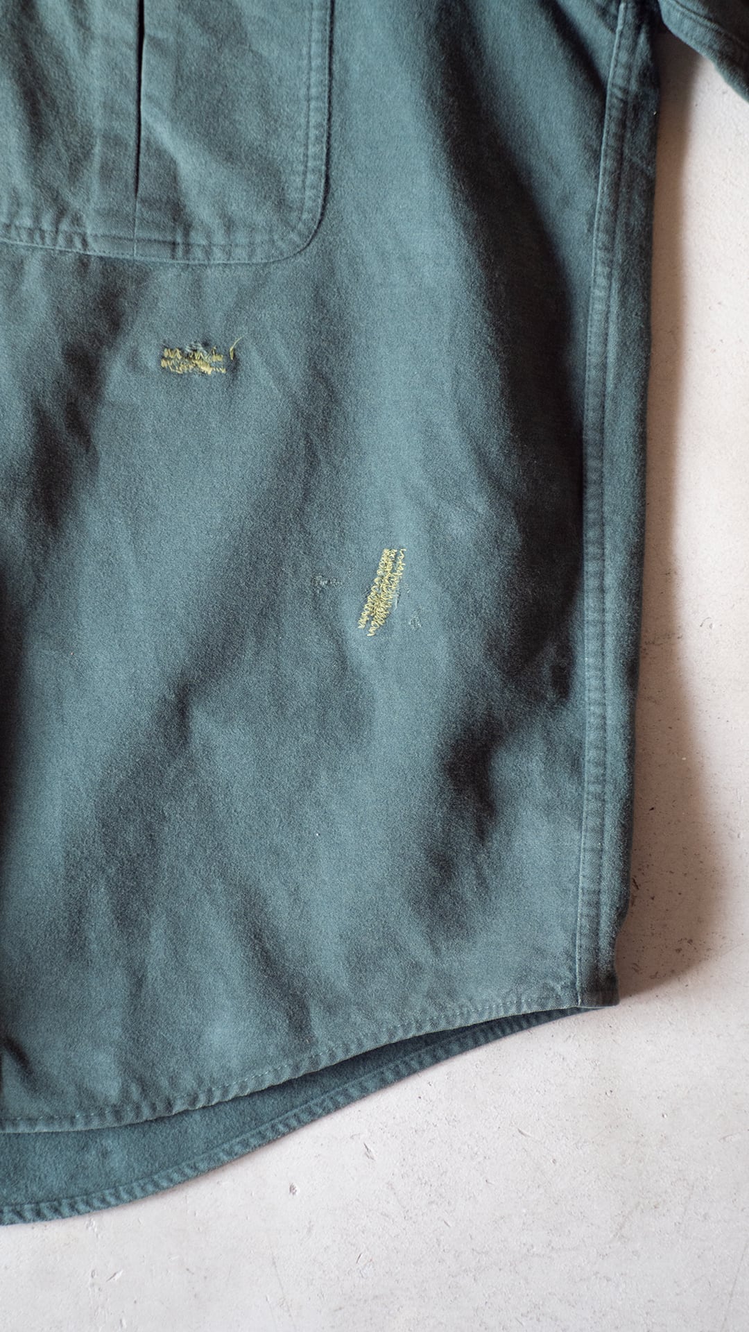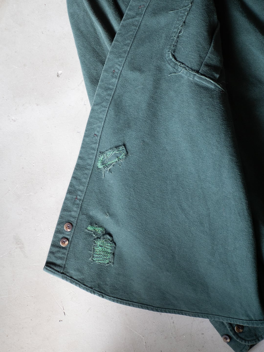 このシャツはダメージが多数ありますが、右胸ポケットの向こう布をくり抜いて、その生地を当て布として丁寧にリペアされています。