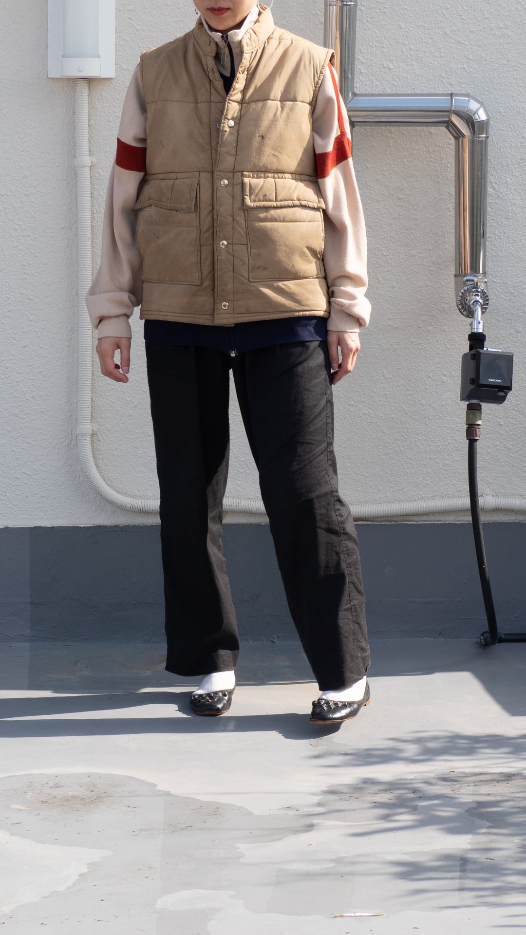 オールドアメリカン、ヴィンテージワークウェアと言った、このベストにしか出せない雰囲気を読み取り、ベクトルの異なる服と着合わせて、自分オリジナルのスタイルを作ってみていただきたいです。