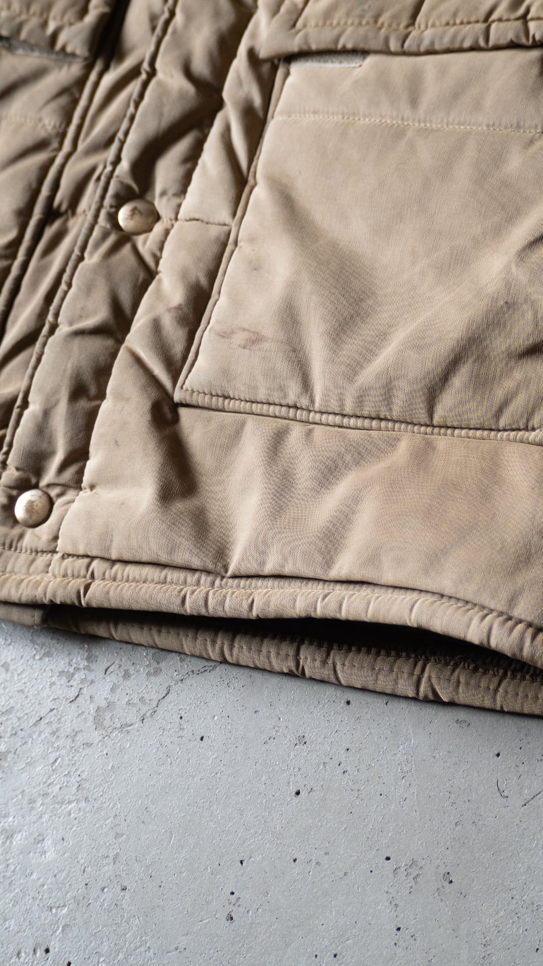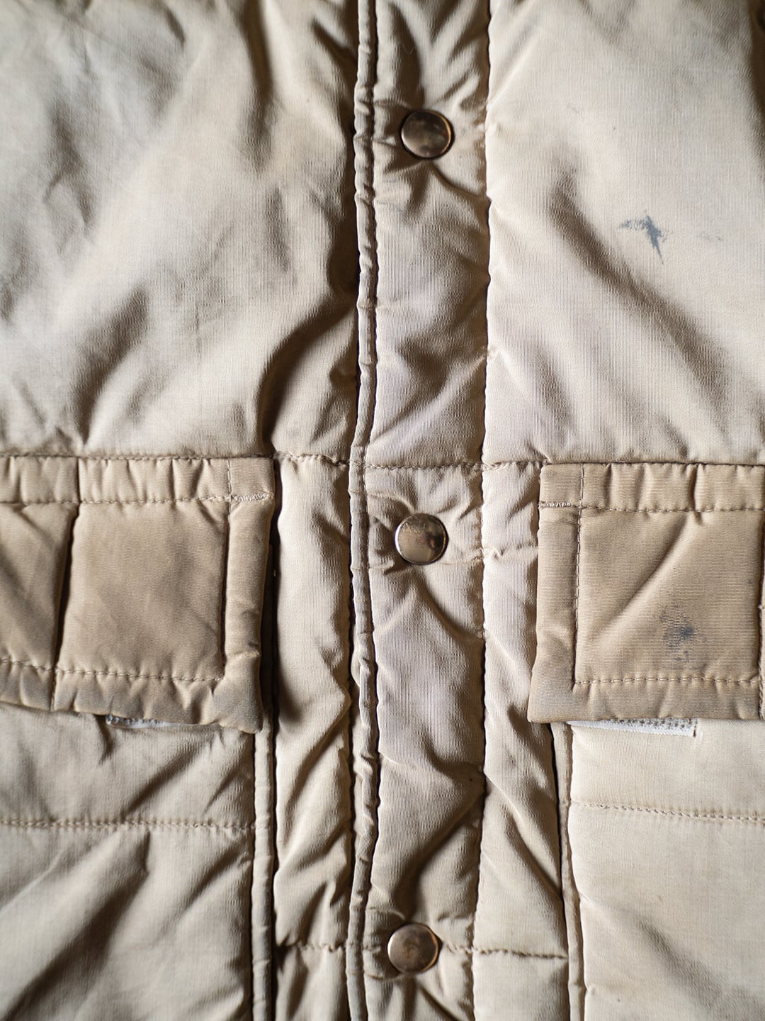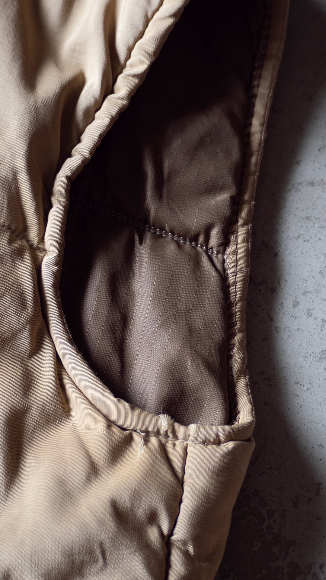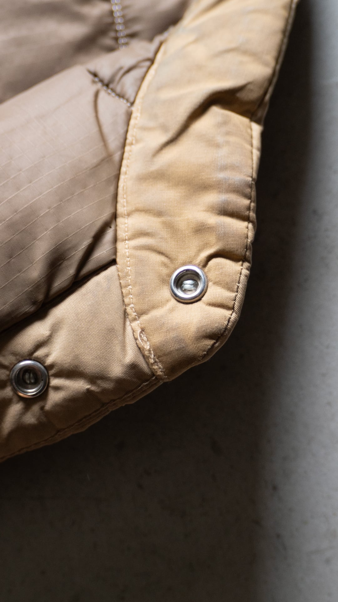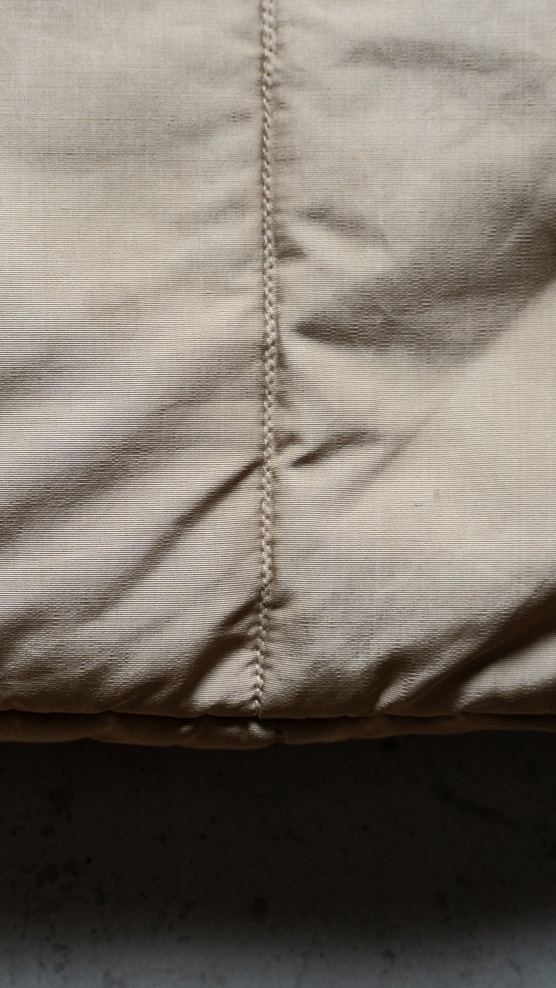 シェルの60/40クロスはコットン60%・ナイロン40%の混紡糸で織り上げた高密度平織り生地です。織り密度の高さや、現時点でもしっかりと張りと腰が保たれ握った時の堅牢感も健在で本当に良い生地だと思います。スタンドネックでドットボタン、両腰にはフラップ付きの2WAYポケットが配備されています。キルティングステッチはいずれの箇所もダブルステッチ、本縫いミシンを2度走らせた手間のかかる仕様が落とし込まれています。