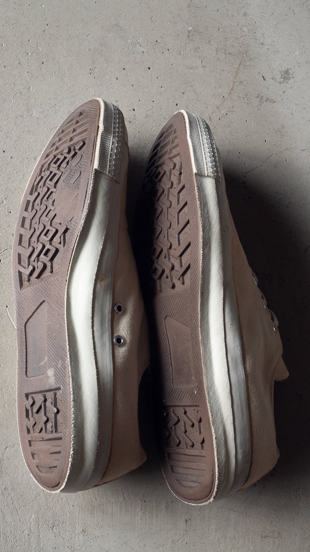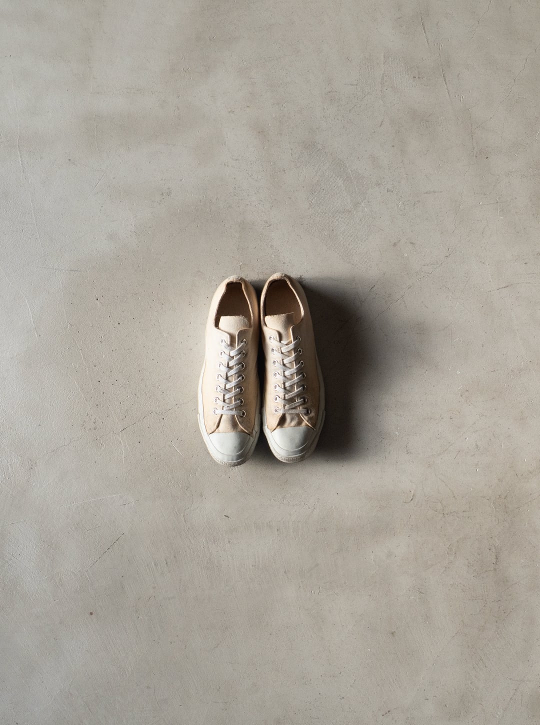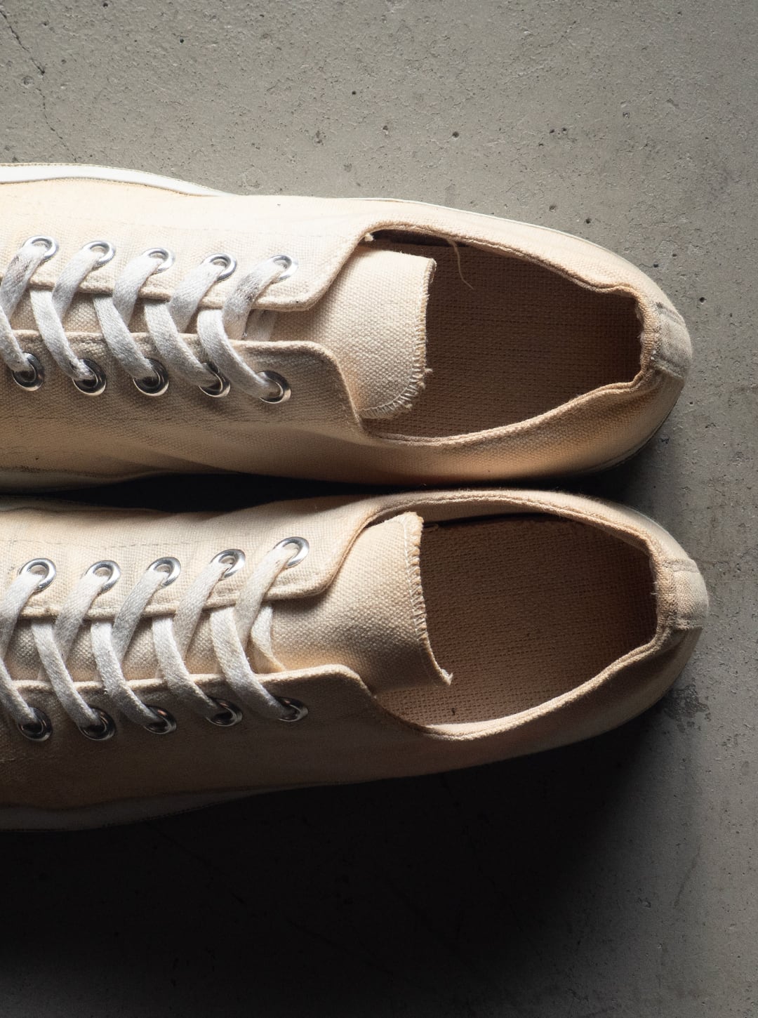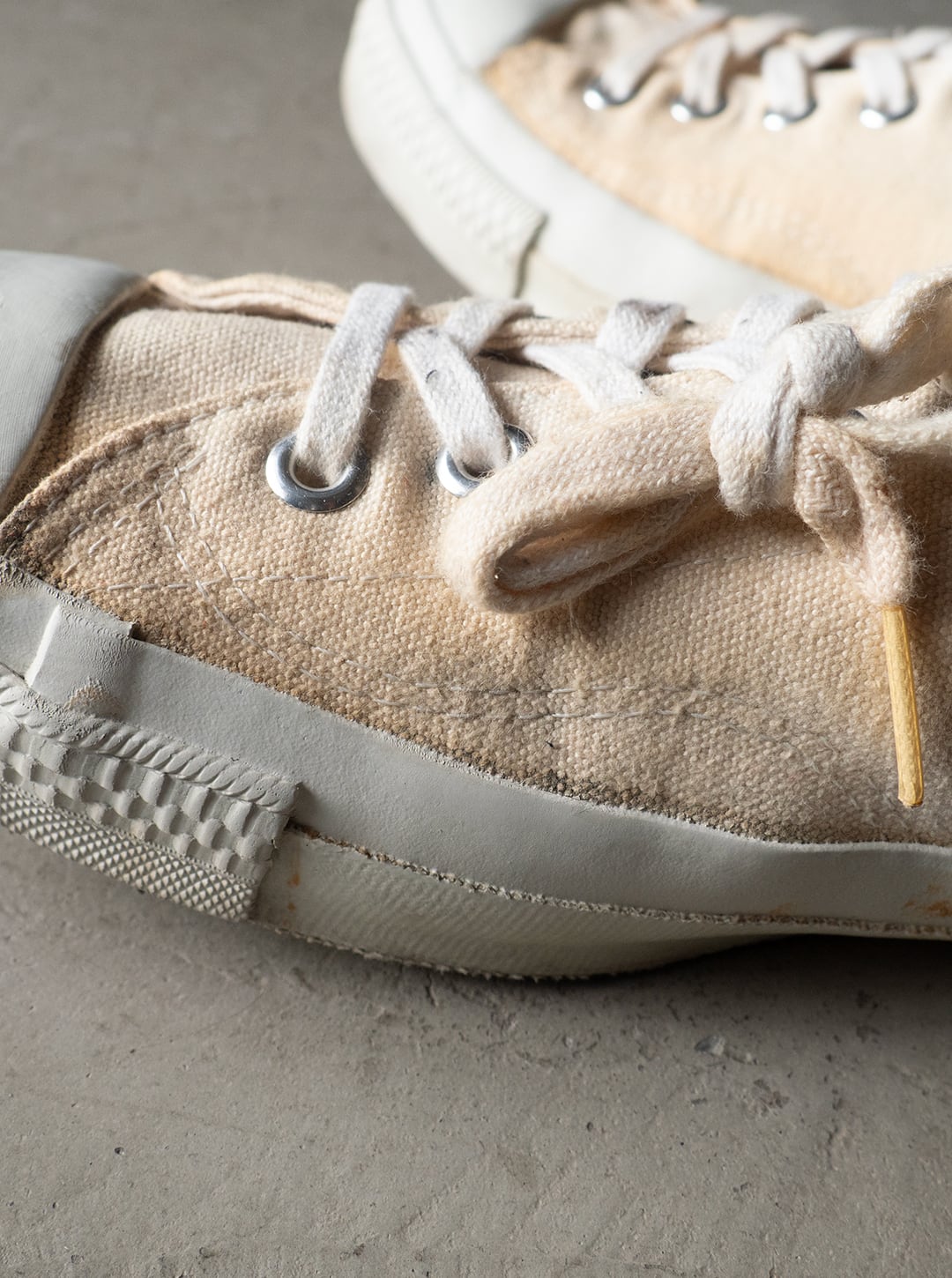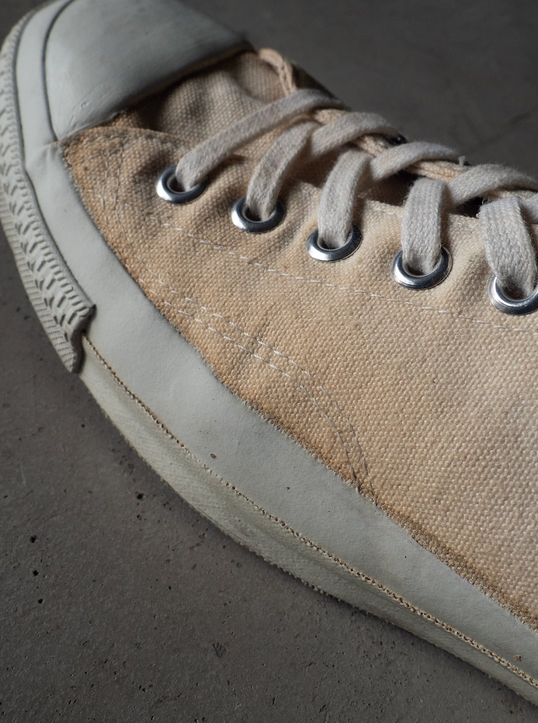 米陸軍のトレーニングシューズを請け負ってきた3社の一つがPF INDUSTRIES(ピーエフインダストリーズ)です。分厚い生成り色のコットンキャンバスを2枚仕立てでアッパーを構成。両サイドには当て布付きサイドステッチを入らせた、屈強な作り込みのシューズです。