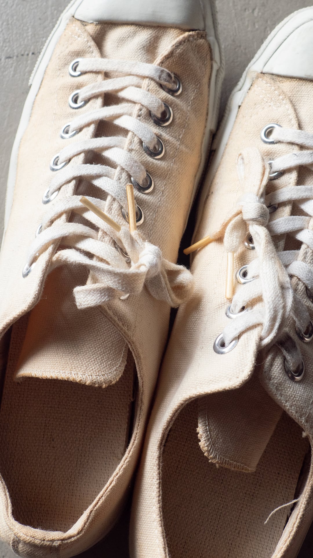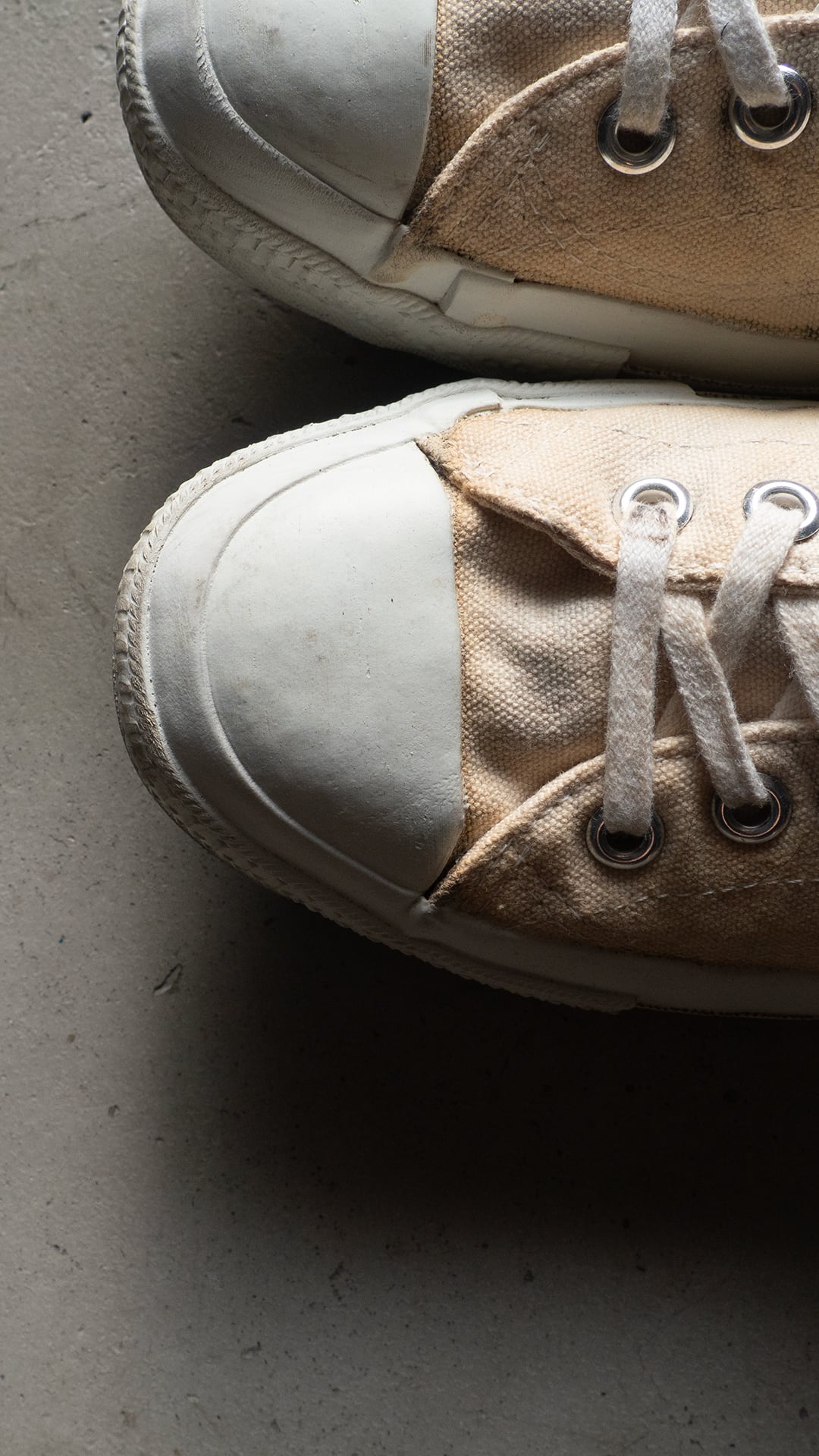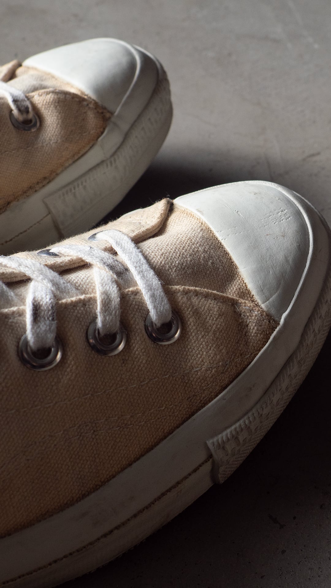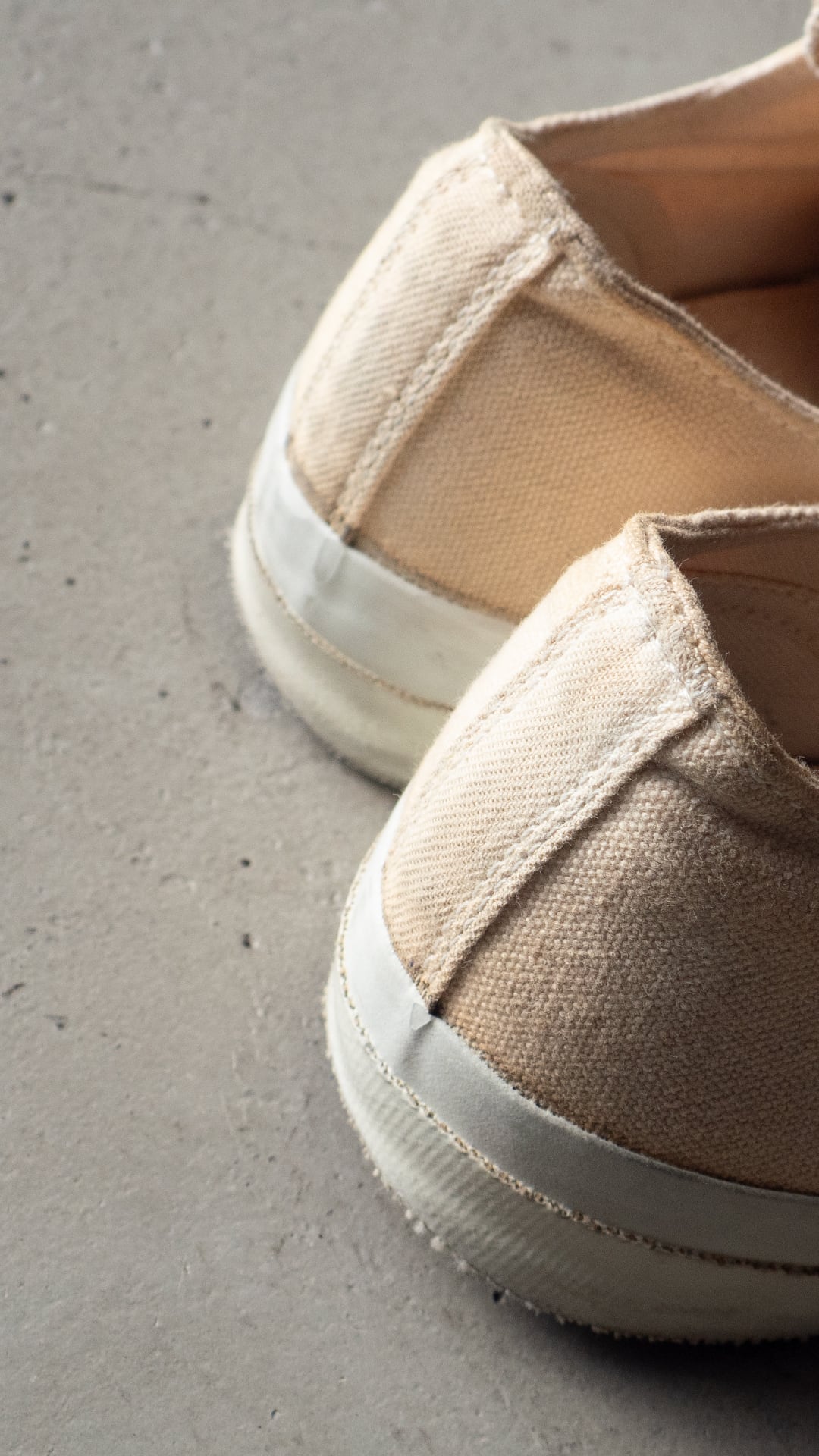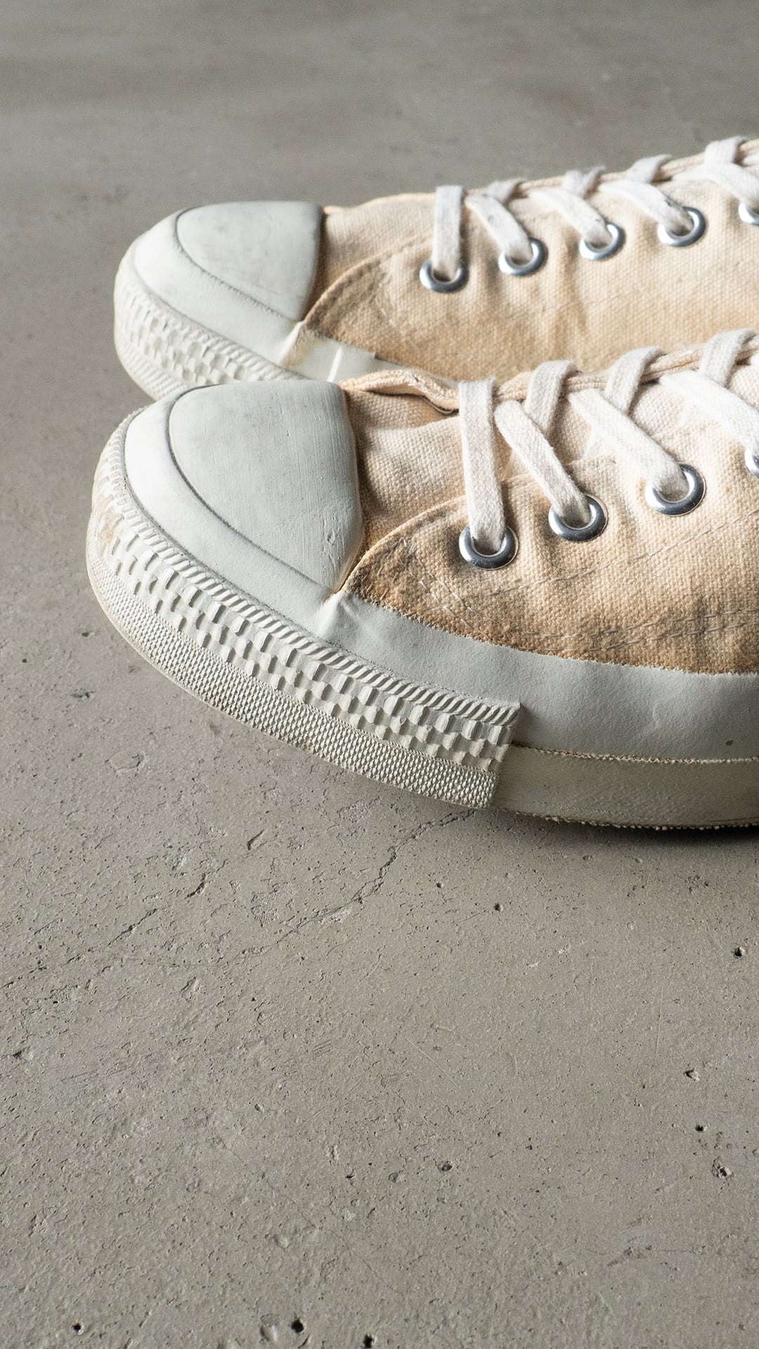 米陸軍のトレーニングシューズを請け負ってきた3社の一つがPF INDUSTRIES(ピーエフインダストリーズ)です。分厚い生成り色のコットンキャンバスを2枚仕立てでアッパーを構成。両サイドには当て布付きサイドステッチを入らせた、屈強な作り込みのシューズです。