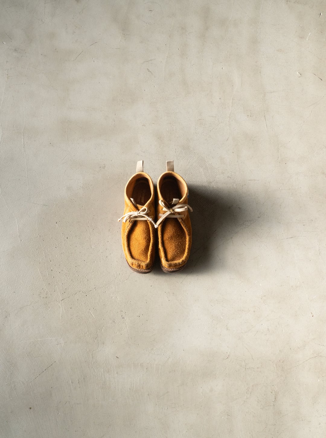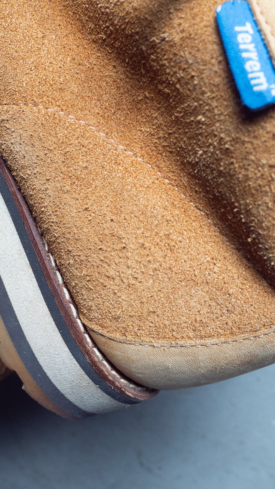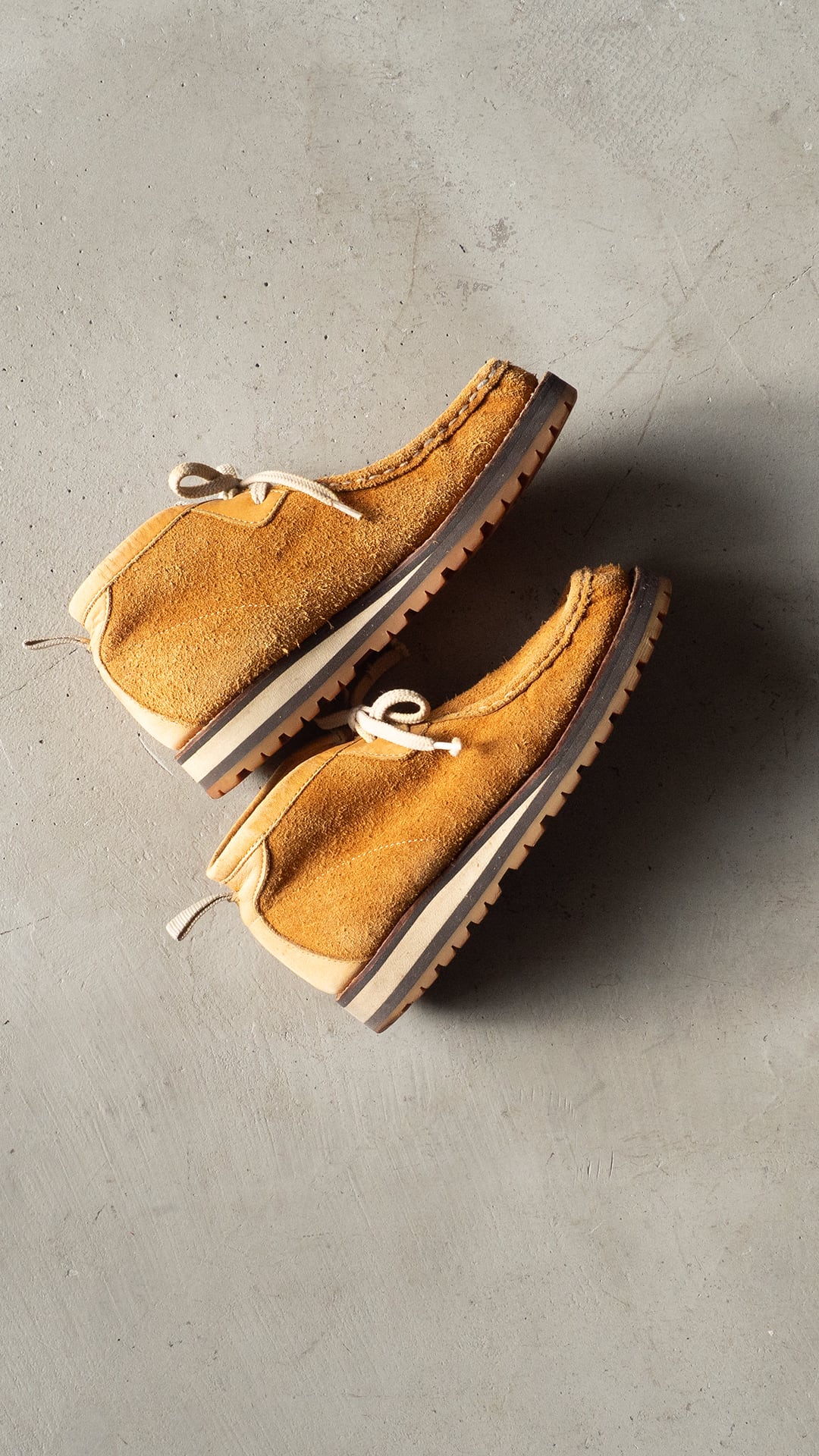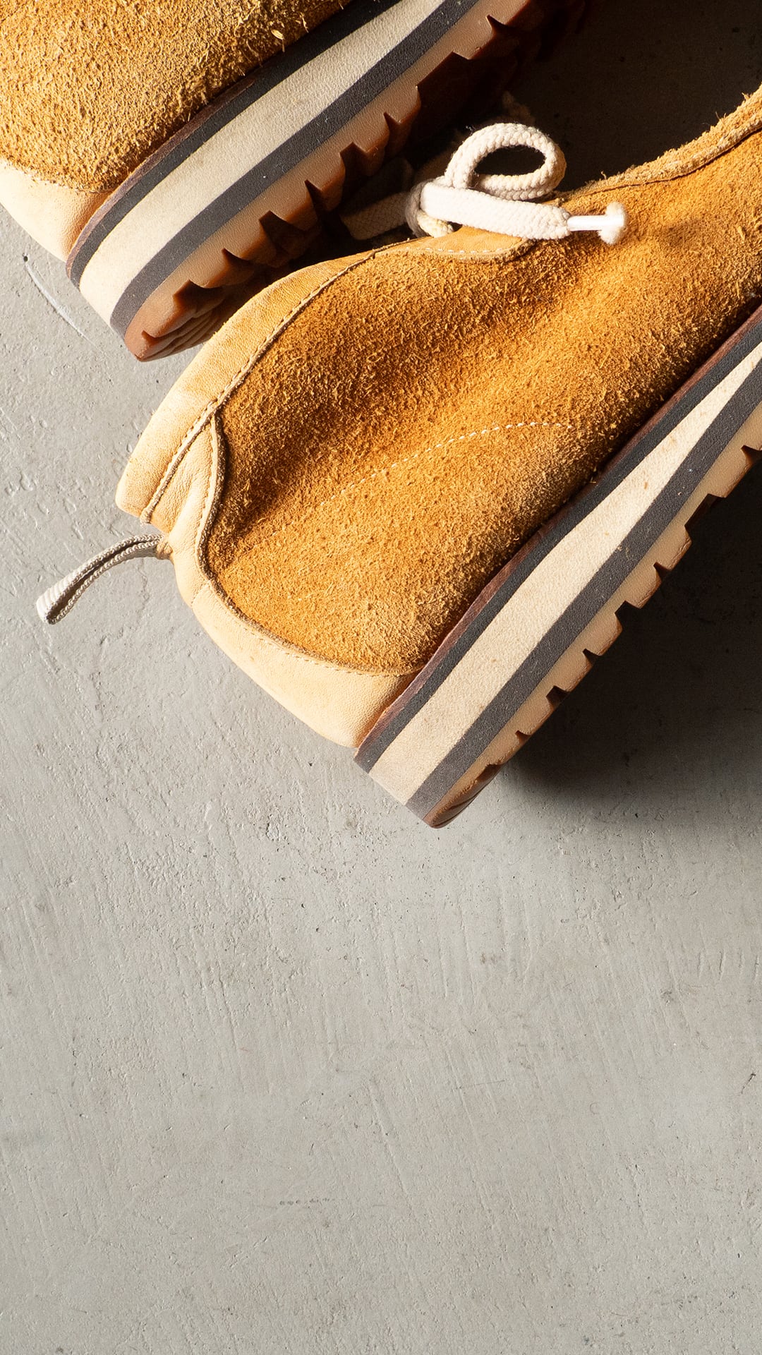 今回のシューズは、ワラビーを思わすアッパーに、クッション材をミッドに入れたビブラムソールを組み合わせた一足。アッパーはベロアとライニング共に天然革で構成。ヒールカップの芯材は硬くしっかりと踵をホールドする使用です。穿き口は堅牢で分厚い牛革を選んでおり、ステッチも太く屈強です。2ホールで、靴紐は伸縮のあるゴム入り、またインソールからシュータン裏にゴムが引いてあり、甲をホールドする仕様です。
