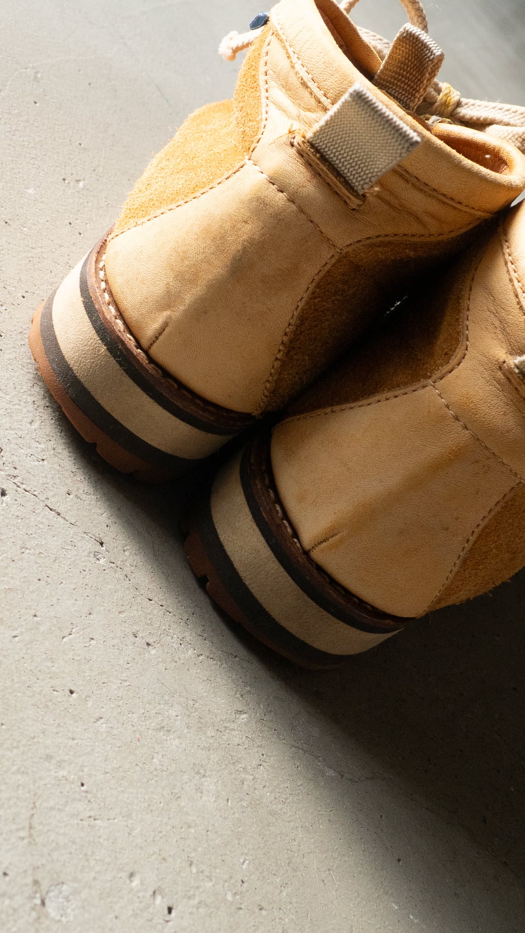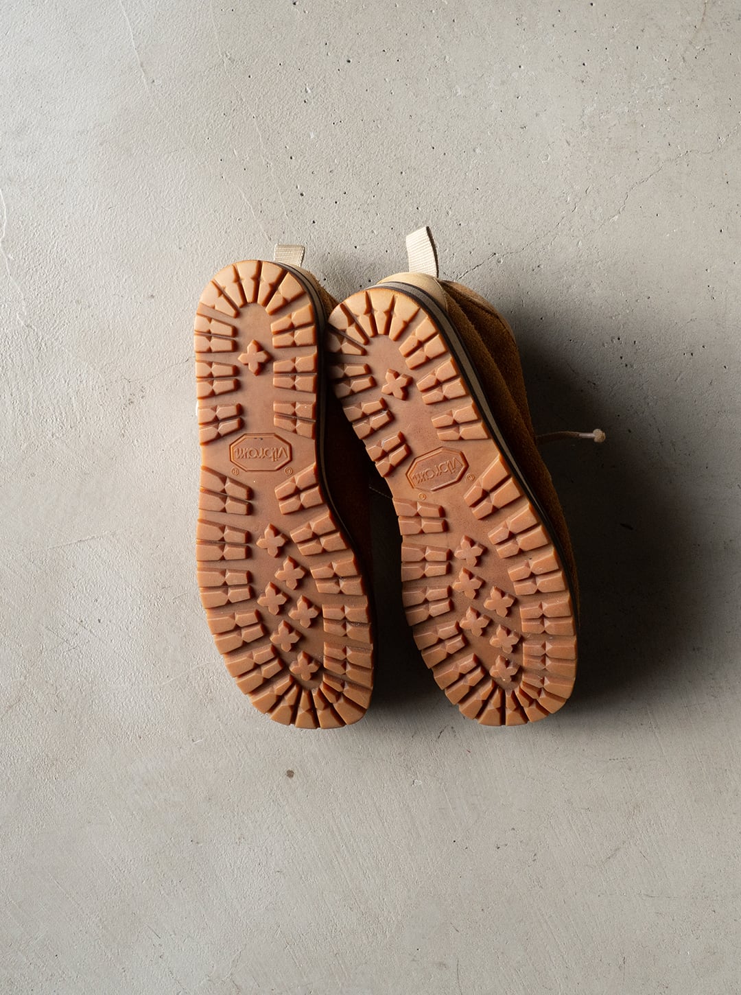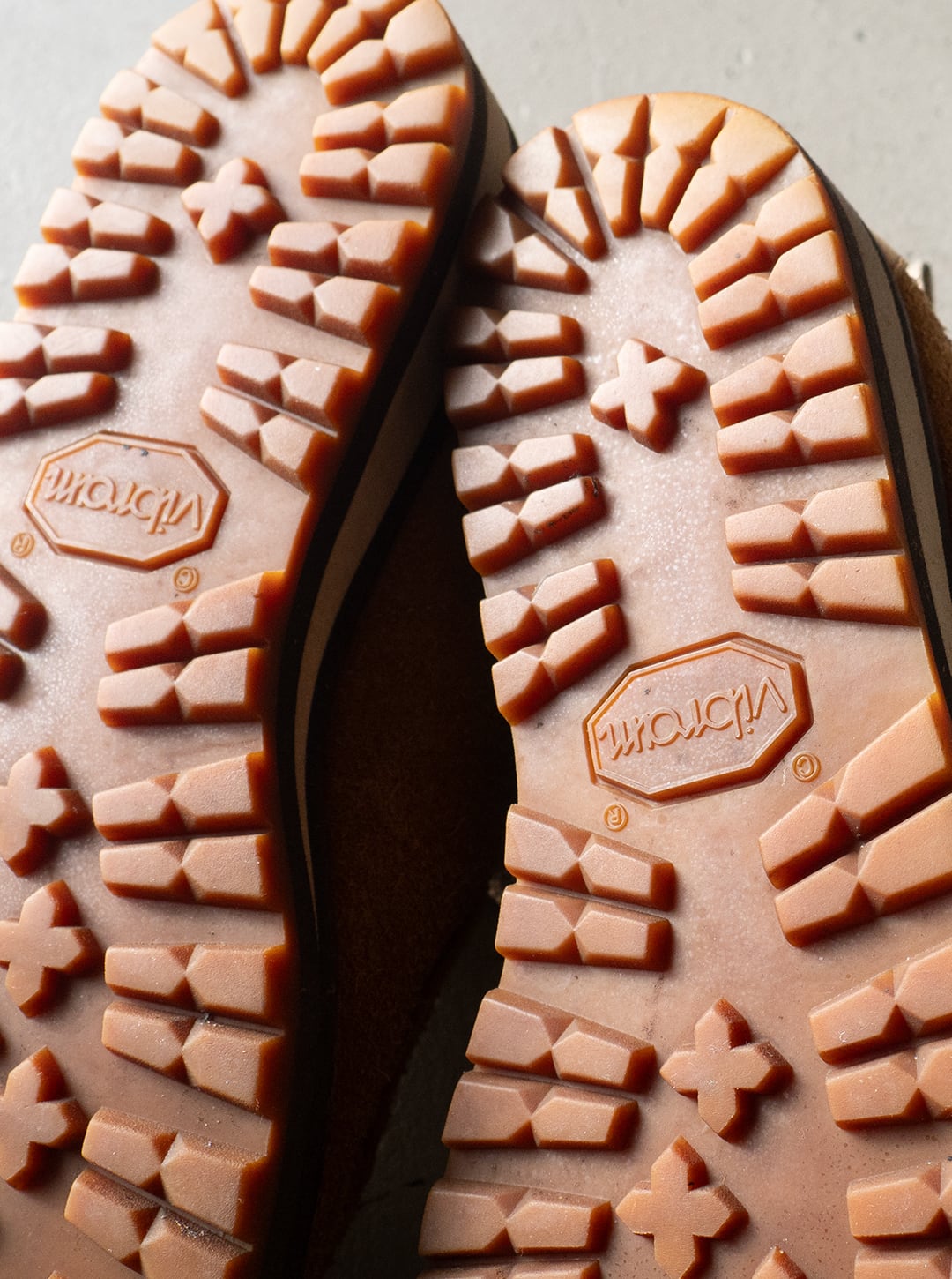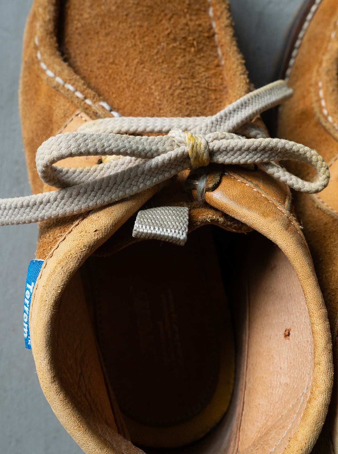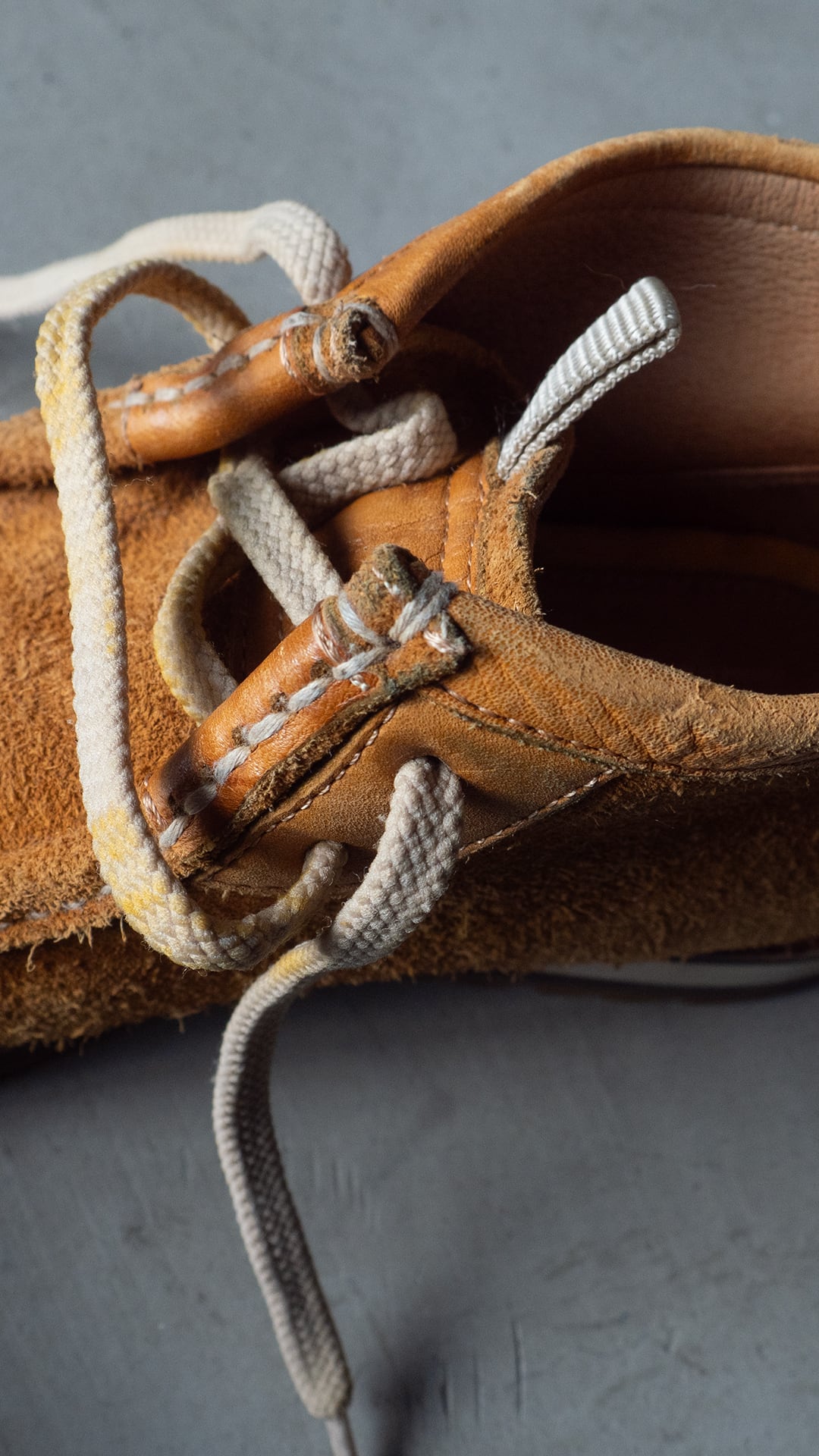今回のシューズは、ワラビーを思わすアッパーに、クッション材をミッドに入れたビブラムソールを組み合わせた一足。アッパーはベロアとライニング共に天然革で構成。ヒールカップの芯材は硬くしっかりと踵をホールドする使用です。穿き口は堅牢で分厚い牛革を選んでおり、ステッチも太く屈強です。2ホールで、靴紐は伸縮のあるゴム入り、またインソールからシュータン裏にゴムが引いてあり、甲をホールドする仕様です。
