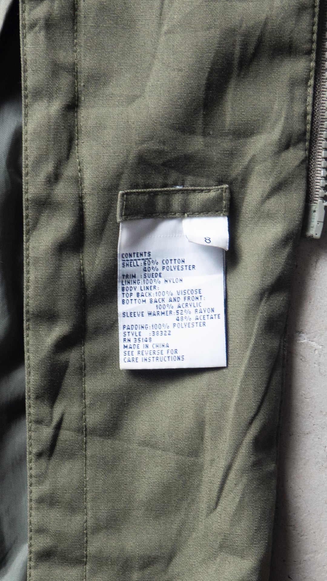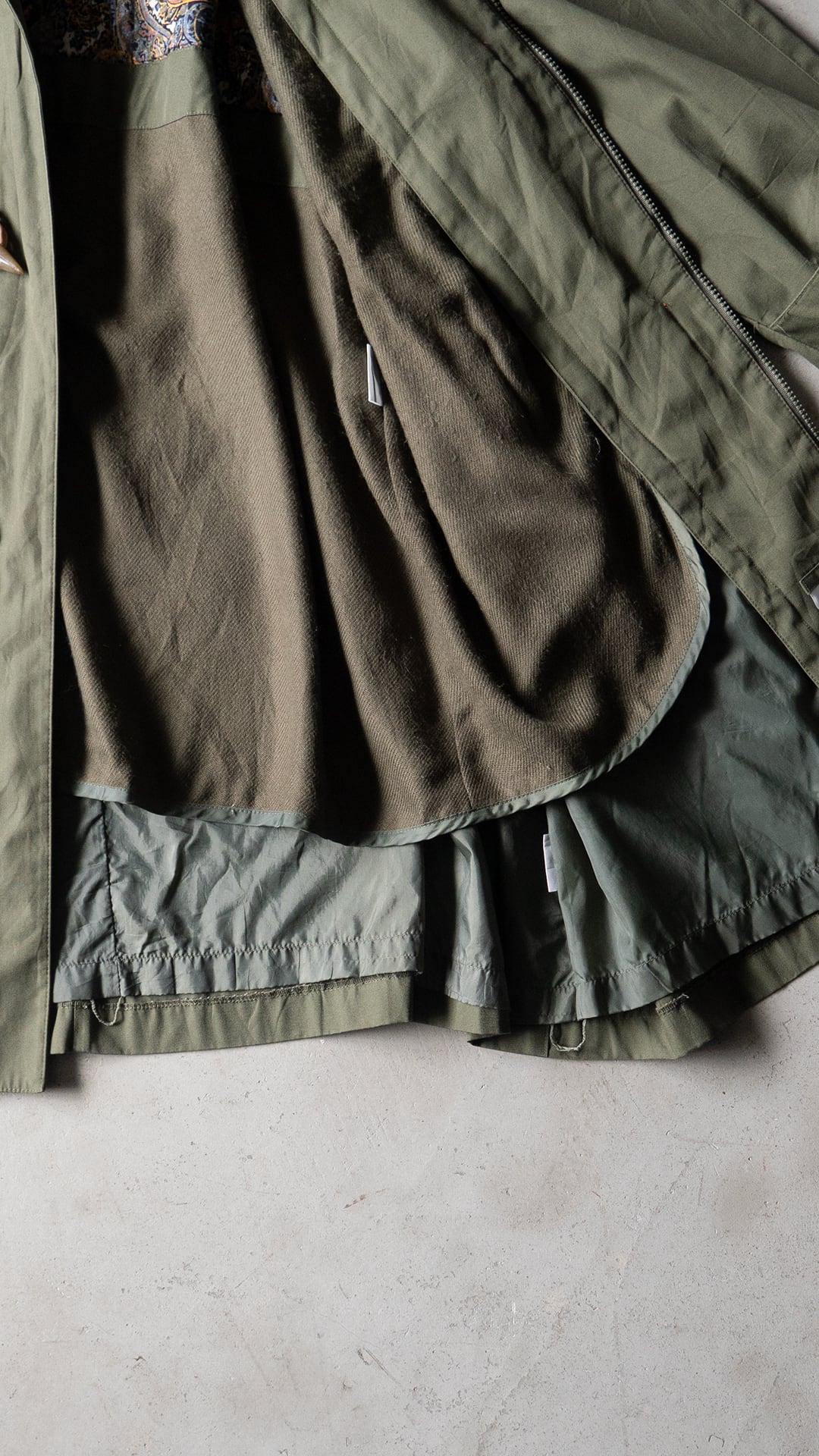今回の個体は、コットン60%ポリエステル40%を使用したカーキ色をシェルをメインファブリックに、フードも、ライナーの脱着可能なコートです。