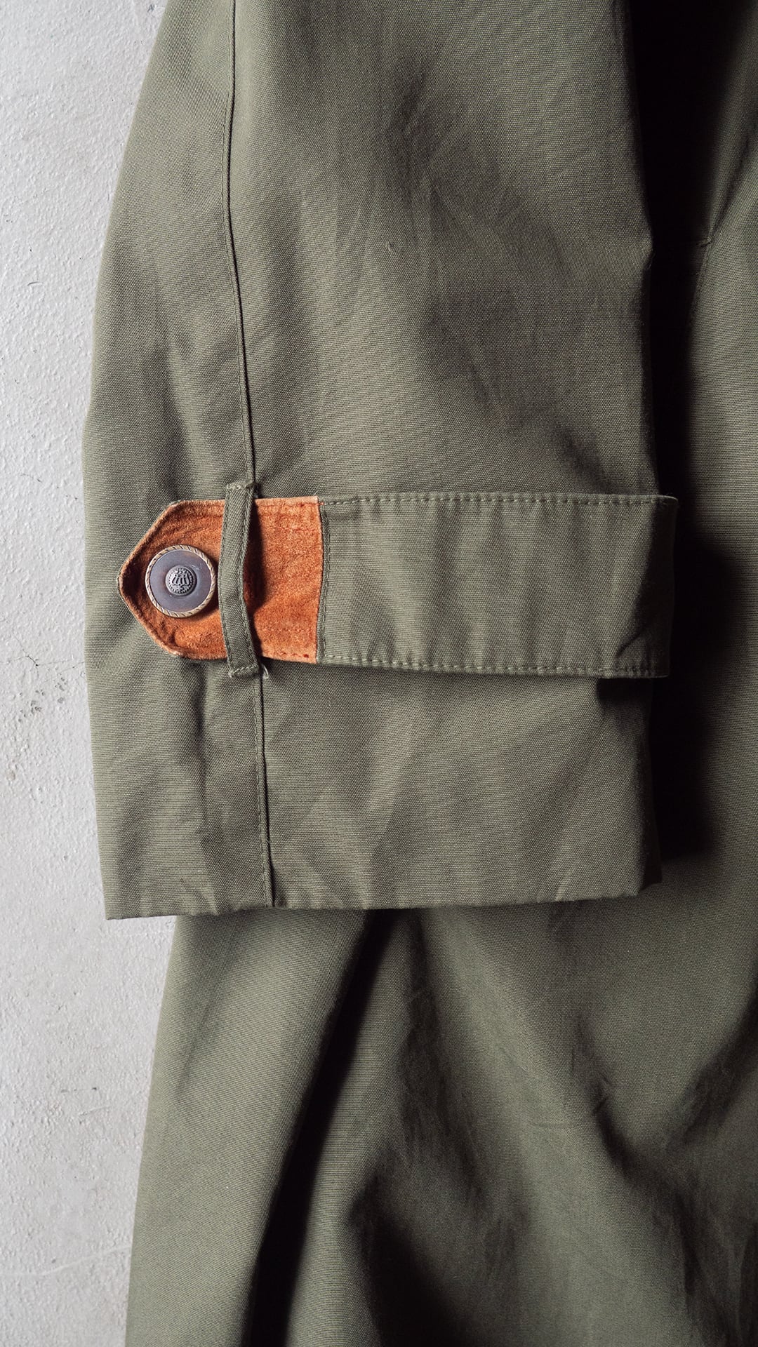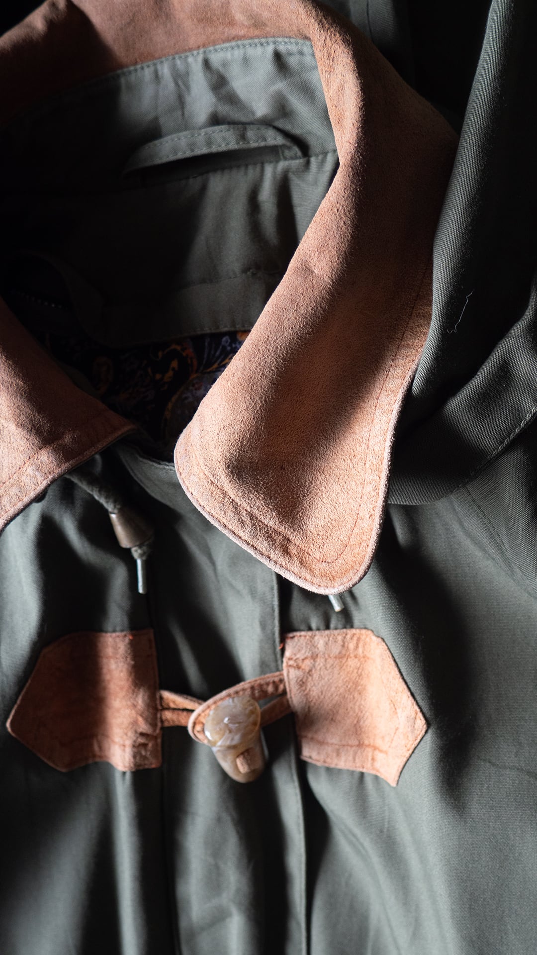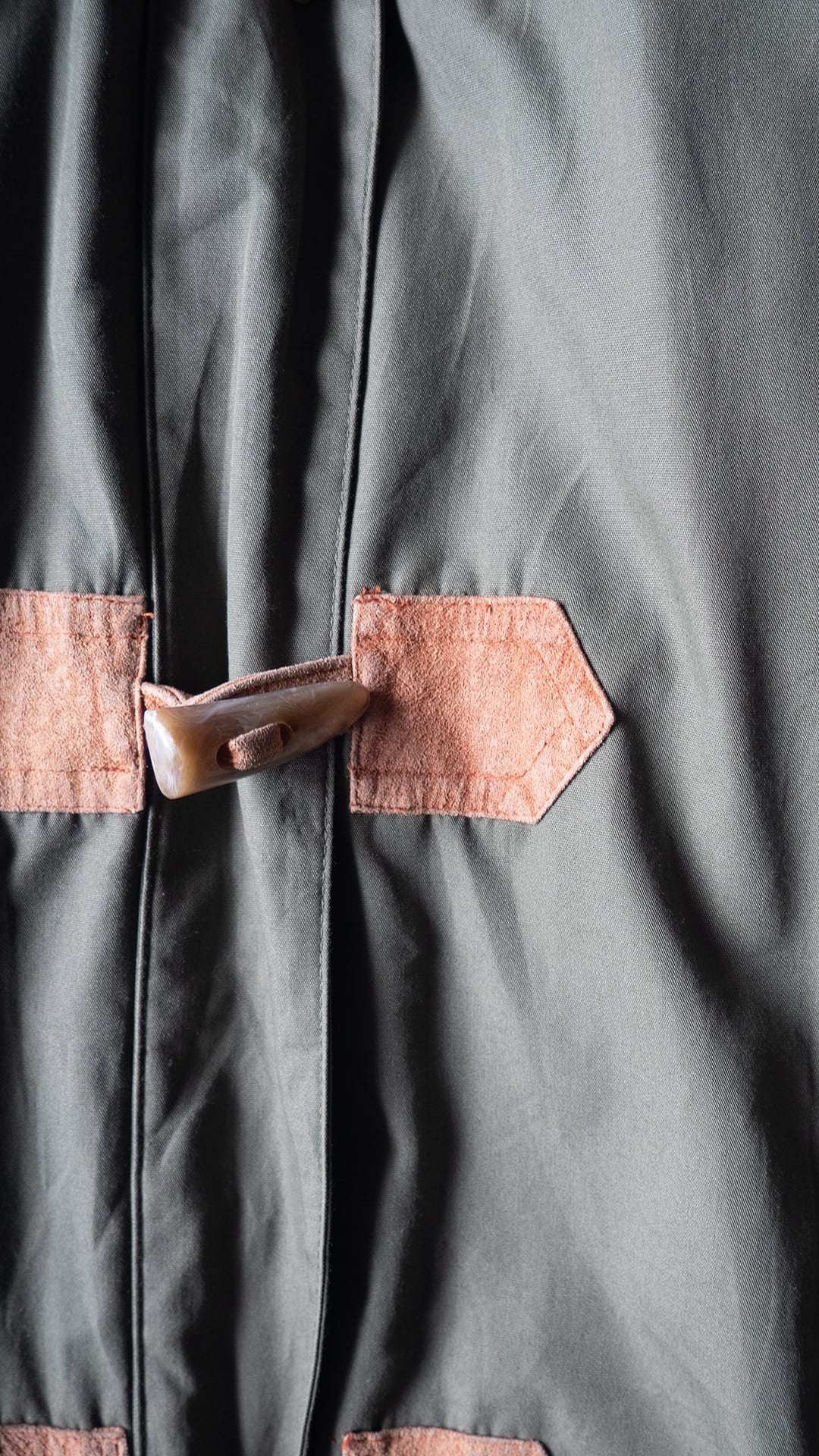 ジップとトグルボタンで開閉可能で、羽衿表とボタンベースに本革スウェードを用い切り替えているデザインが大変クールです。ジップフロントとトグルボタン開閉、フードはボタンにて接続します。ラグランスリーブですが、80-90年代のモデルらしく、やや盛り上がりのあるショルダーラインになります。