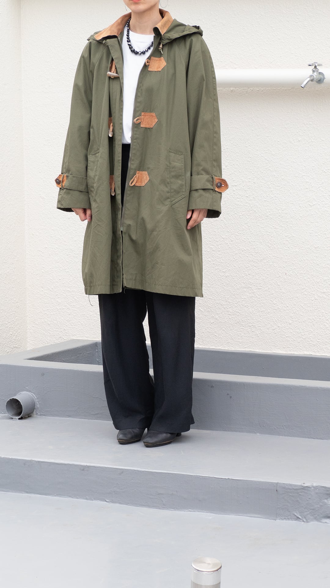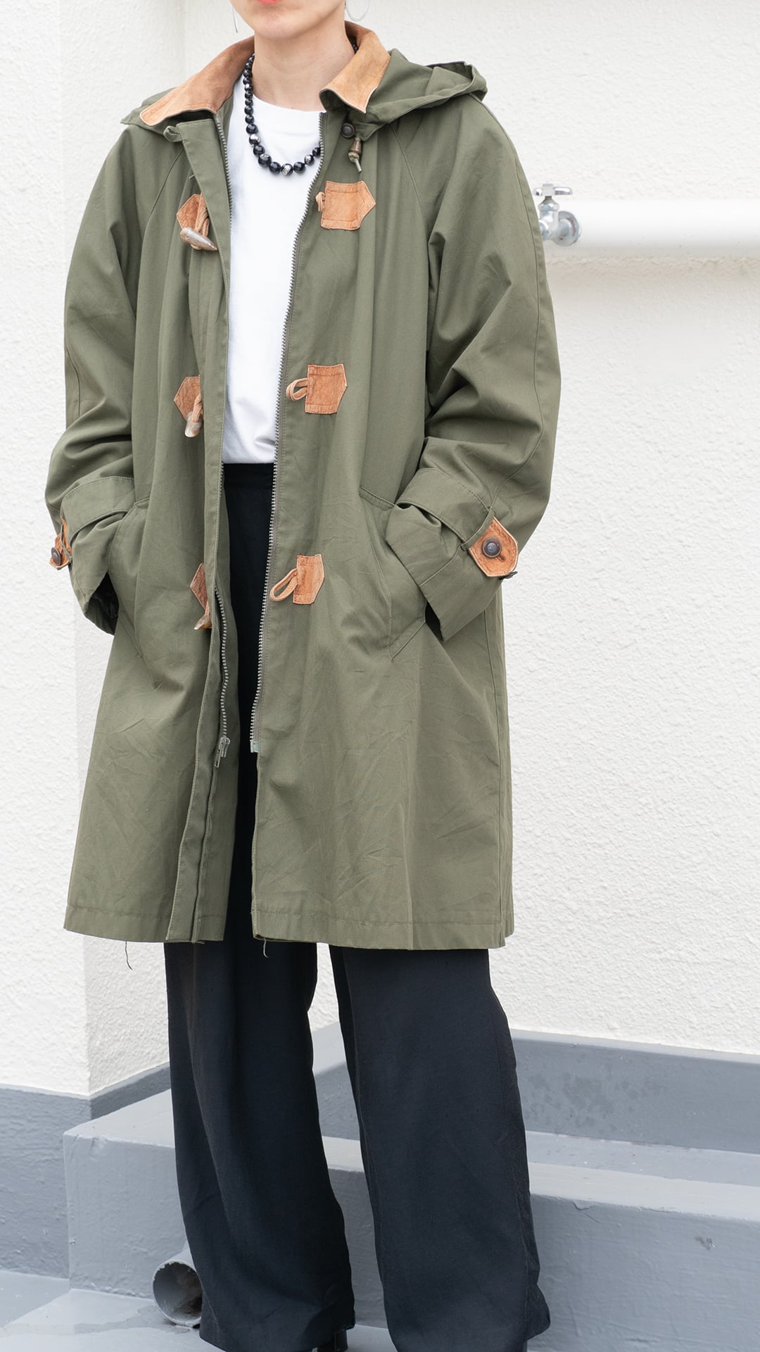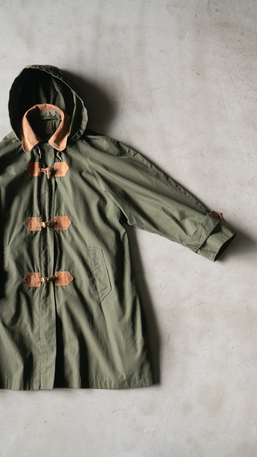 ジップとトグルボタンで開閉可能で、羽衿表とボタンベースに本革スウェードを用い切り替えているデザインが大変クールです。ジップフロントとトグルボタン開閉、フードはボタンにて接続します。ラグランスリーブですが、80-90年代のモデルらしく、やや盛り上がりのあるショルダーラインになります。