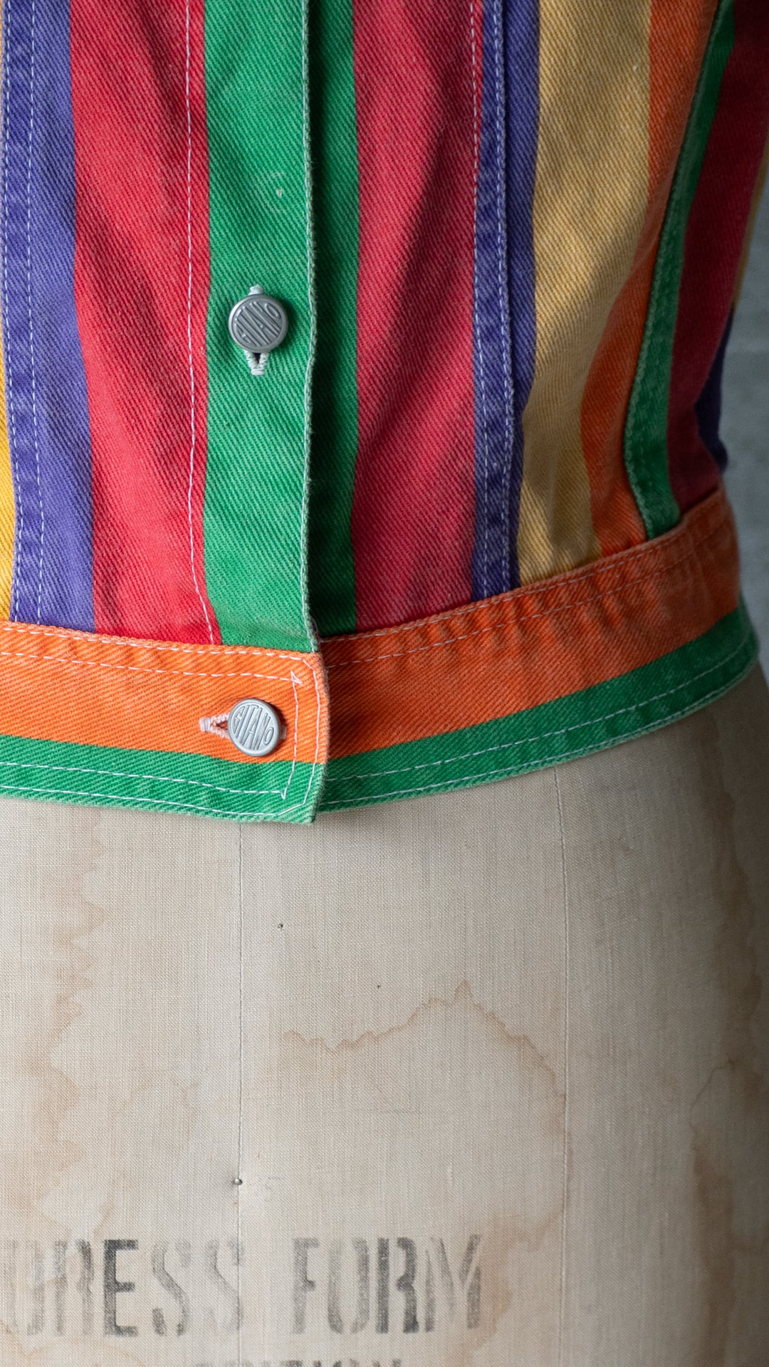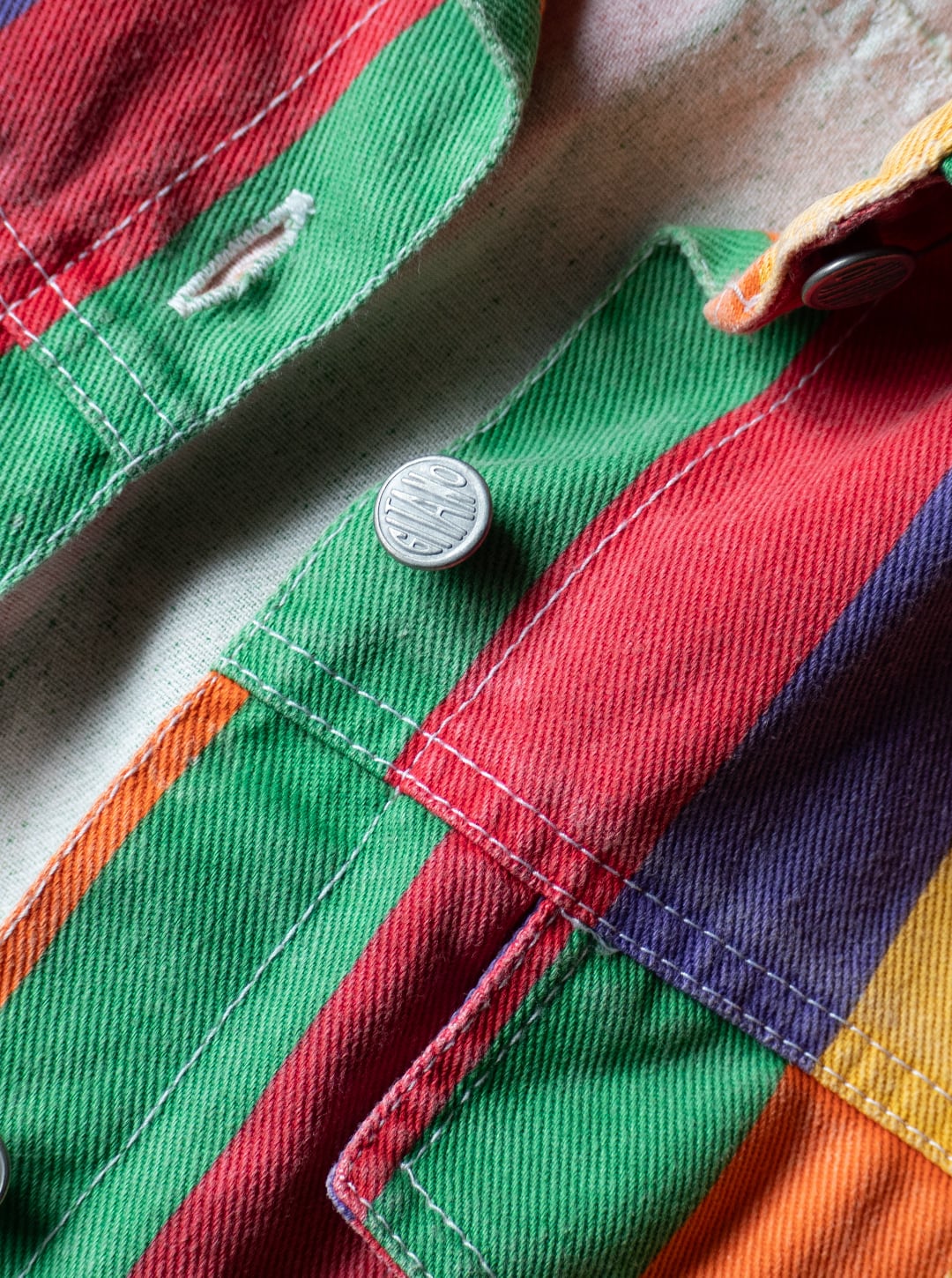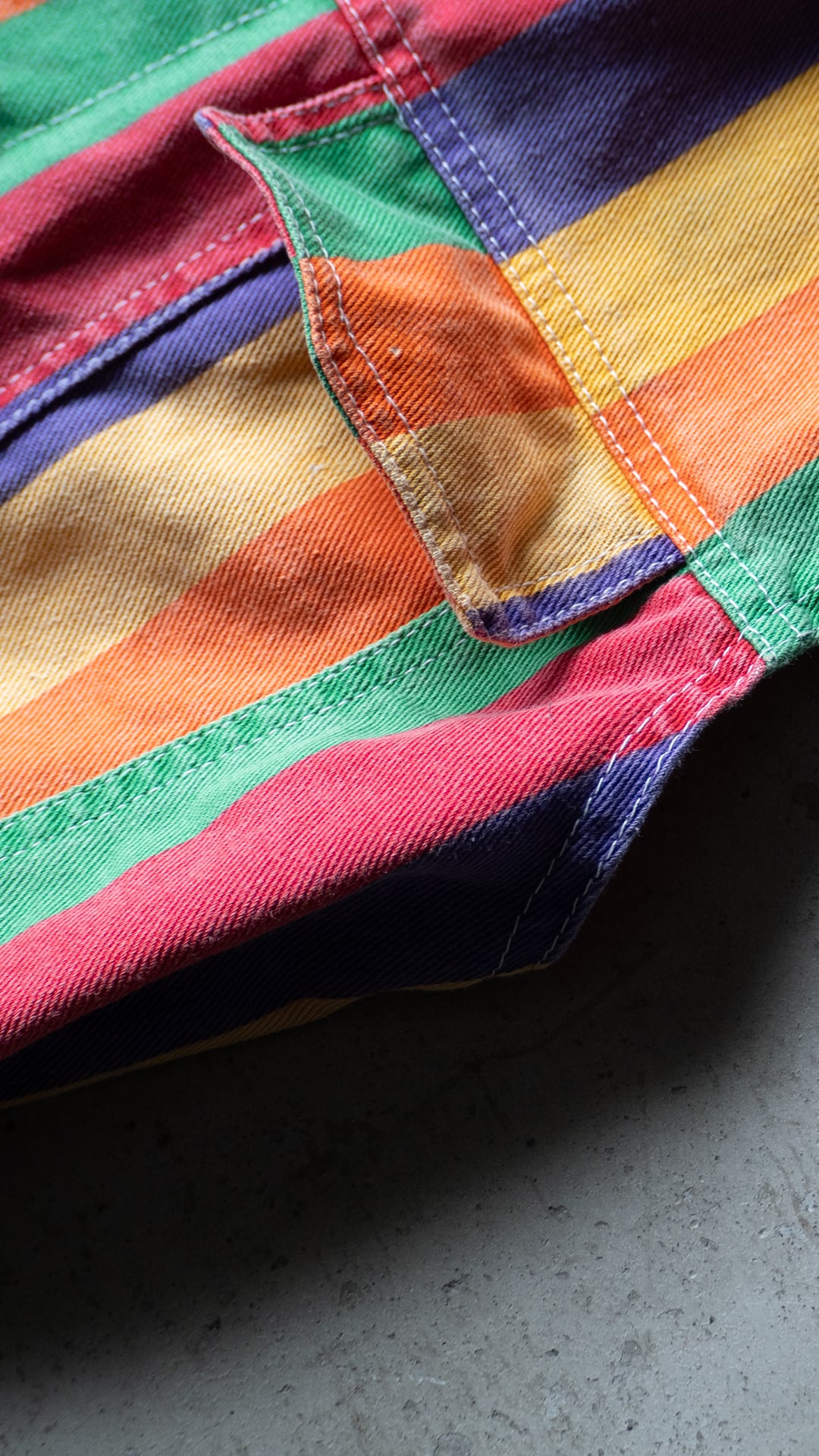 今回の個体は、ライトozデニムの面にプリントした生地を使用。グリーン・オレンジ・イエロー・パープル・レッドの5色を等ピッチでストライプ柄にしています。