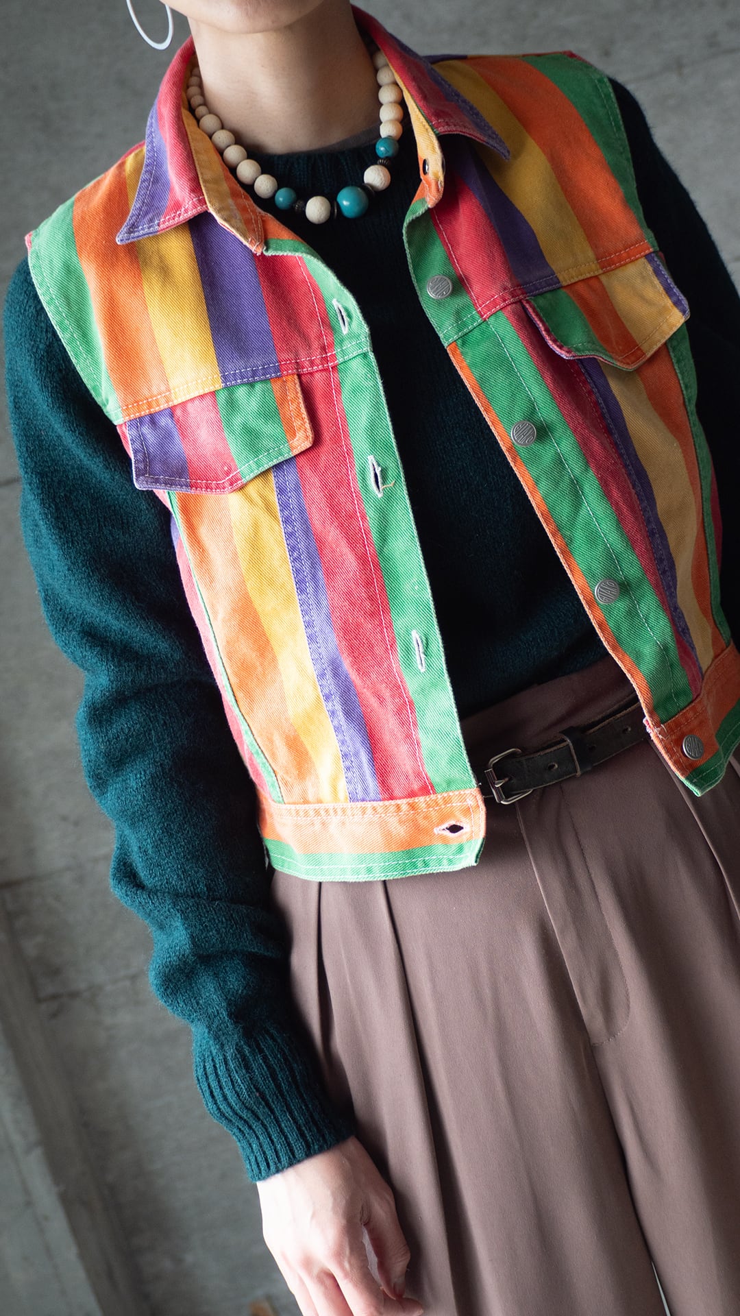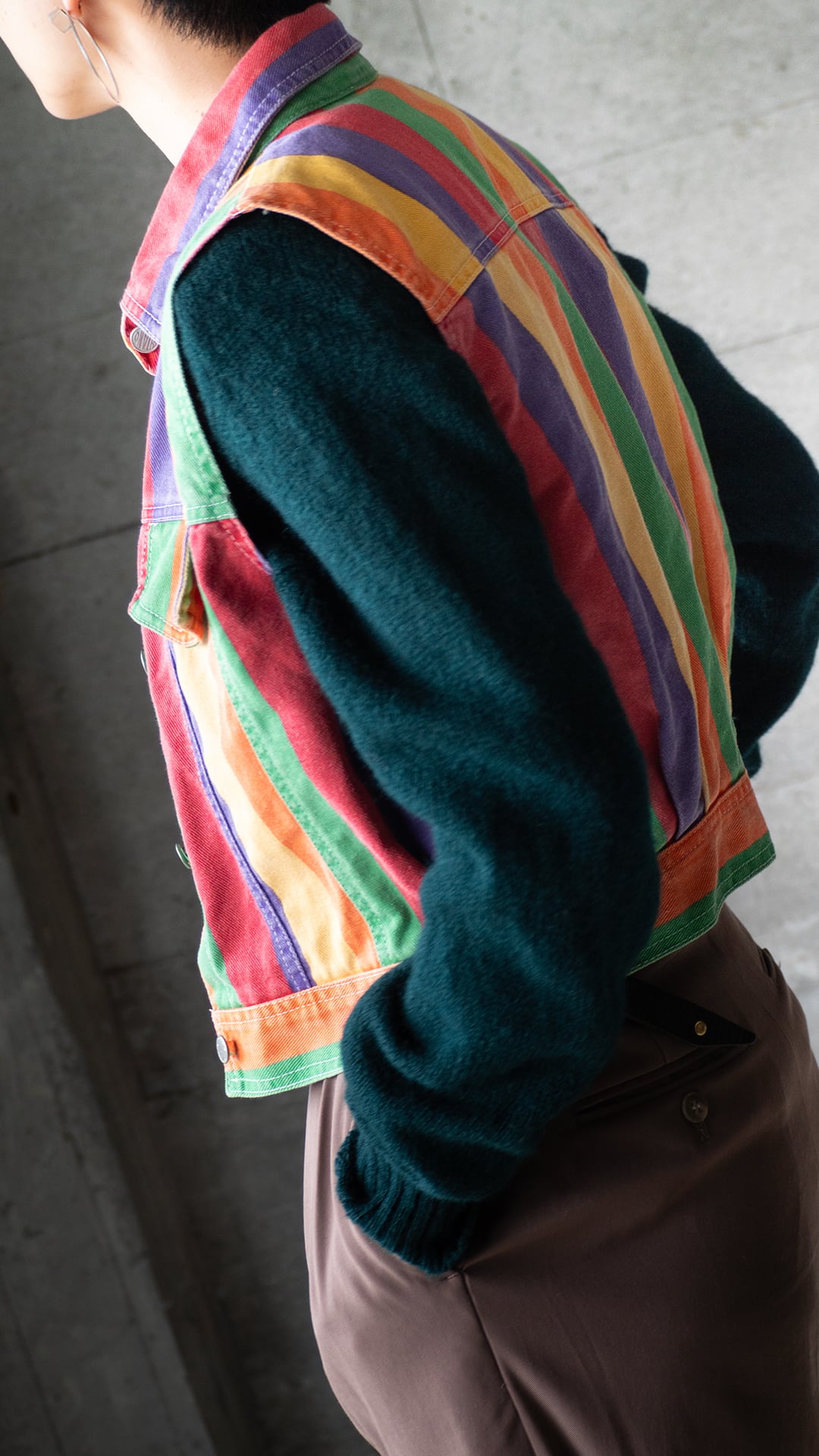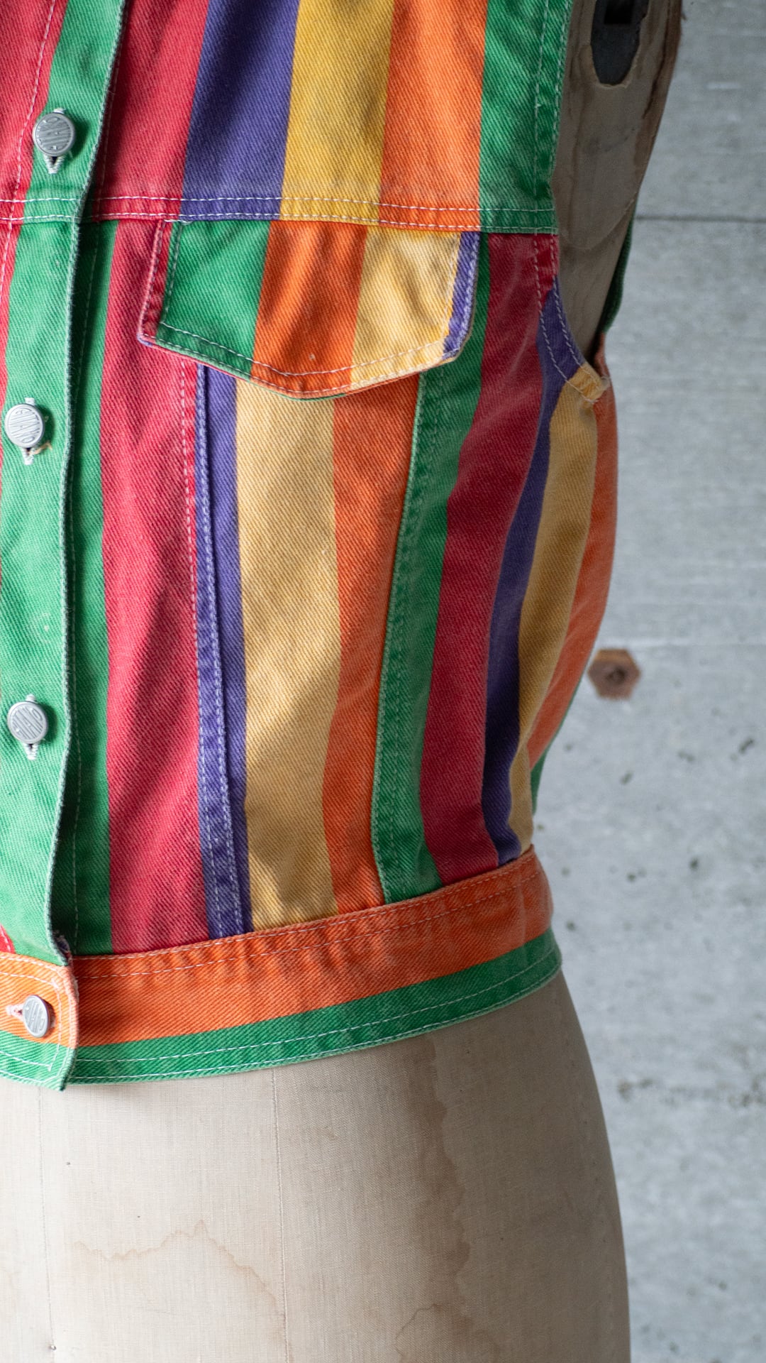 今回の個体は、ライトozデニムの面にプリントした生地を使用。グリーン・オレンジ・イエロー・パープル・レッドの5色を等ピッチでストライプ柄にしています。