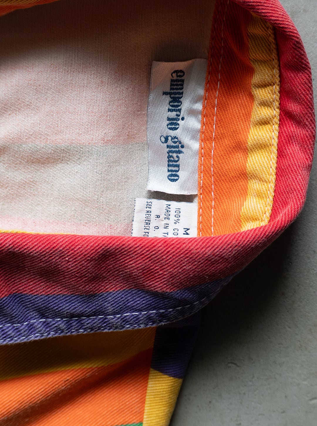 こちらは、推定90年代前半に作られた台湾製。Emporio Gitanoは、このような柄使い、派手なデザイン、プリントアイテムが主流のブランドで、古着市場では稀有ではあるものの80年代・90年代の個体が散見されます。